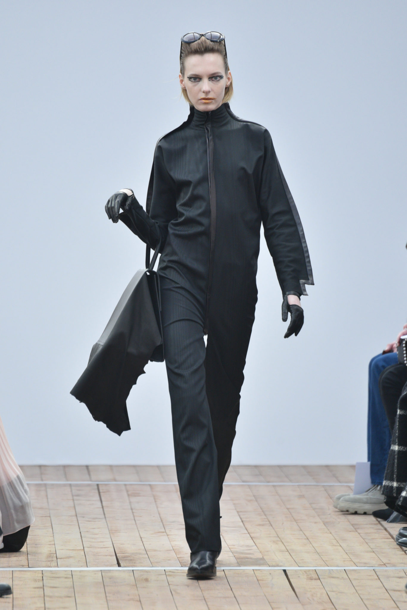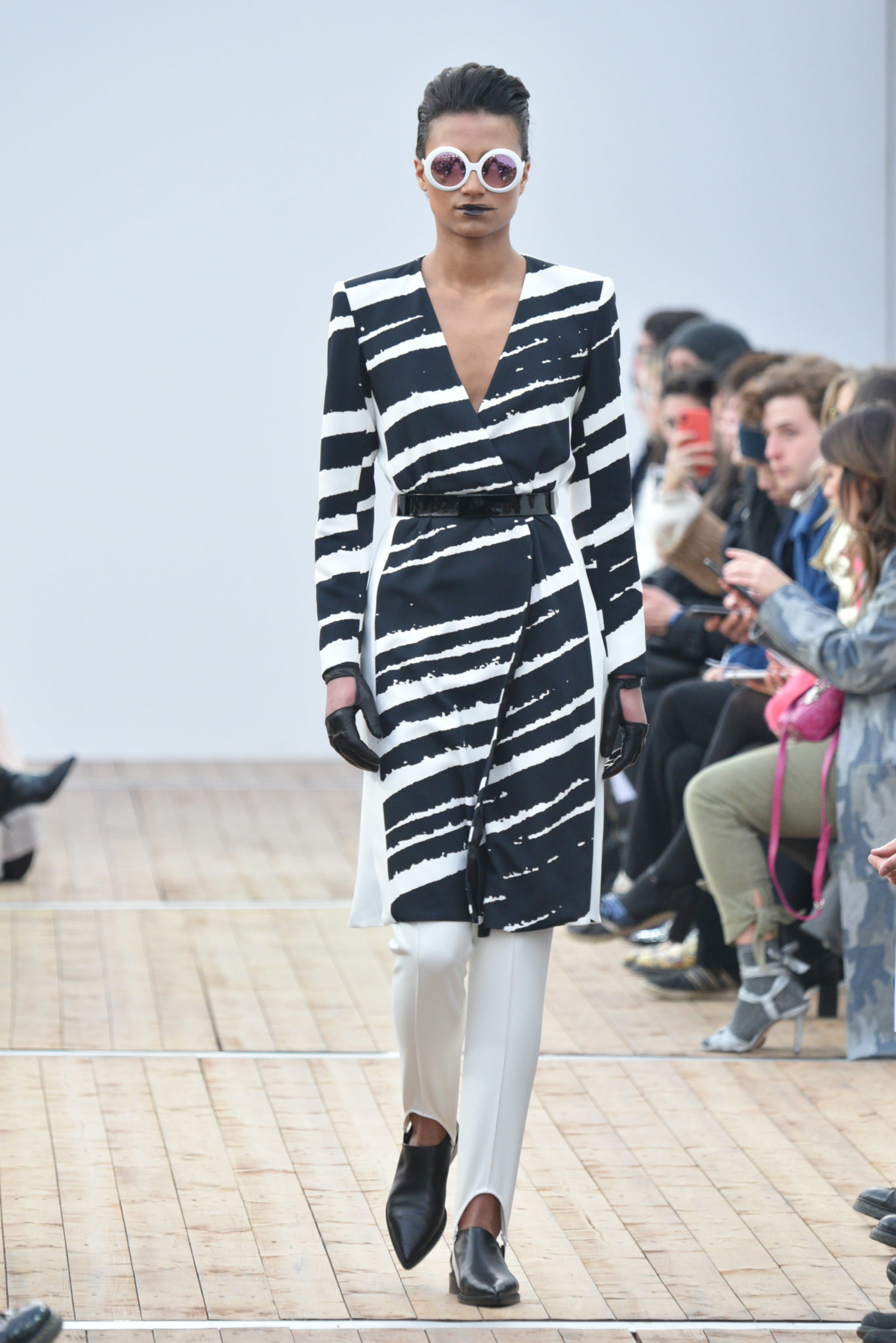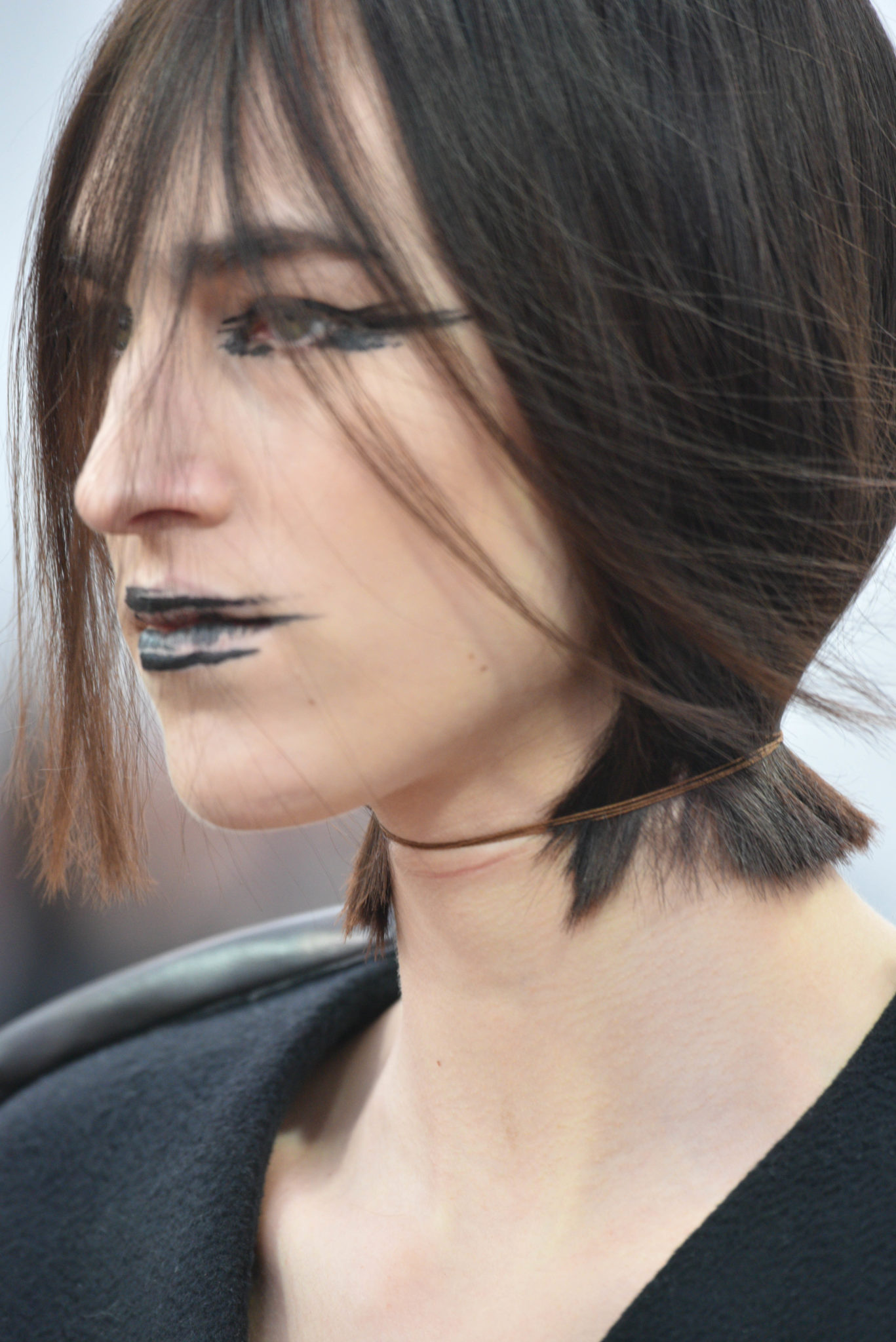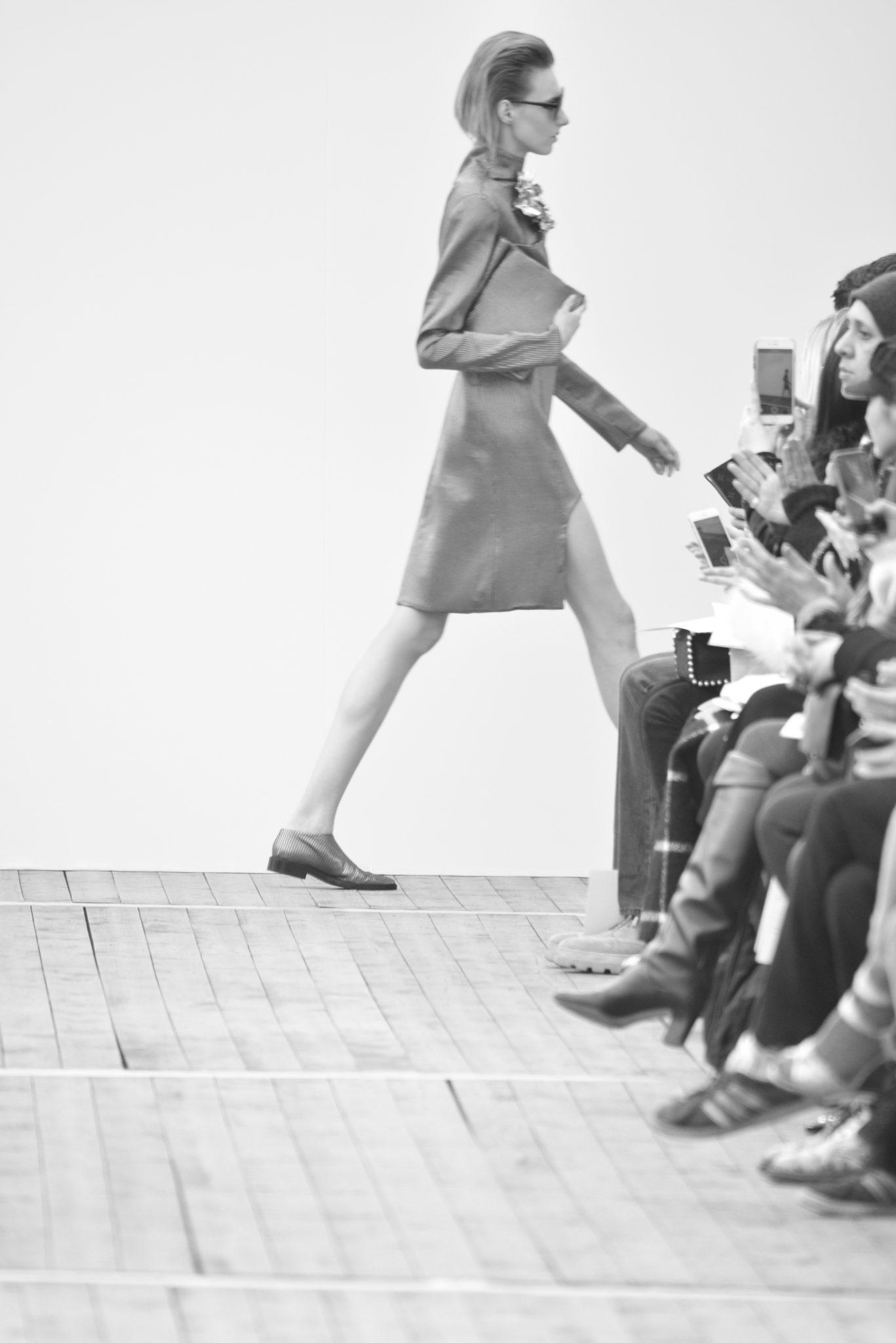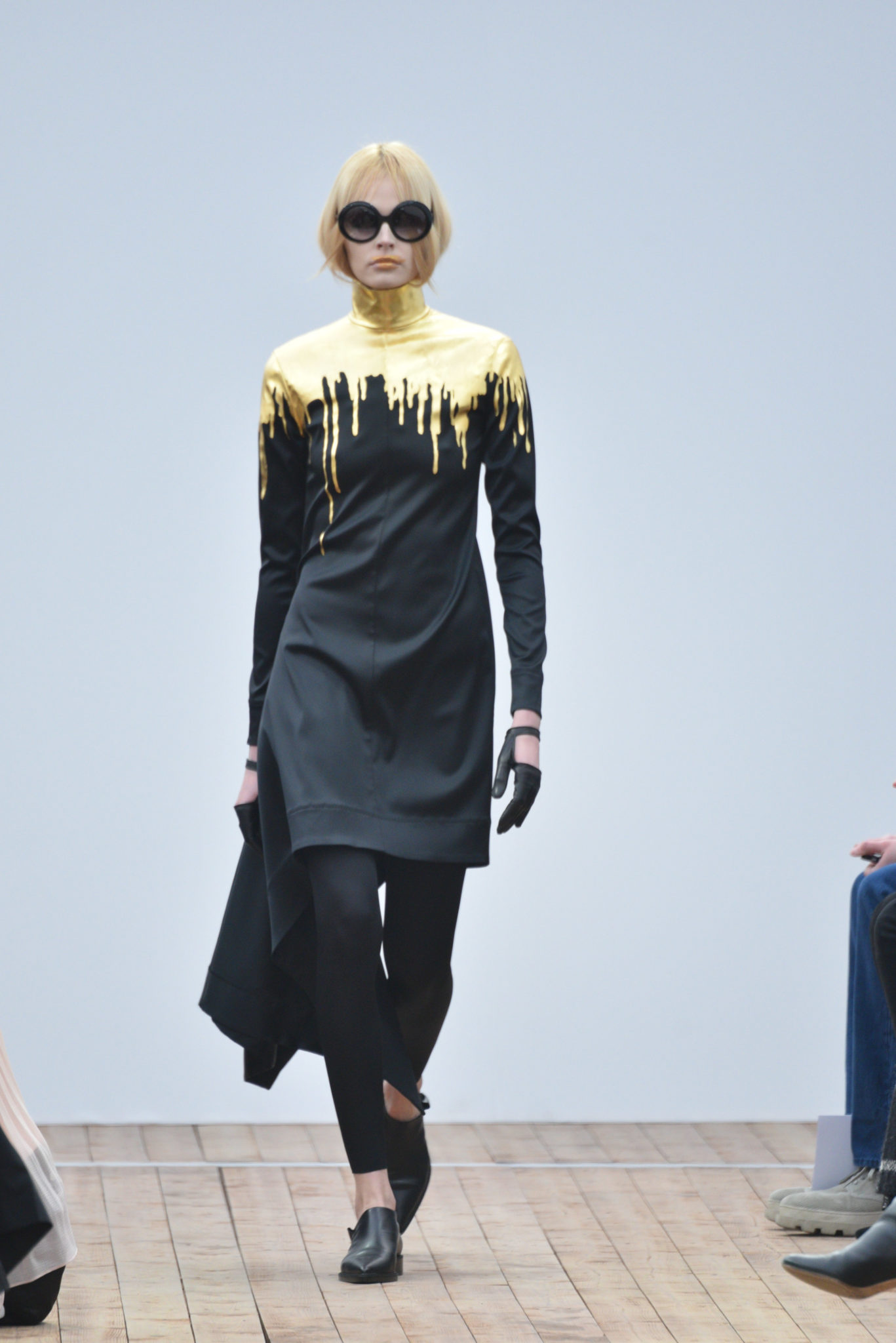Cachemire zibeline, jersey compact, crêpe stretch imprimé « esquisse », poil de laine, carton lamé, néoprène contrecollé, cuir, mousseline rayures métal, « luminati », ruban de soie, broderies inachevées de baguettes de métal sont les supports de cette collection.