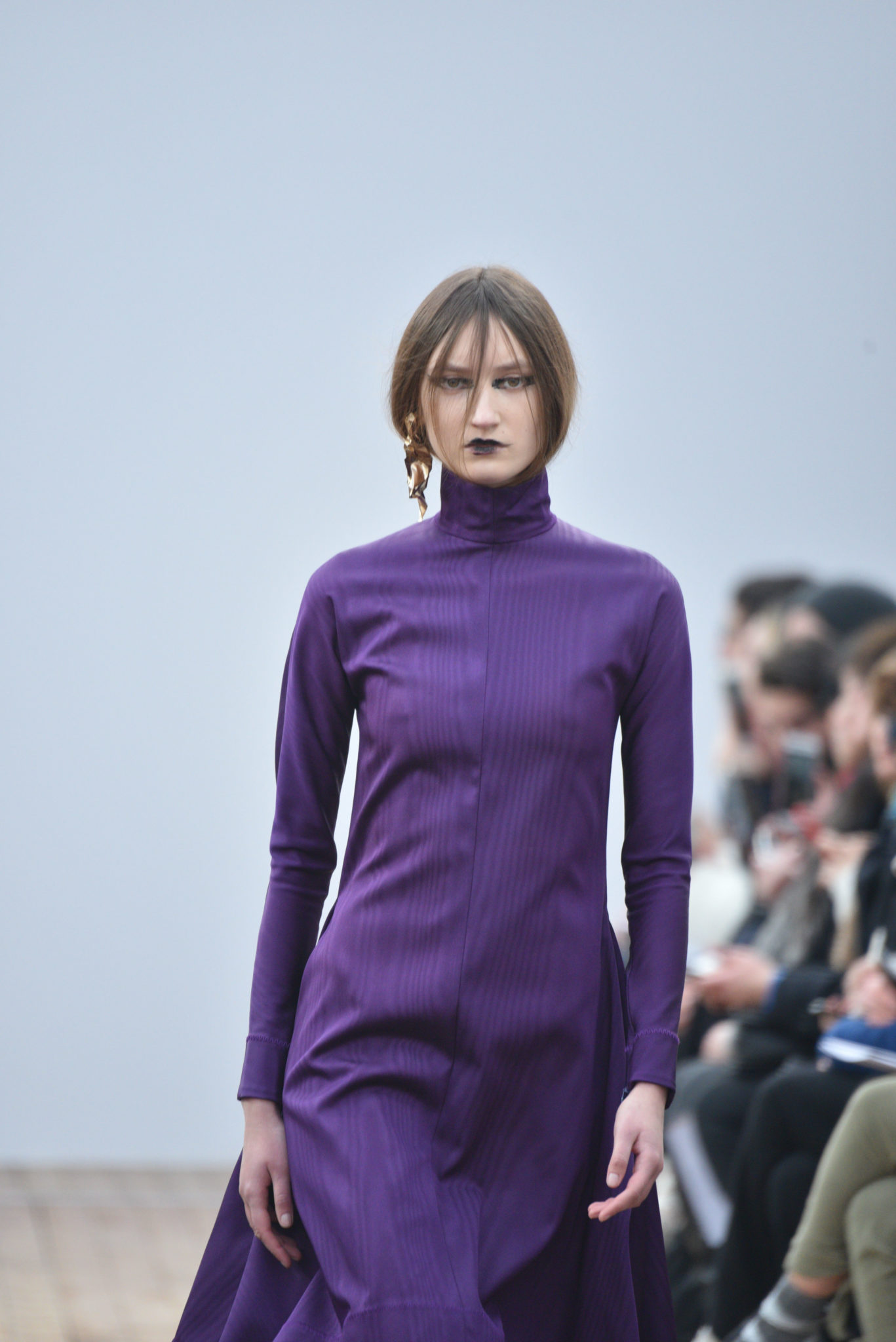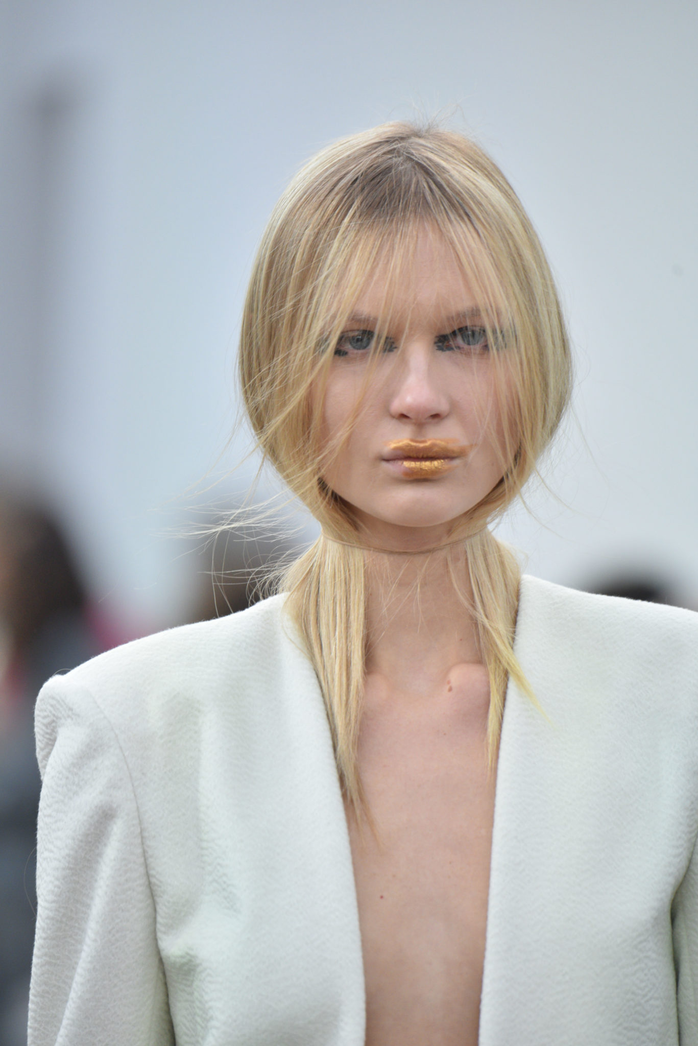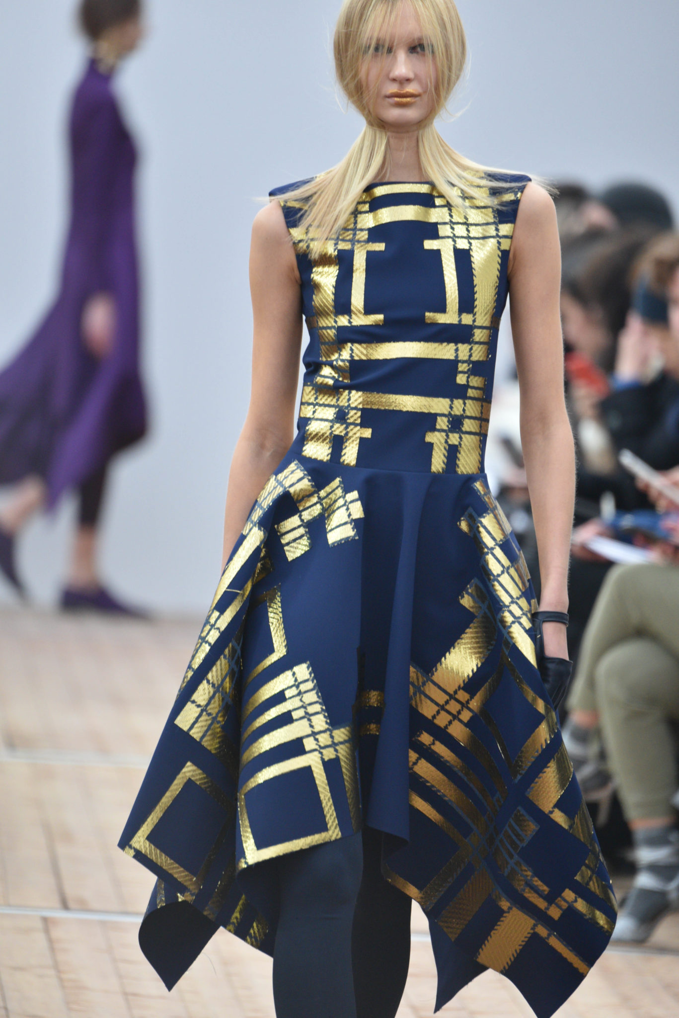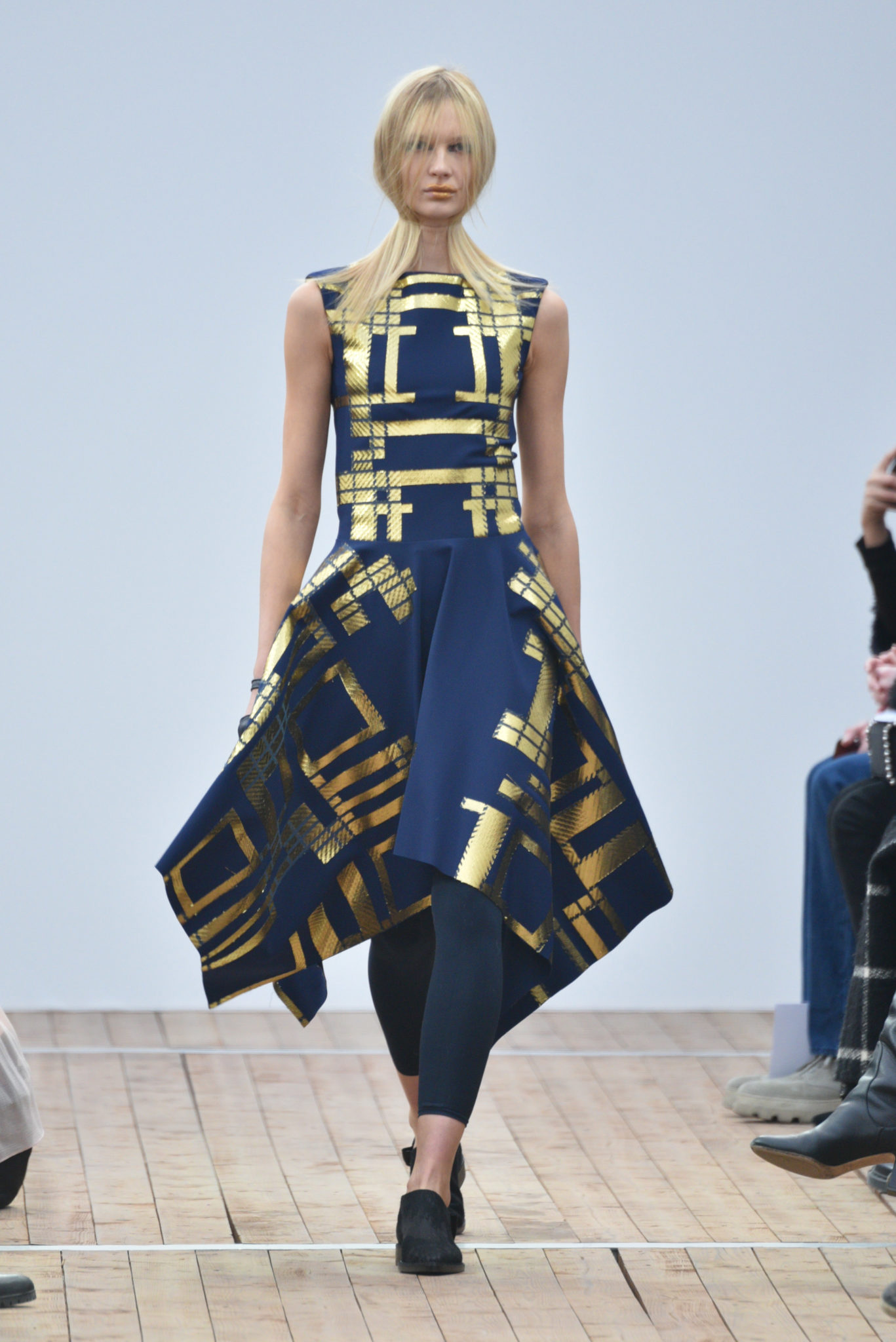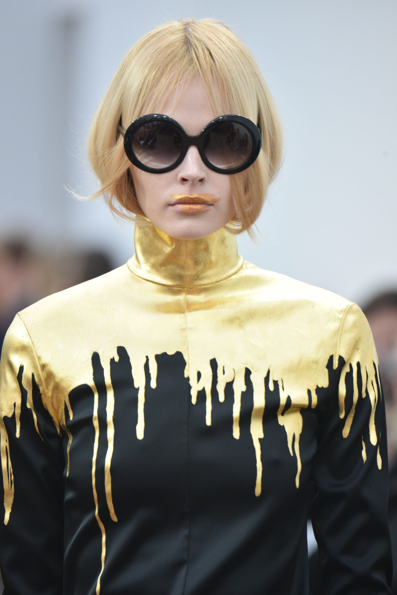 Cachemire zibeline, jersey compact, crêpe stretch imprimé « esquisse », poil de laine, carton lamé, néoprène contrecollé, cuir, mousseline rayures métal, « luminati », ruban de soie, broderies inachevées de baguettes de métal sont les supports de cette collection.