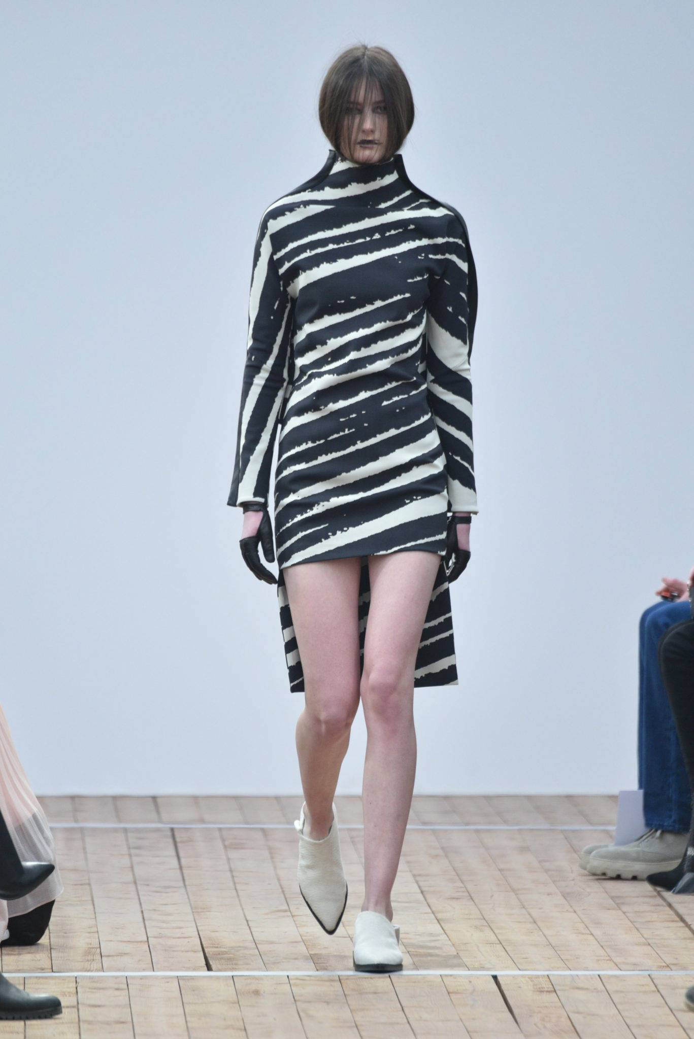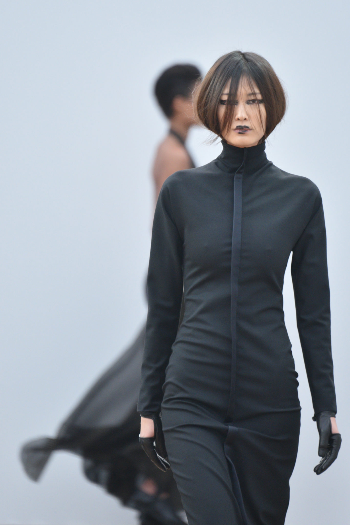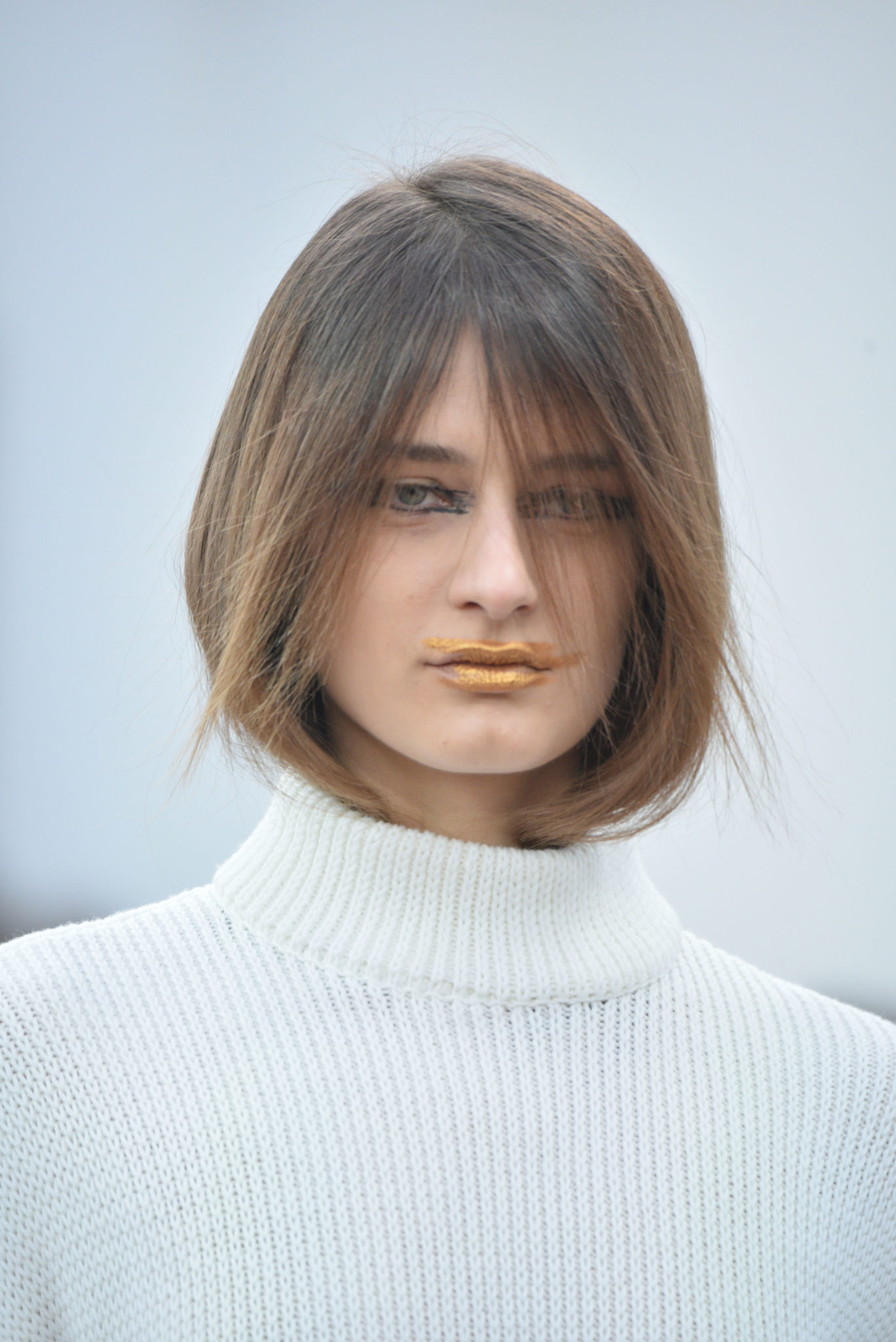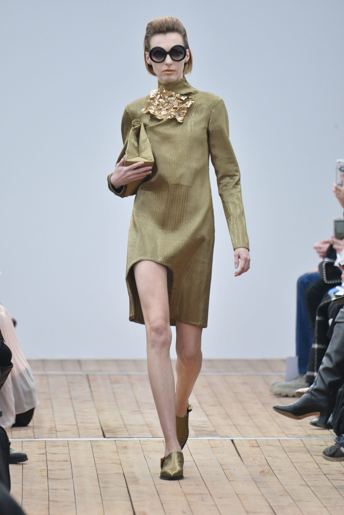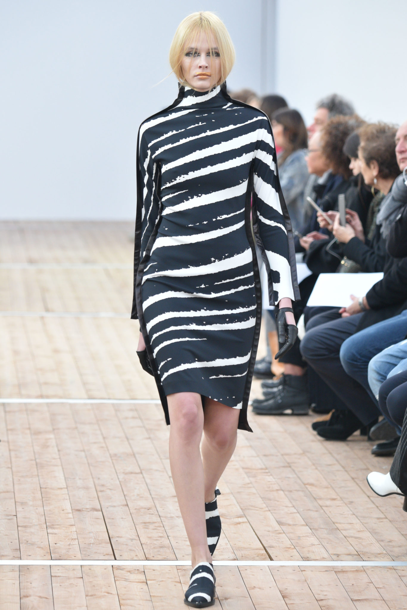 Cachemire zibeline, jersey compact, crêpe stretch imprimé « esquisse », poil de laine, carton lamé, néoprène contrecollé, cuir, mousseline rayures métal, « luminati », ruban de soie, broderies inachevées de baguettes de métal sont les supports de cette collection.