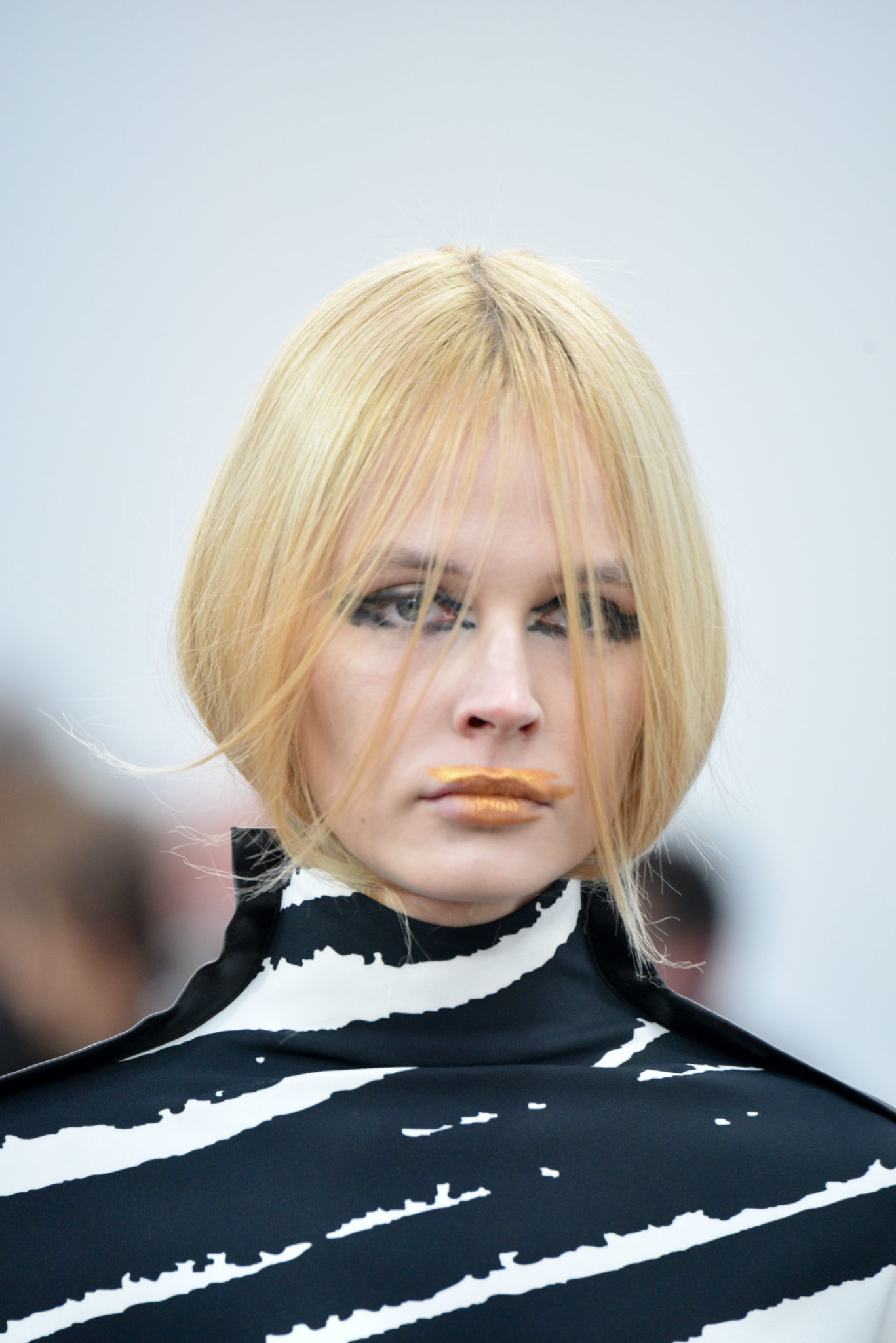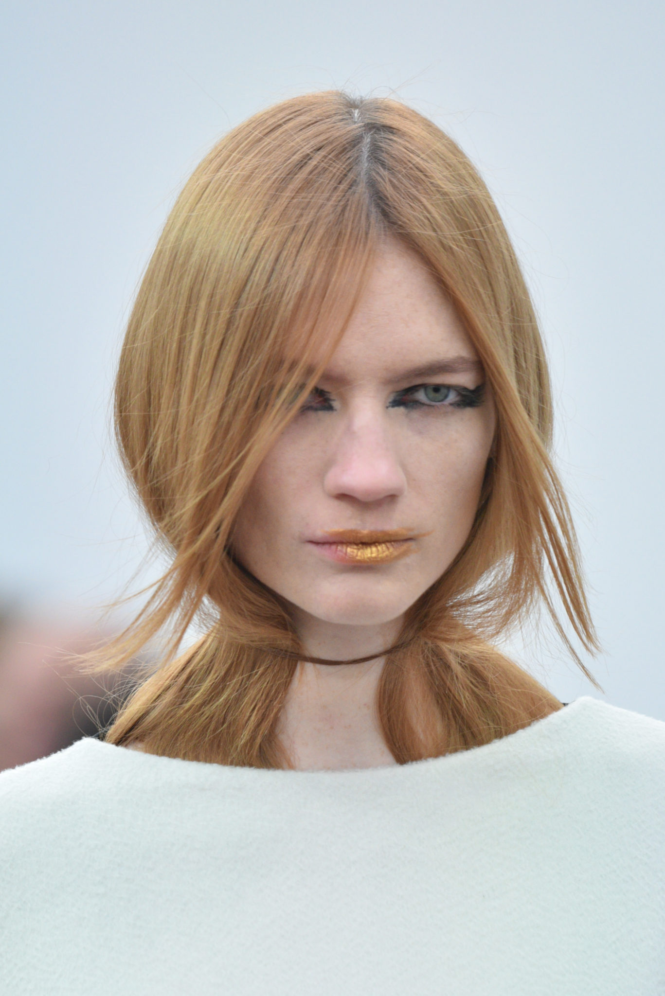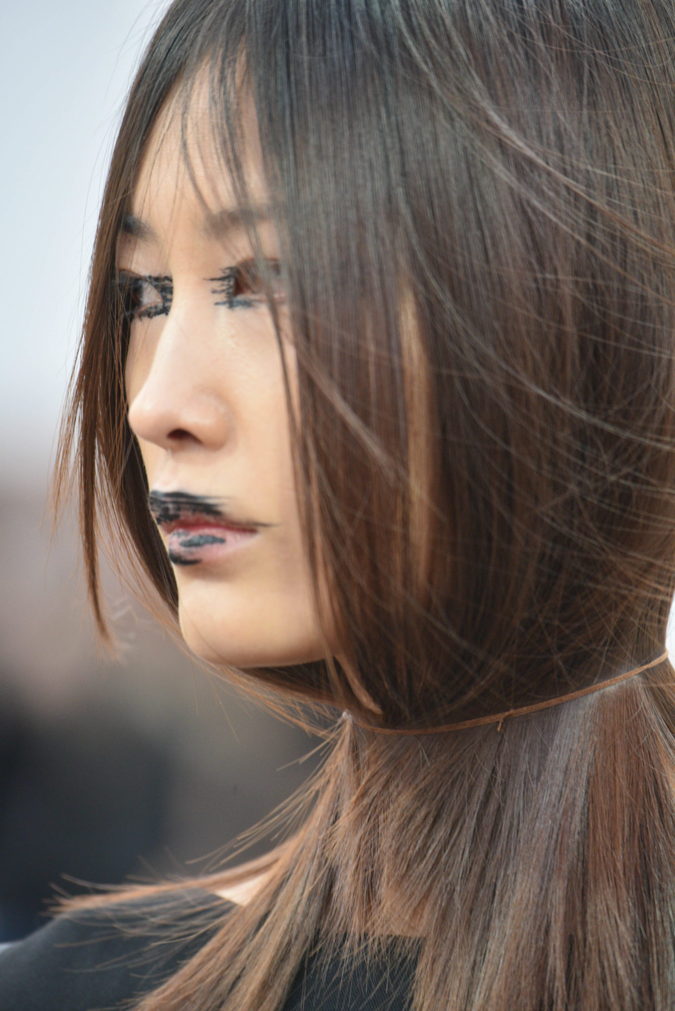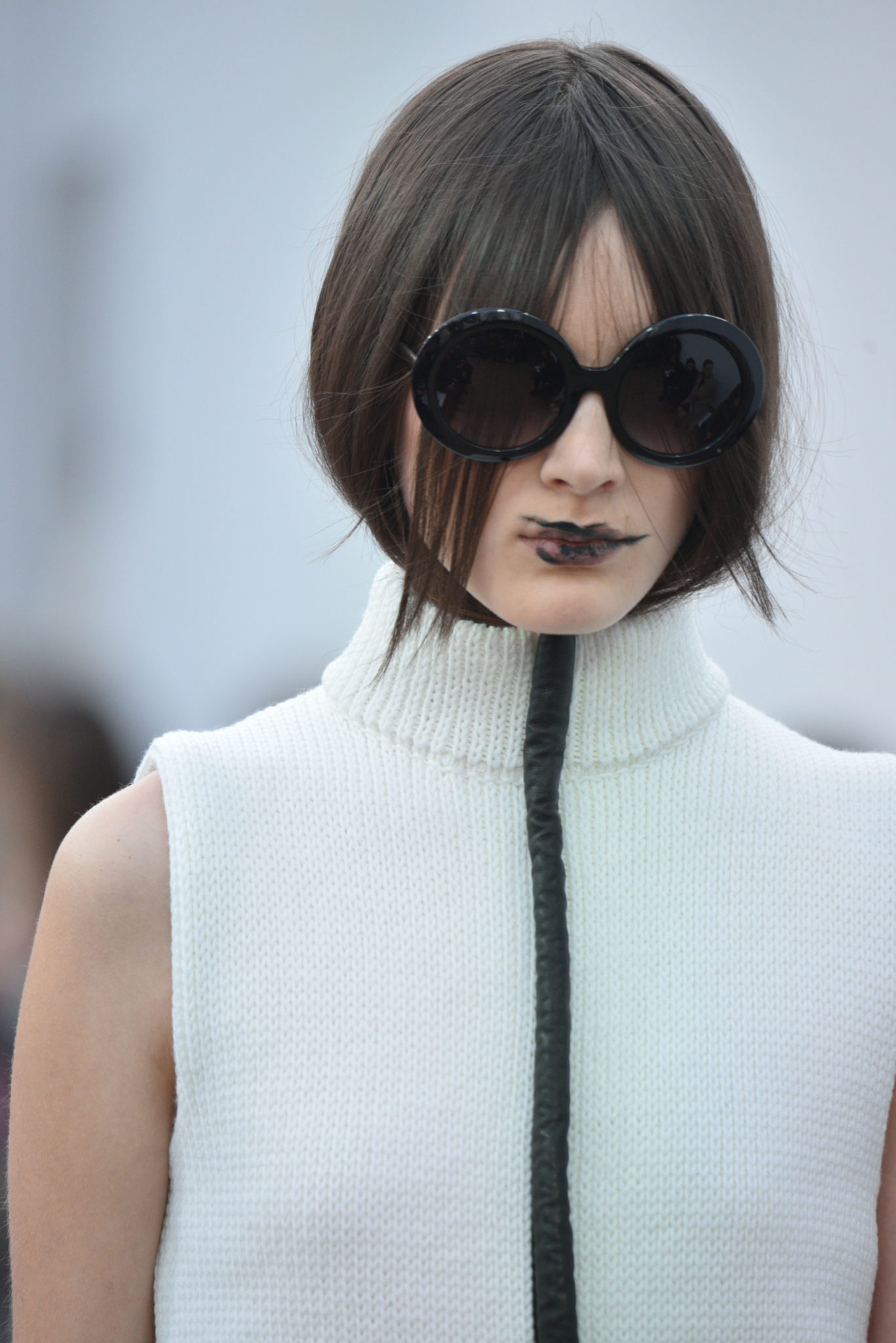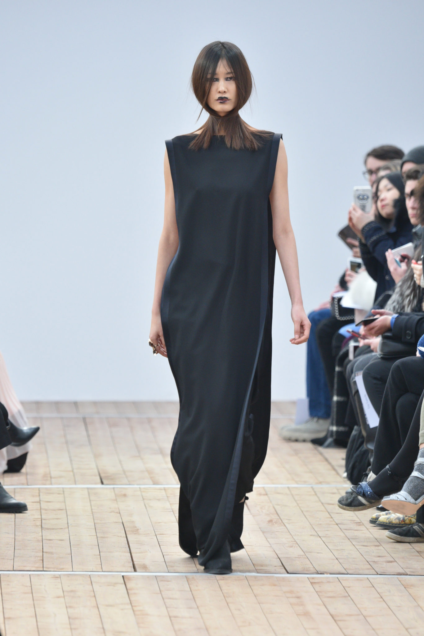 Cachemire zibeline, jersey compact, crêpe stretch imprimé « esquisse », poil de laine, carton lamé, néoprène contrecollé, cuir, mousseline rayures métal, « luminati », ruban de soie, broderies inachevées de baguettes de métal sont les supports de cette collection.
