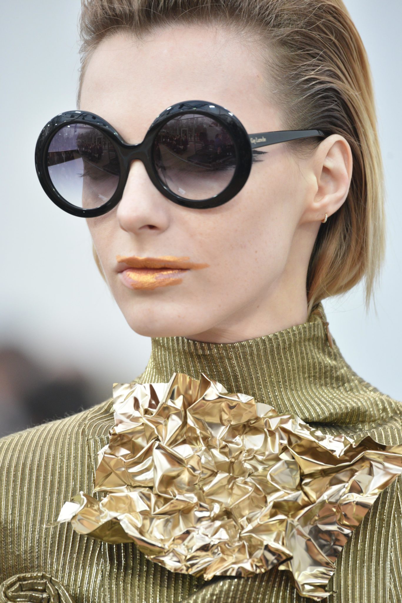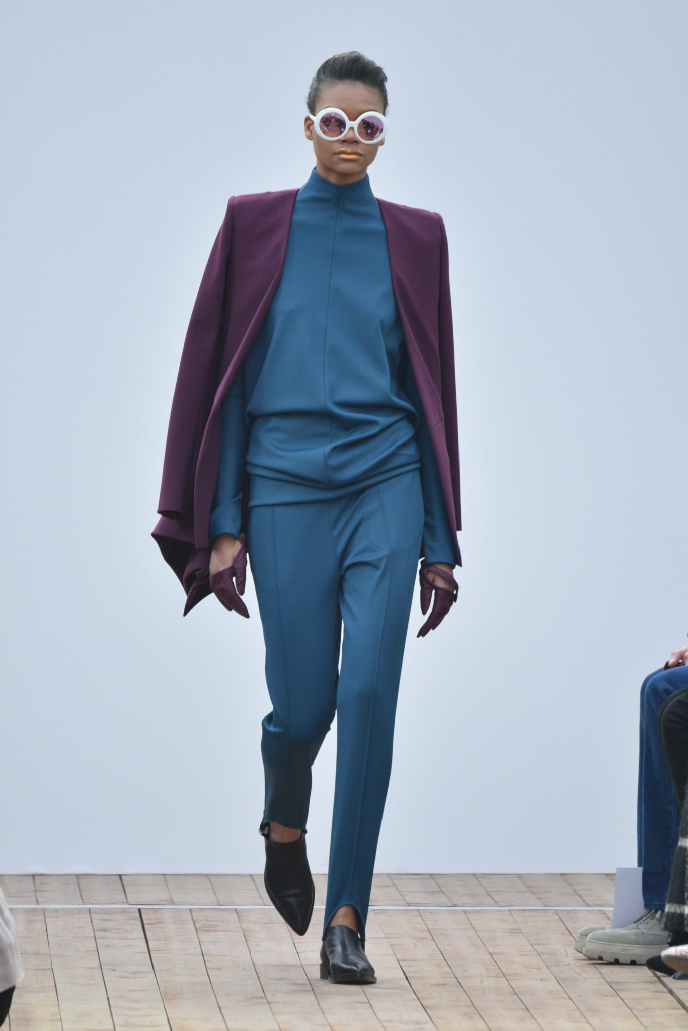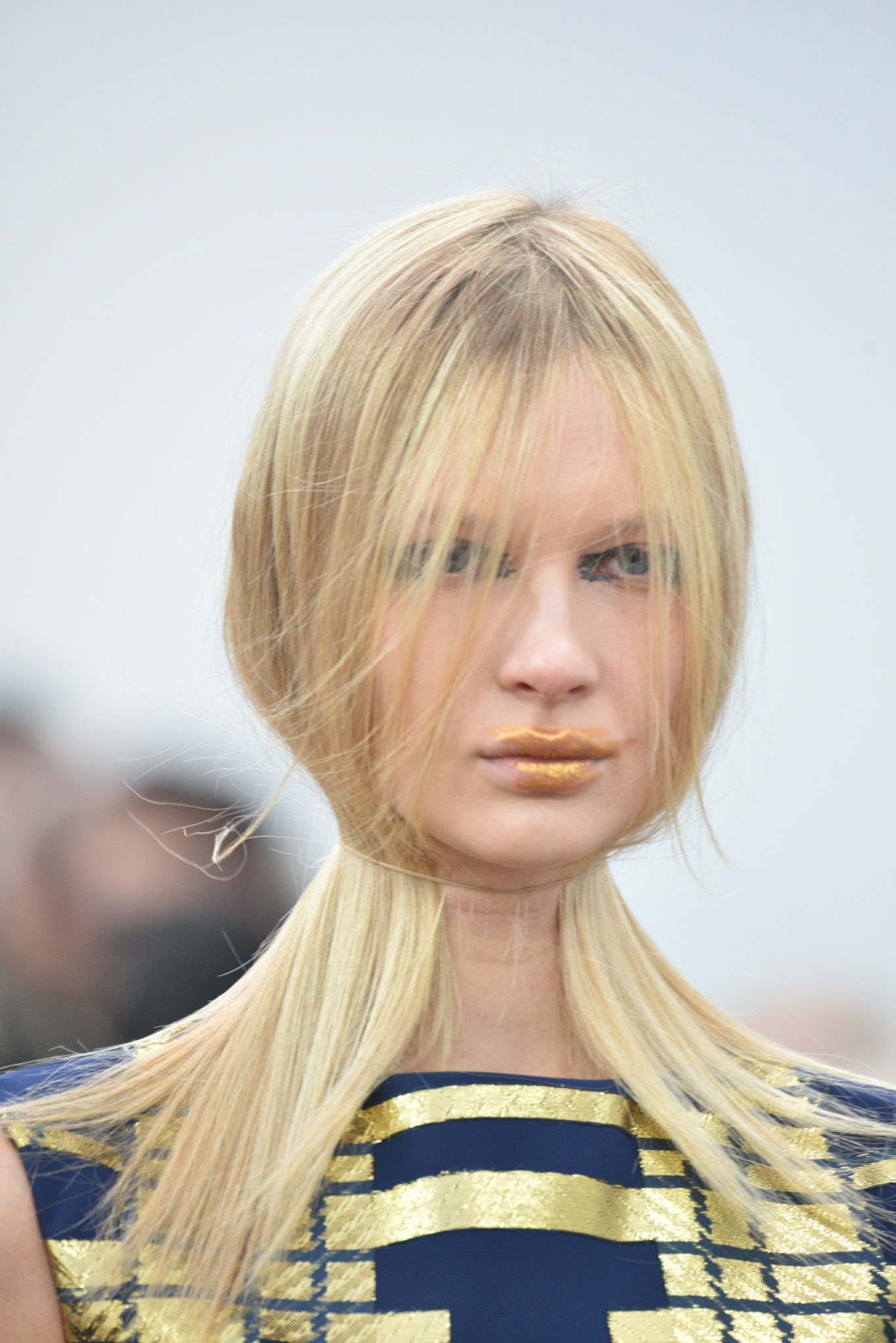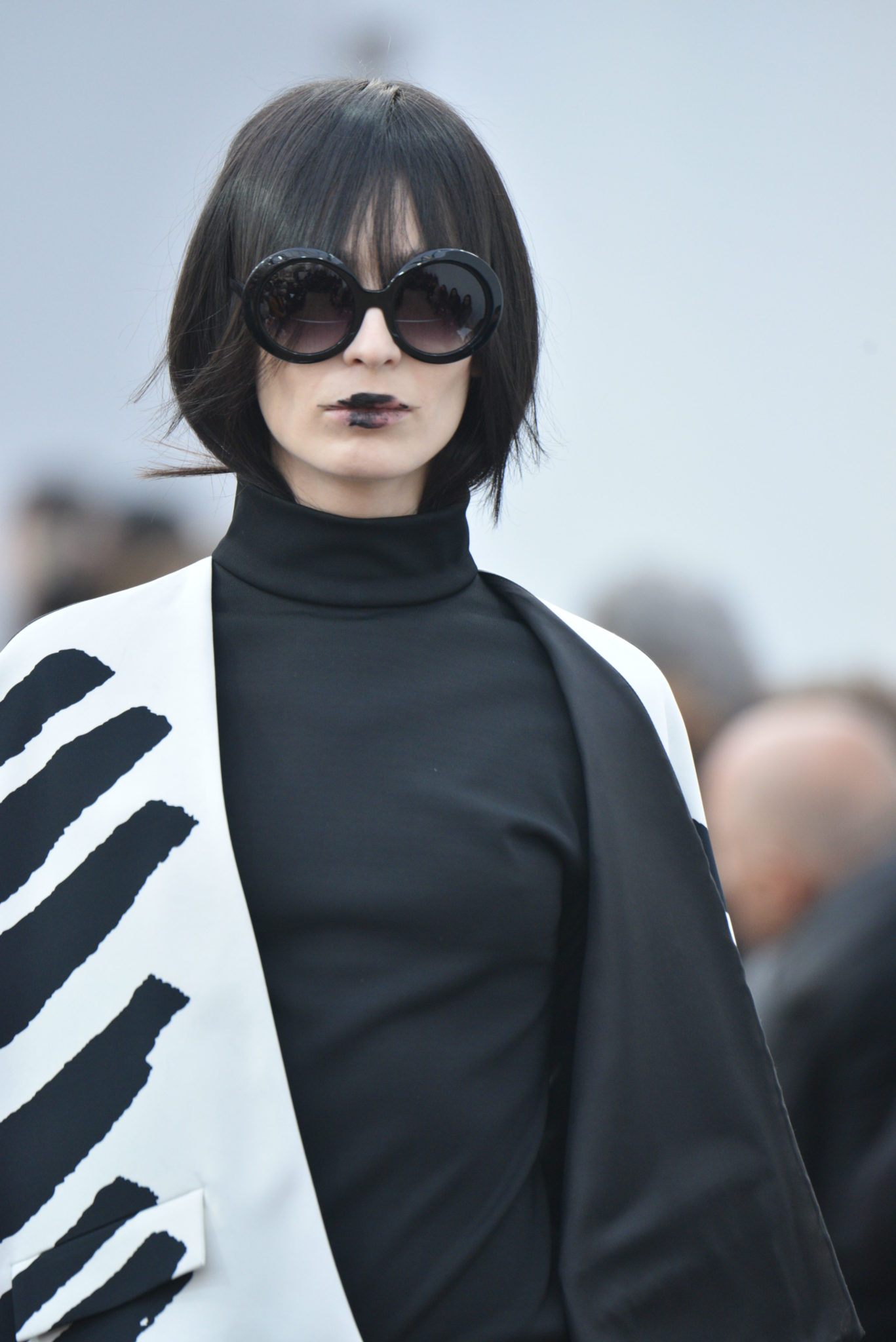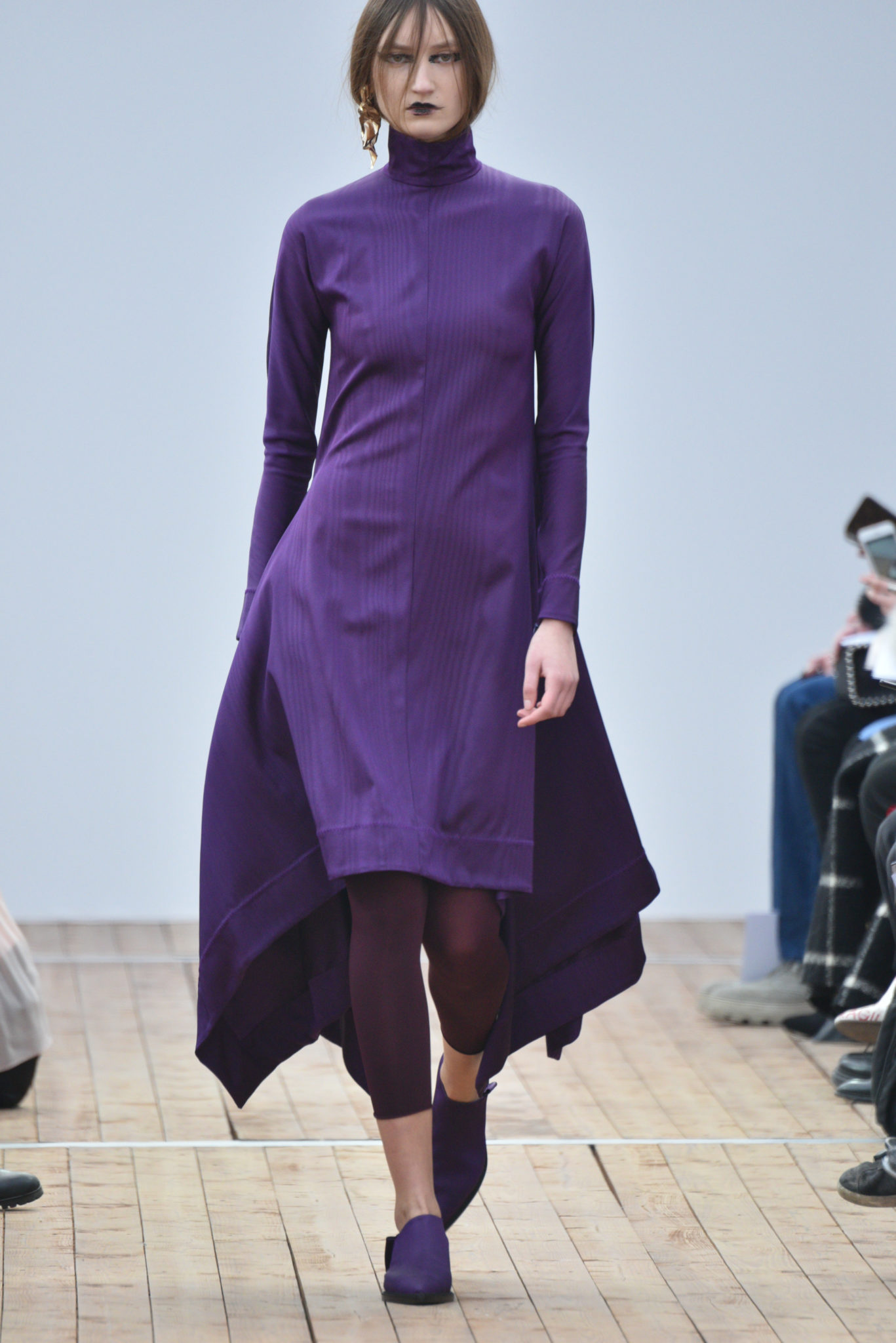 Cachemire zibeline, jersey compact, crêpe stretch imprimé « esquisse », poil de laine, carton lamé, néoprène contrecollé, cuir, mousseline rayures métal, « luminati », ruban de soie, broderies inachevées de baguettes de métal sont les supports de cette collection.