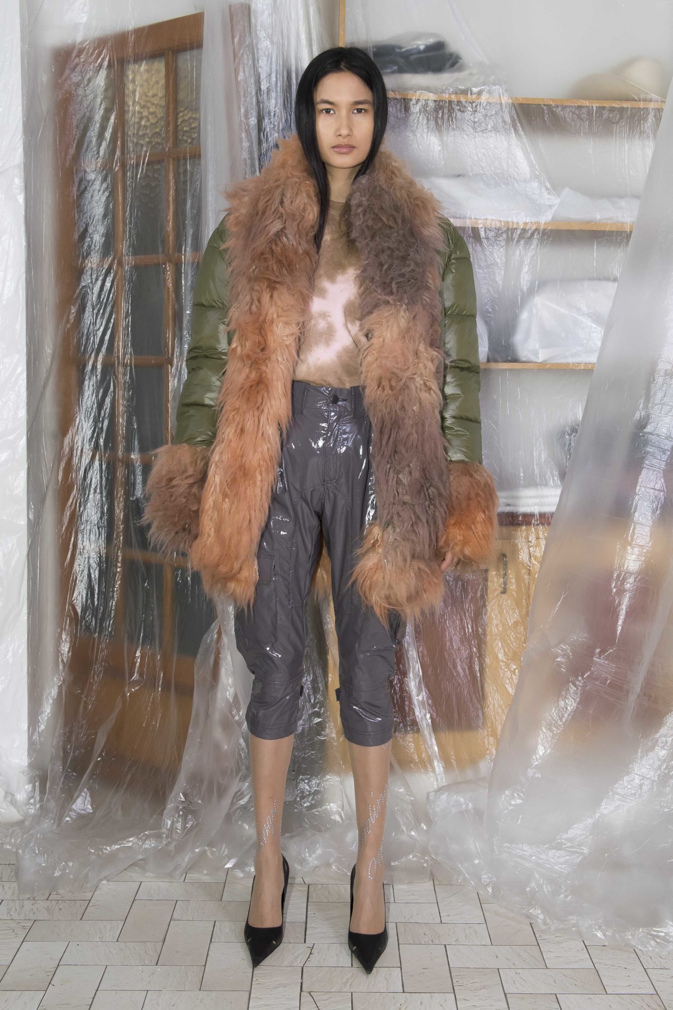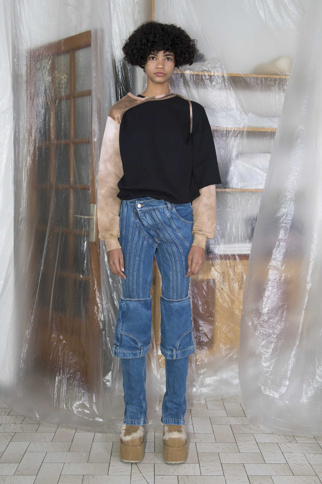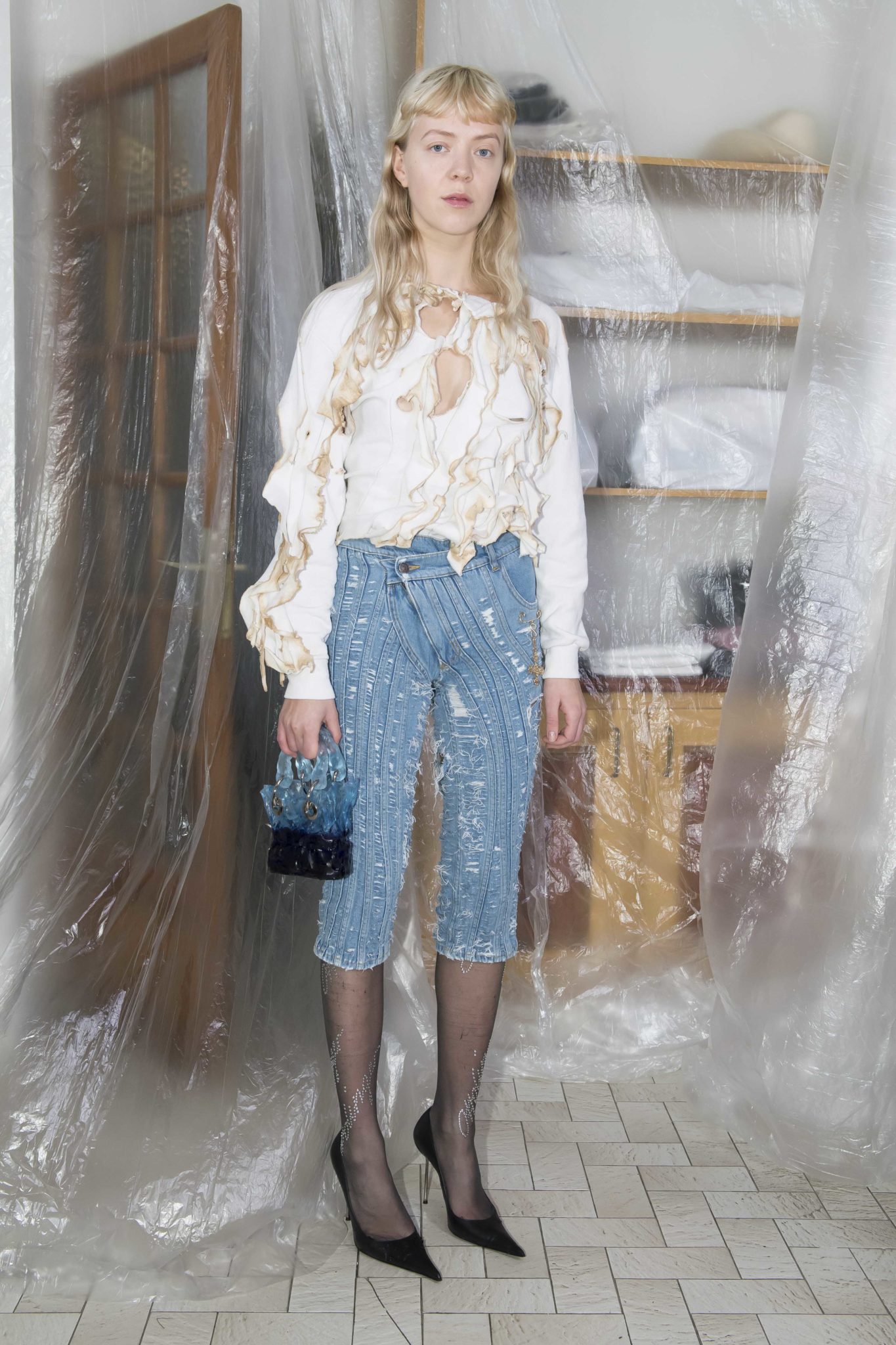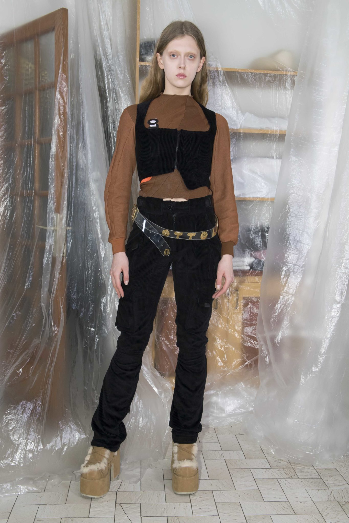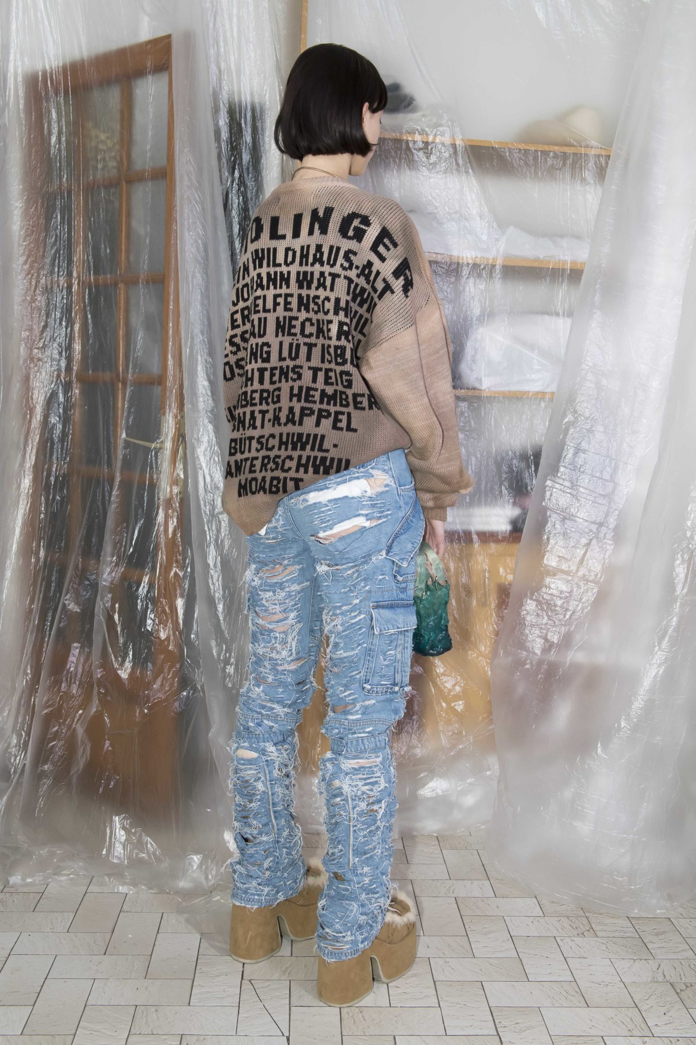 On retrouve le denim, le jersey et la maille caractéristiques du label, retravaillés au chalumeau, lacérés, et teints à la main. De nouvelles formes et pièces voient le jour, comme une doudoune doublée de fausse fourrure, une robe à manches longues sophistiquée retravaillée, ou des costumes en flanelle ou velours côtelé.