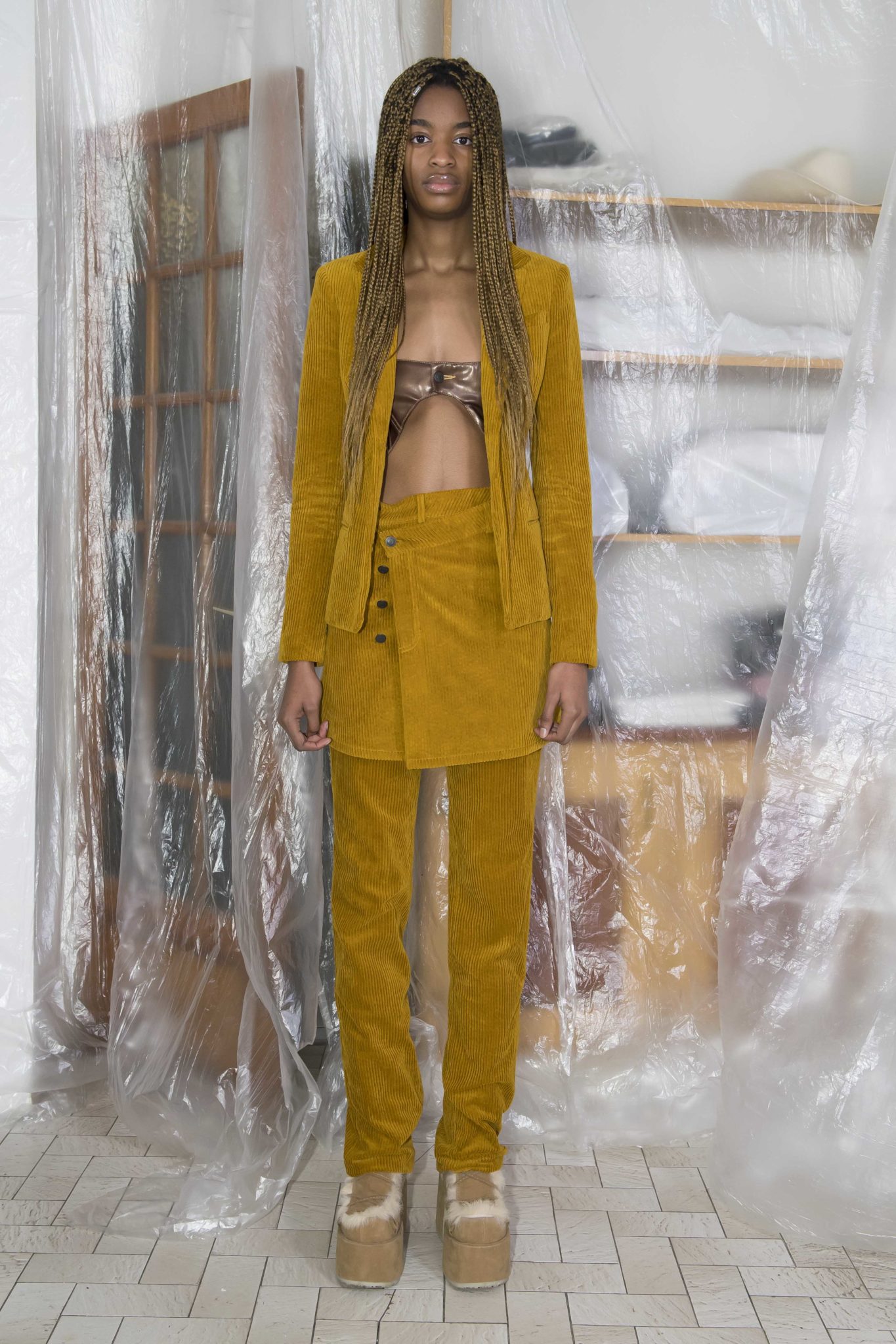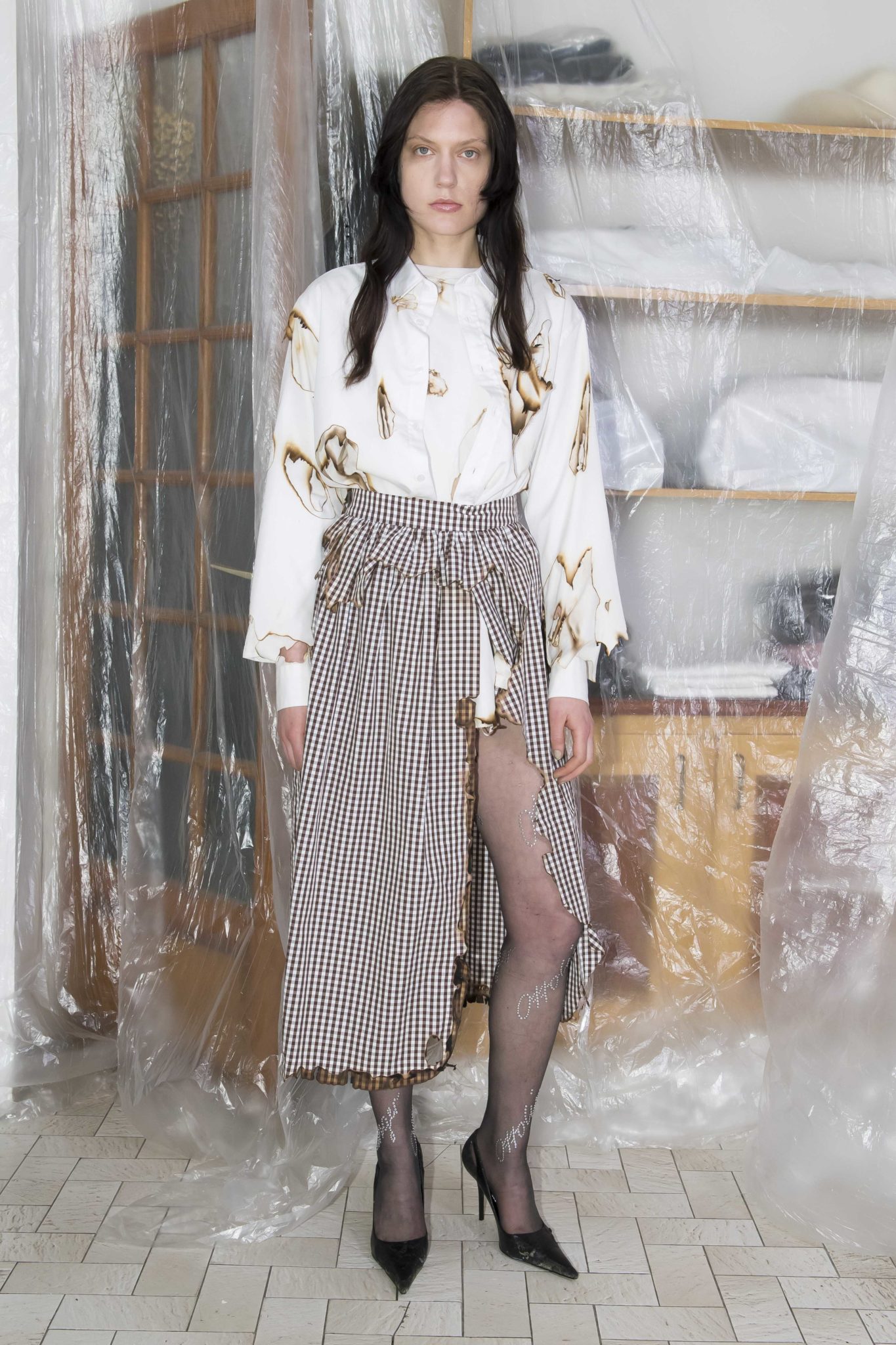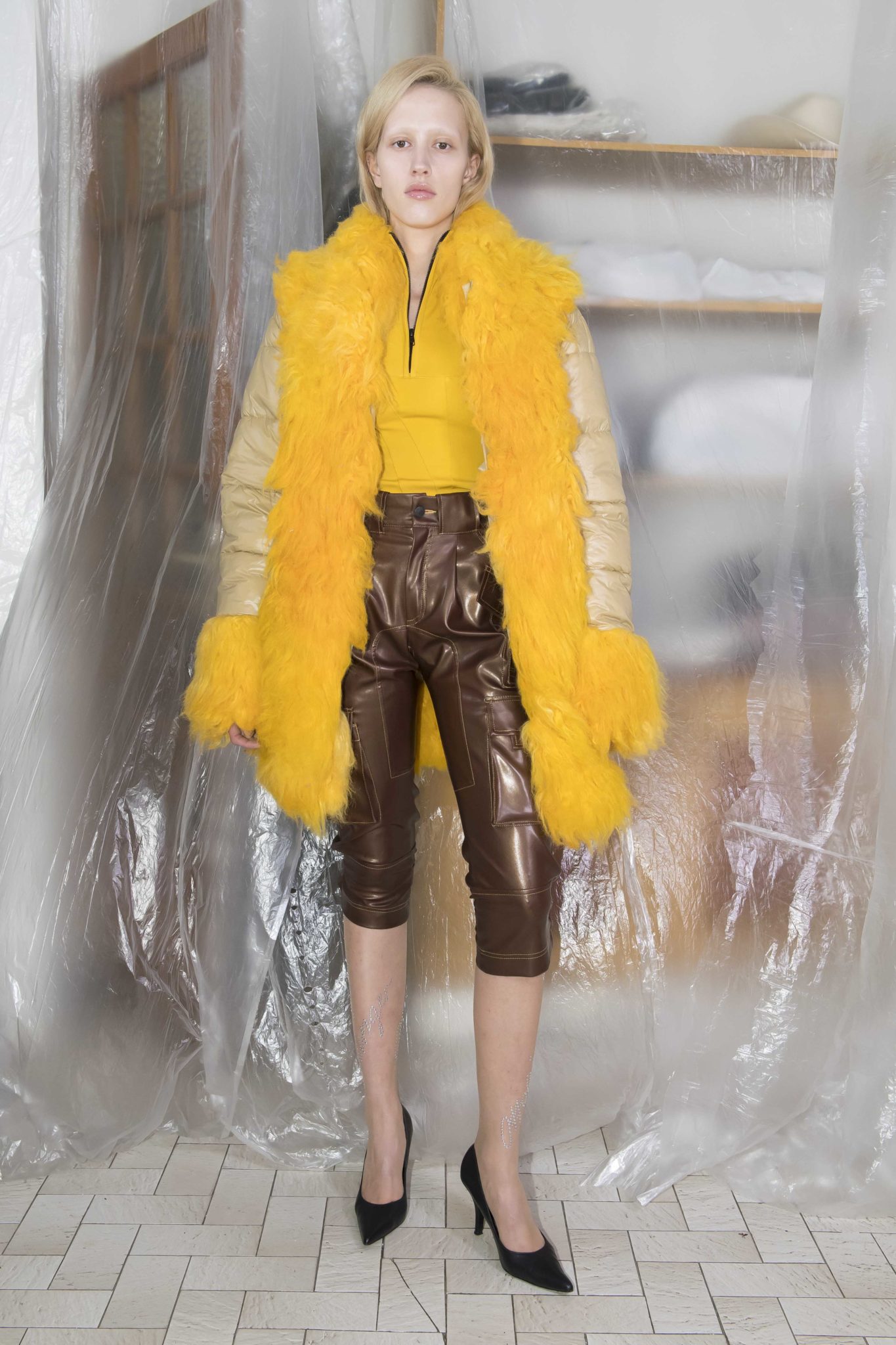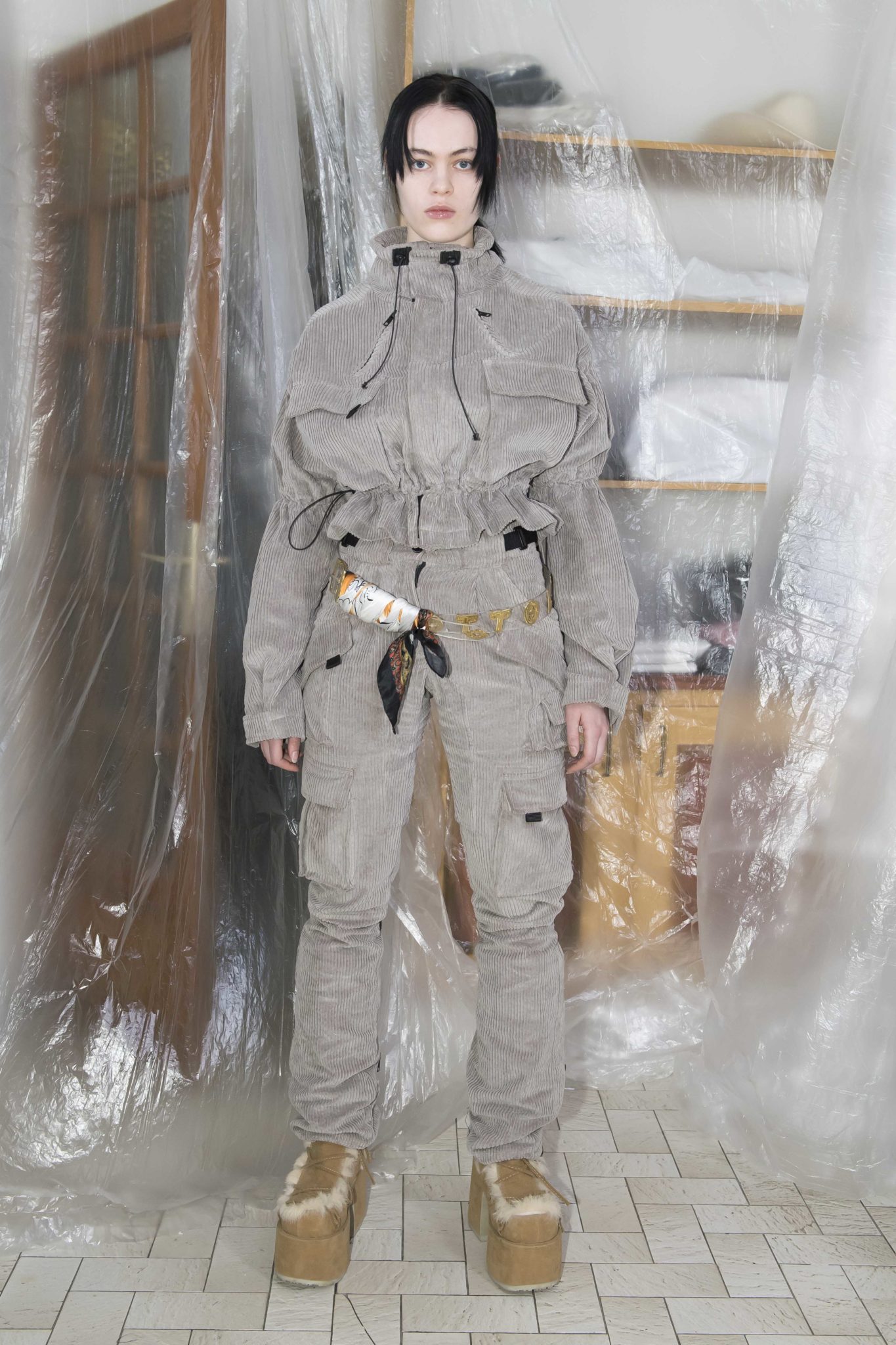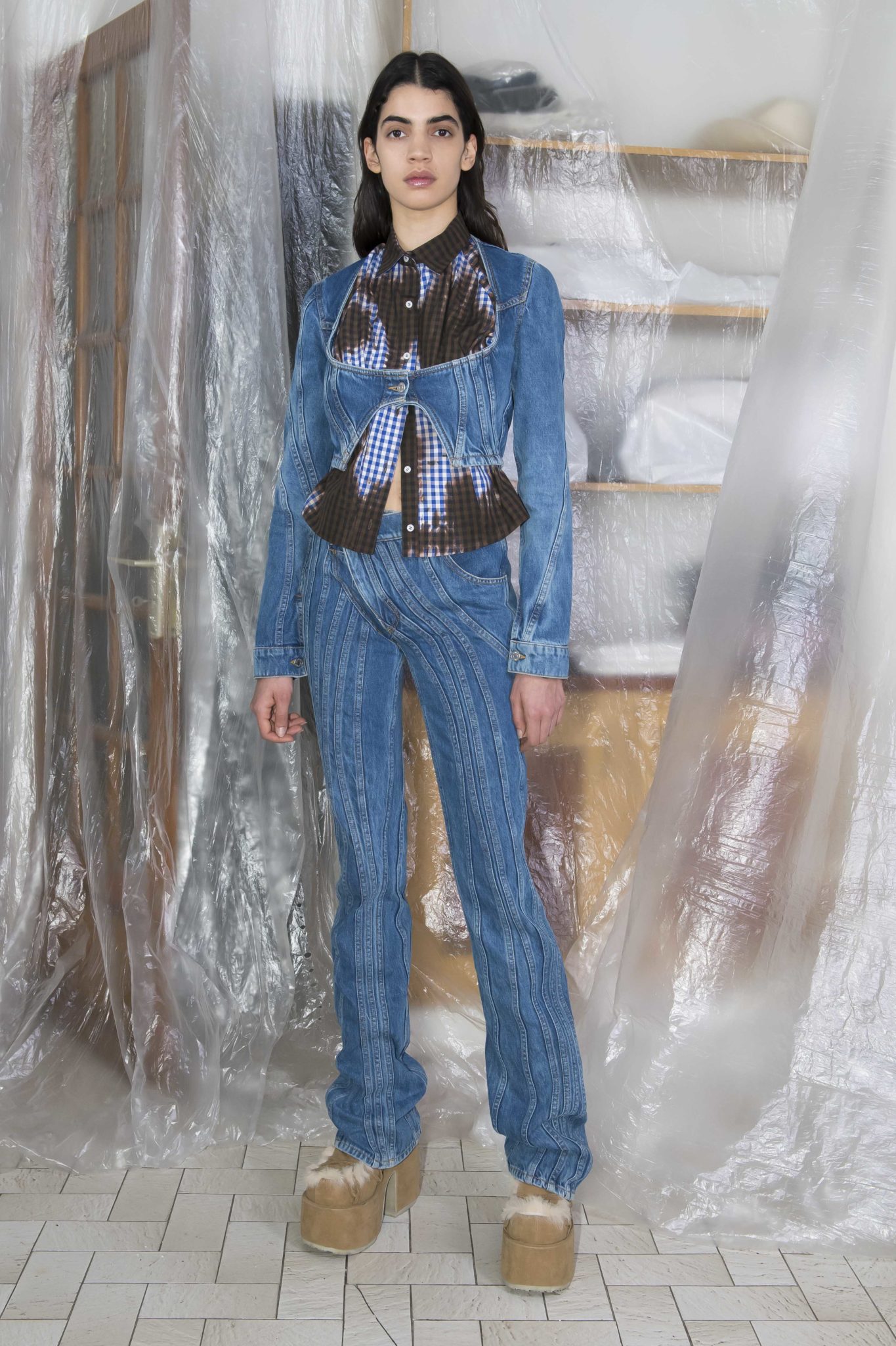 On retrouve le denim, le jersey et la maille caractéristiques du label, retravaillés au chalumeau, lacérés, et teints à la main. De nouvelles formes et pièces voient le jour, comme une doudoune doublée de fausse fourrure, une robe à manches longues sophistiquée retravaillée, ou des costumes en flanelle ou velours côtelé.