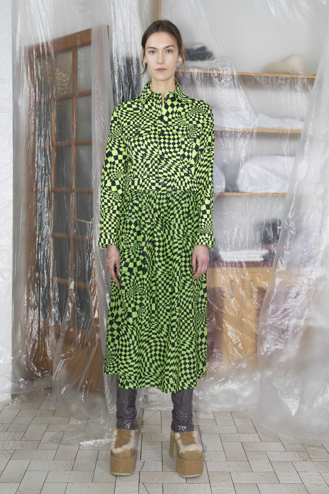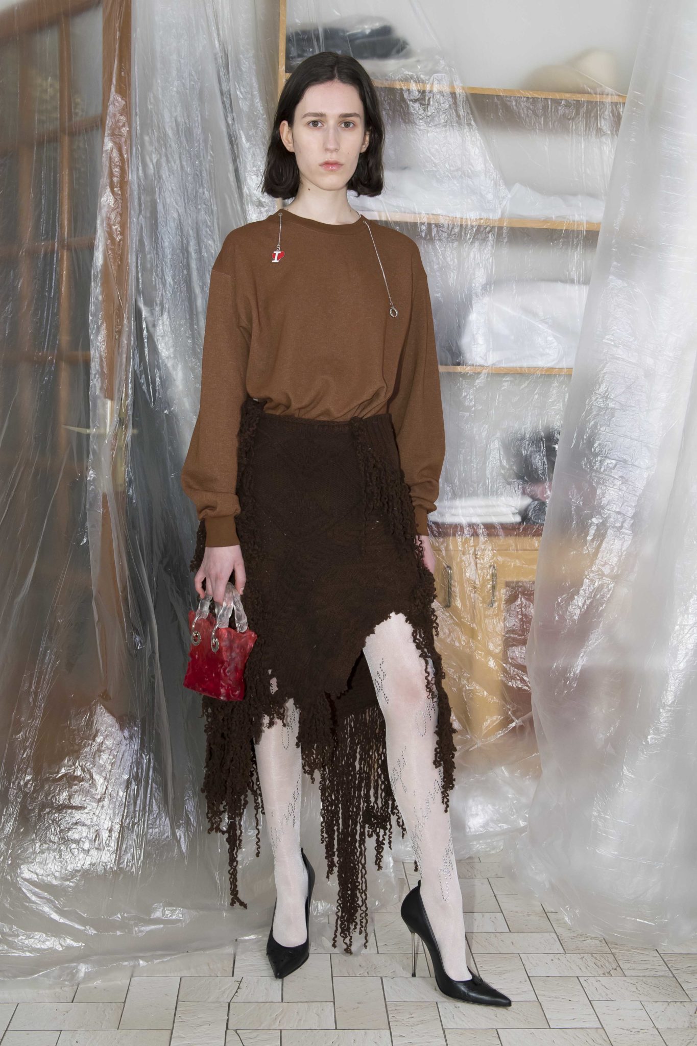Comme la saison dernière, la collection AH18 intègre des tissus, détails et accessoires traditionnels suisses. On retrouve notamment le « Kölsch », tissu à motifs colorés, nommé d’après la ville allemande de Cologne, souvent utilisé dans les vêtements traditionnels suisses, allemands et autrichiens appelés « Trachten ».