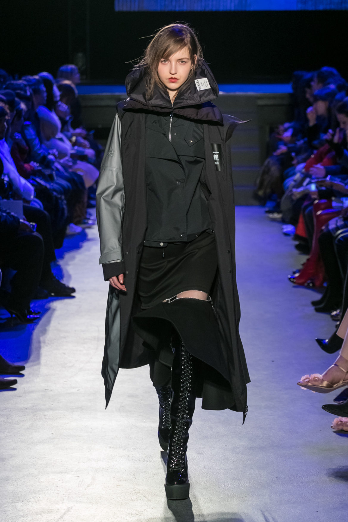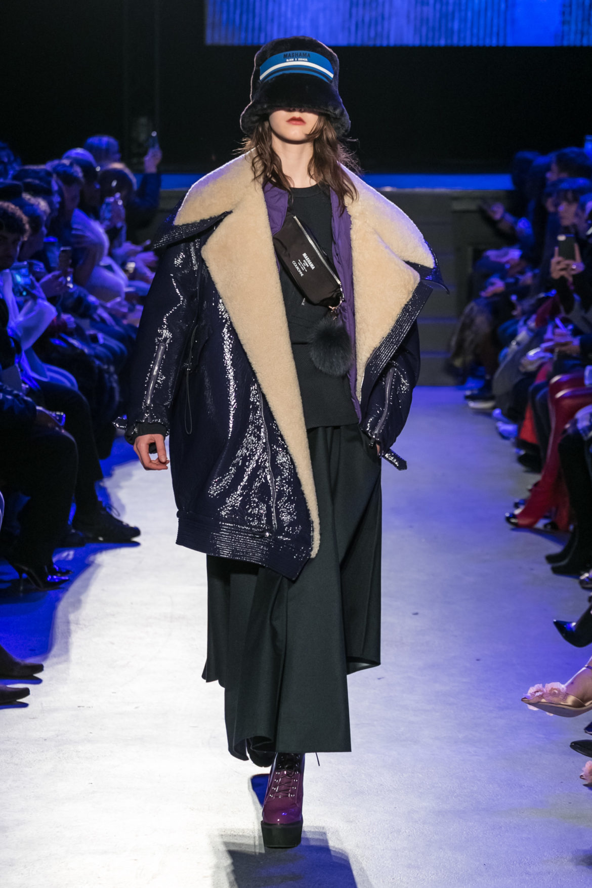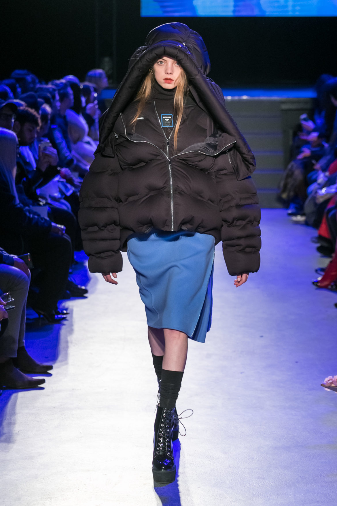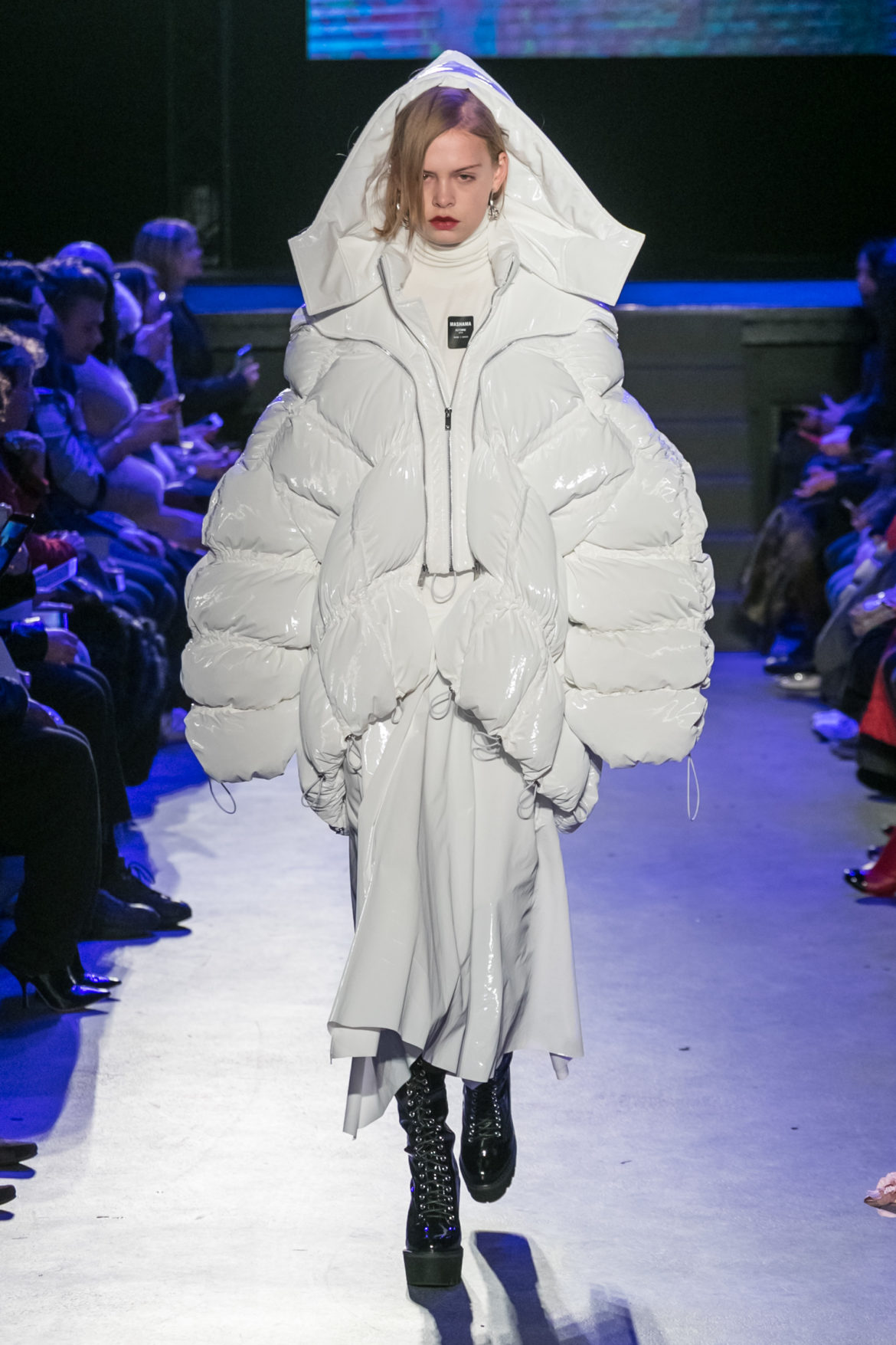Exaggerated hoods, round shapes, deconstructed big forms, and voluptuous cuts, sculpt the MASHAMA impenetrable shield. Innovative high-tech materials, sci-fi fabrics and new production techniques further optimise the ideal outdoor buffer in big body- warming puffers, inside-out anoraks and a changing-colour chameleon coat.