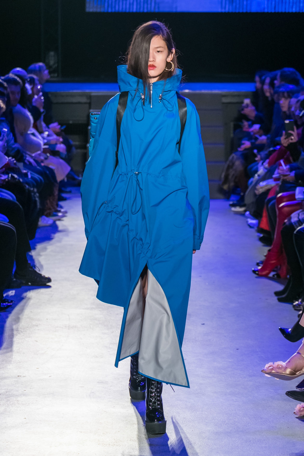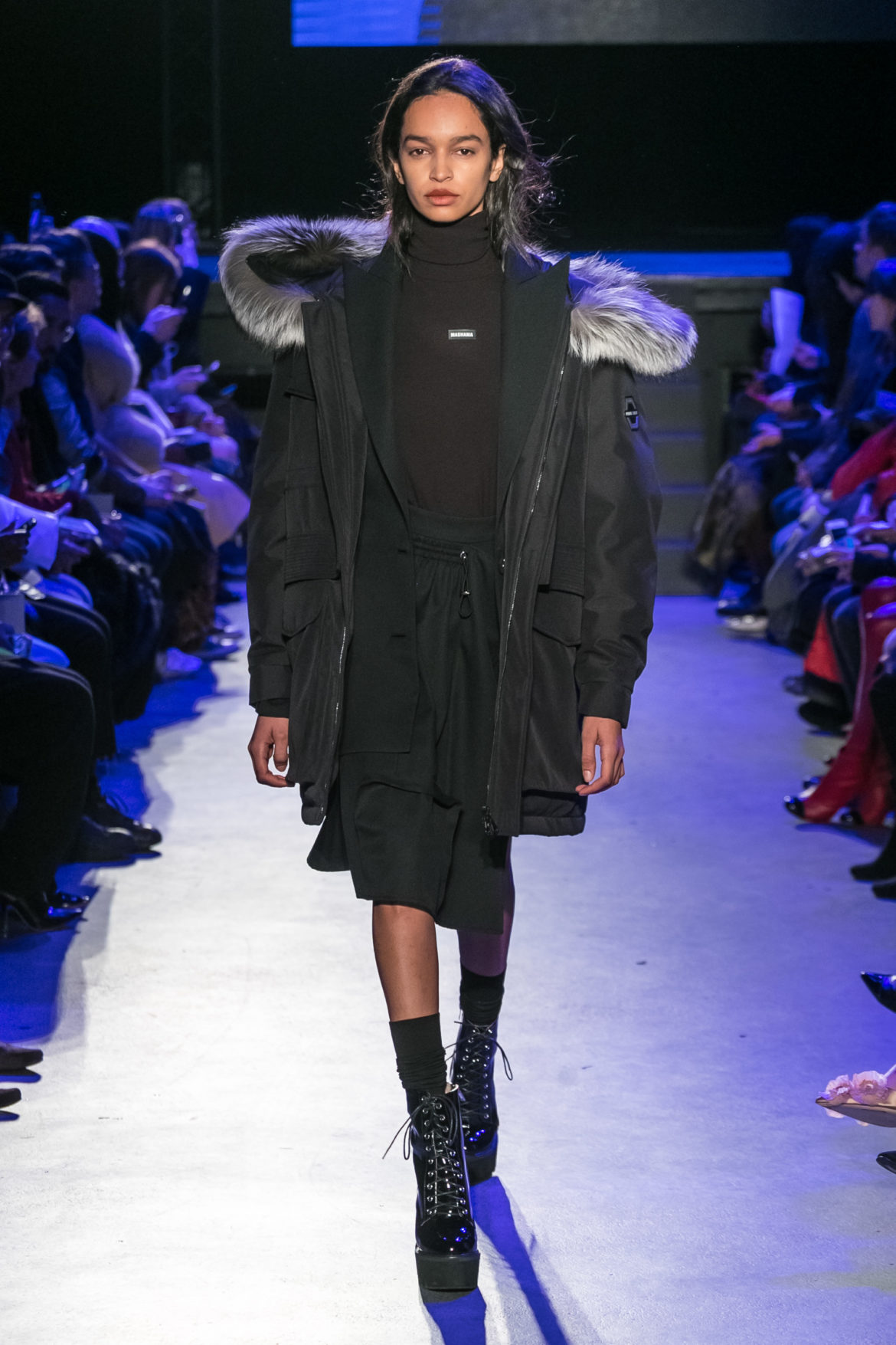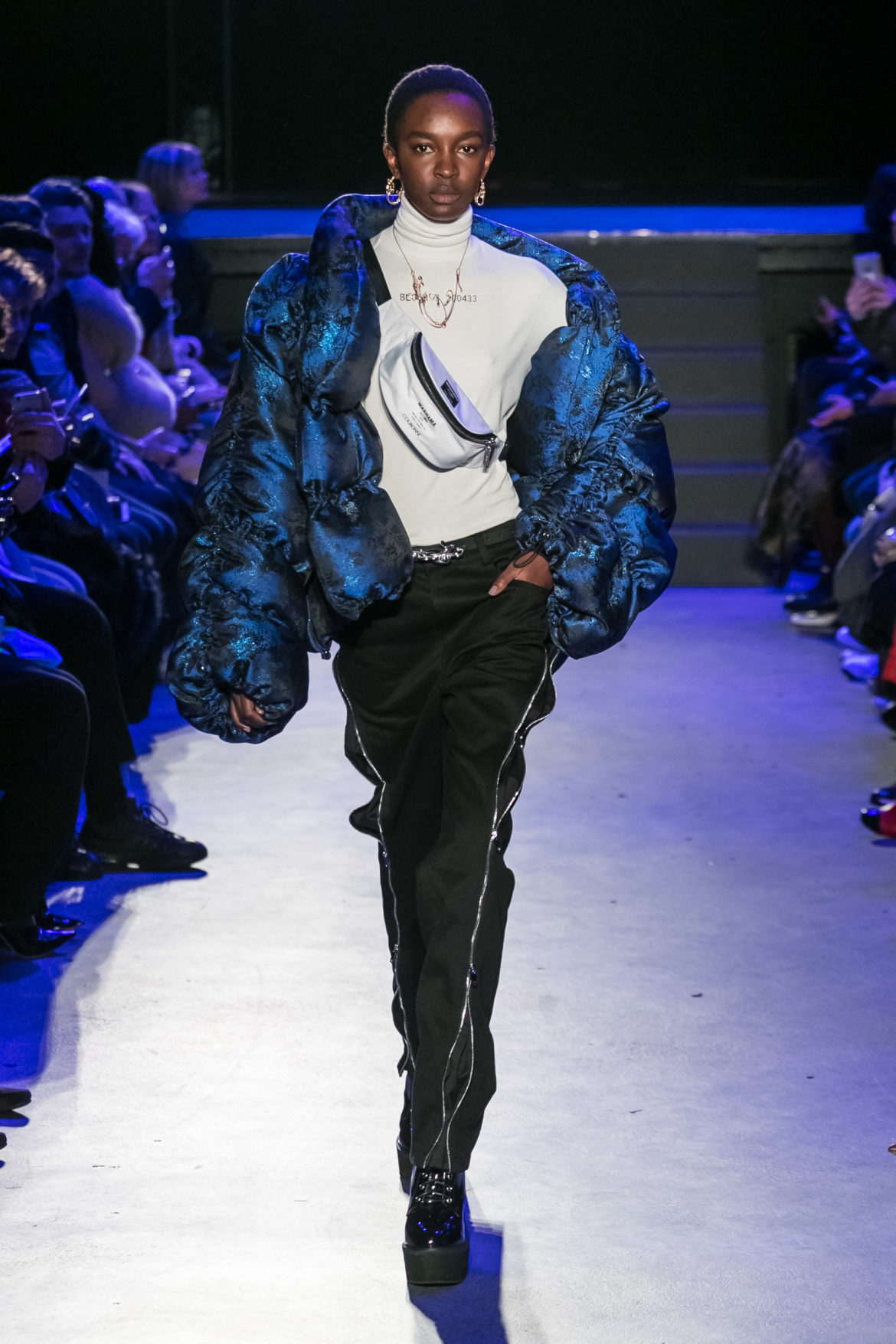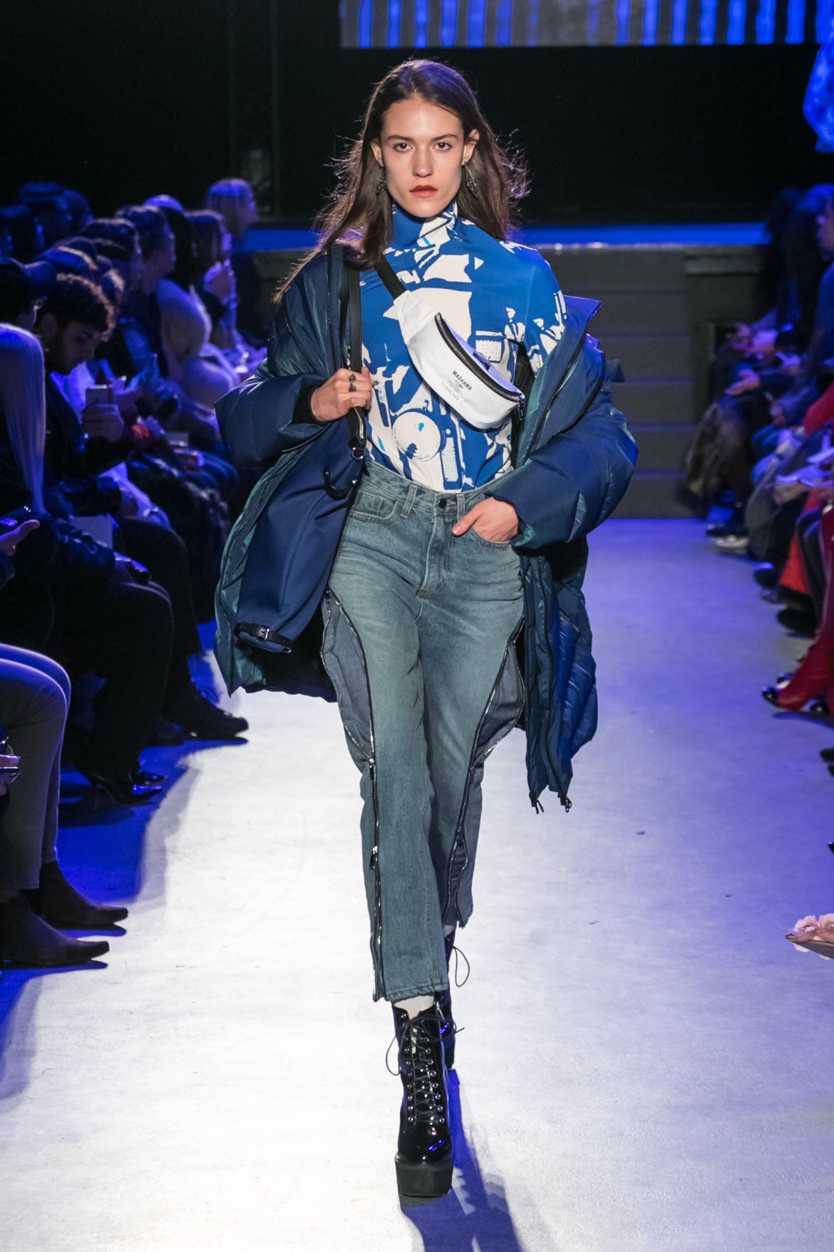 Exaggerated hoods, round shapes, deconstructed big forms, and voluptuous cuts, sculpt the MASHAMA impenetrable shield. Innovative high-tech materials, sci-fi fabrics and new production techniques further optimise the ideal outdoor buffer in big body- warming puffers, inside-out anoraks and a changing-colour chameleon coat.