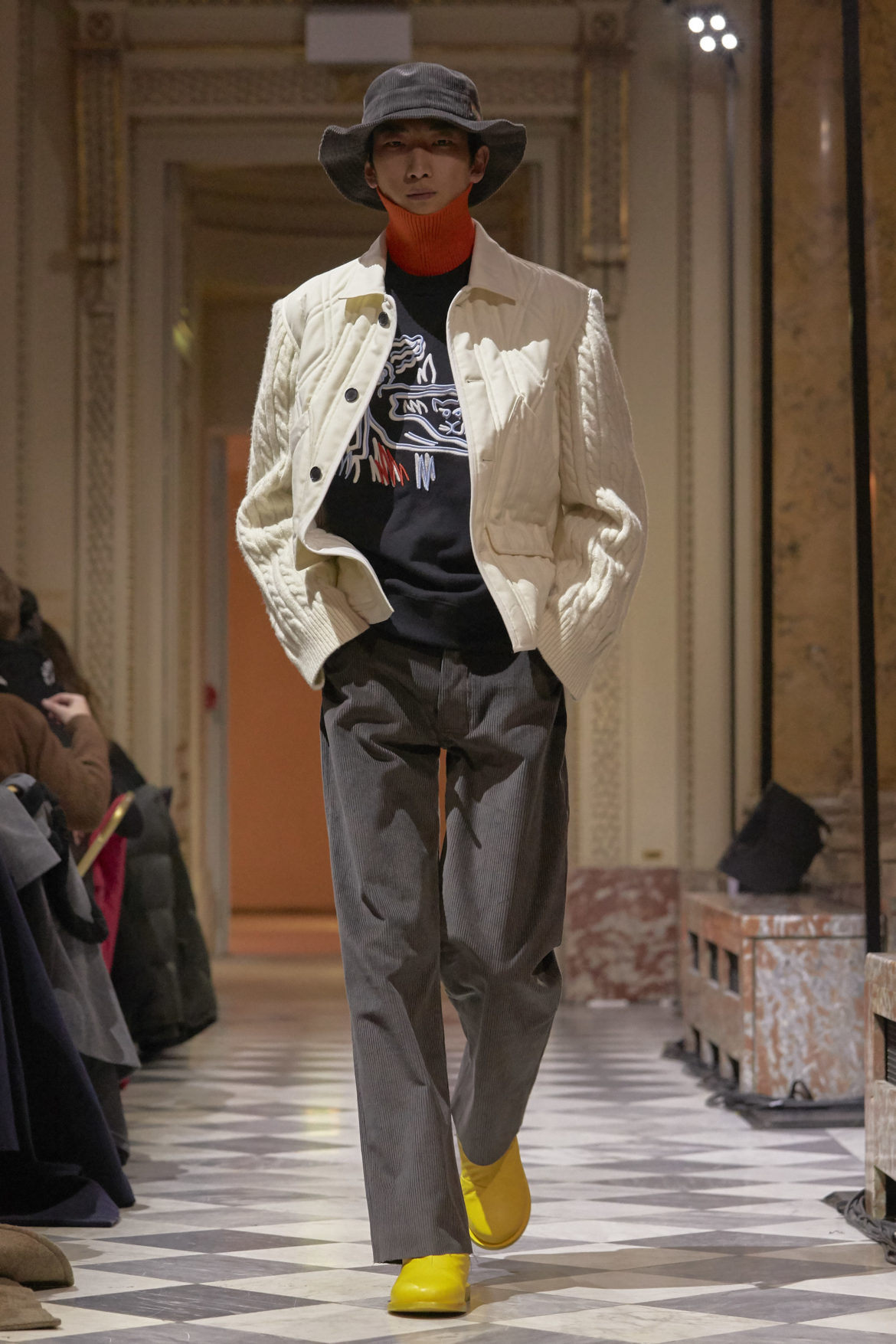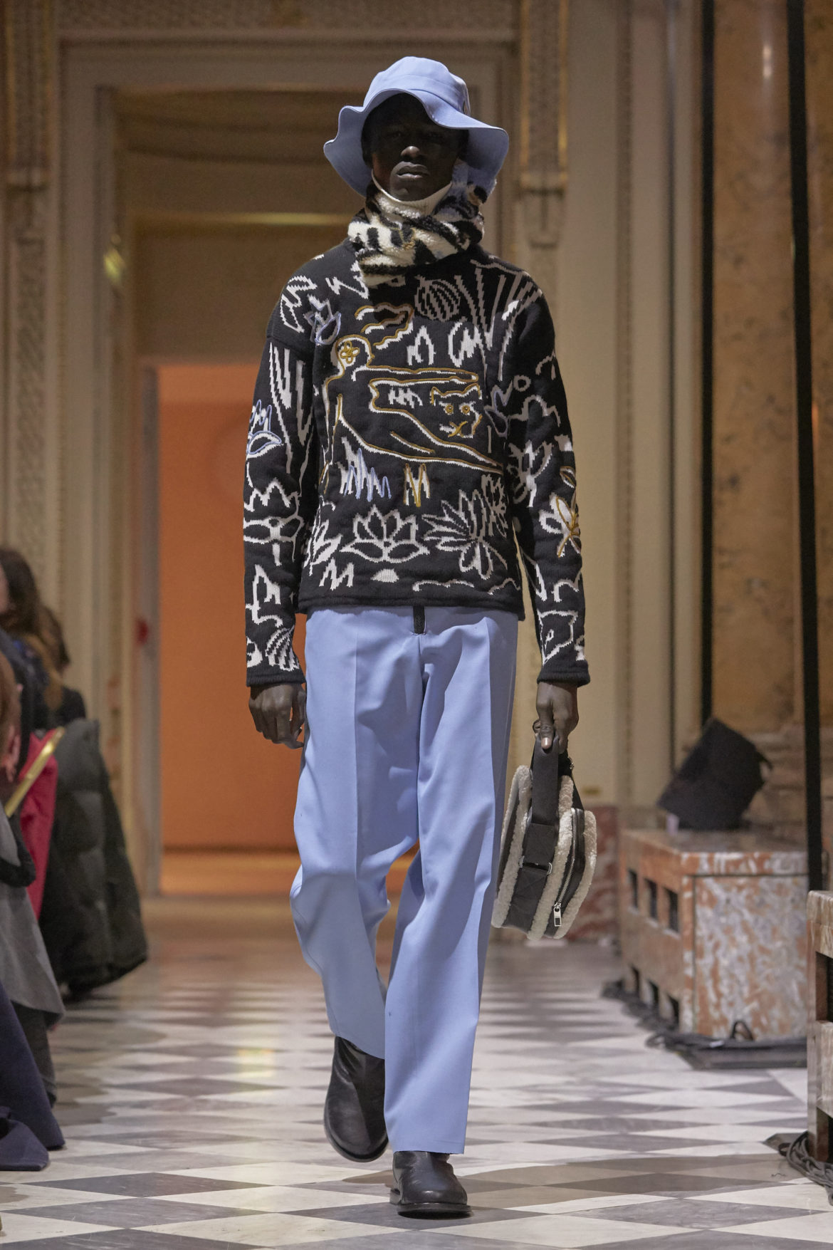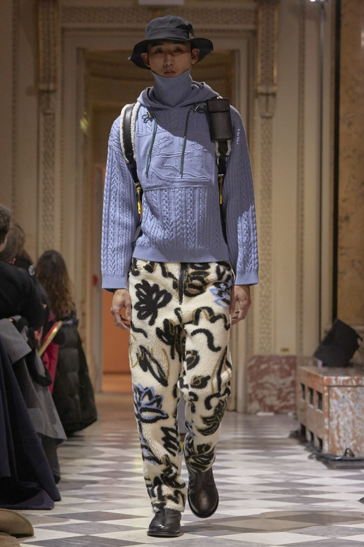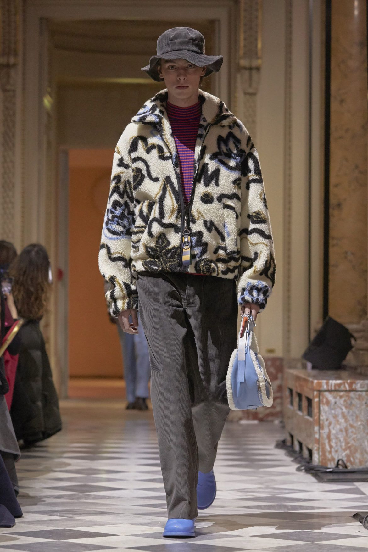 For accessories, calfskin backpacks, bum bags come in sky blue or tapestry jacquard and feature shearling trims. An archive slipper boot was the starting point for the men’s and women’s shearling lined footwear.