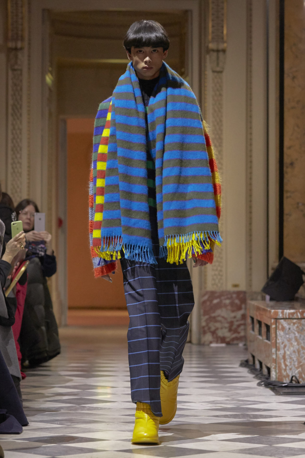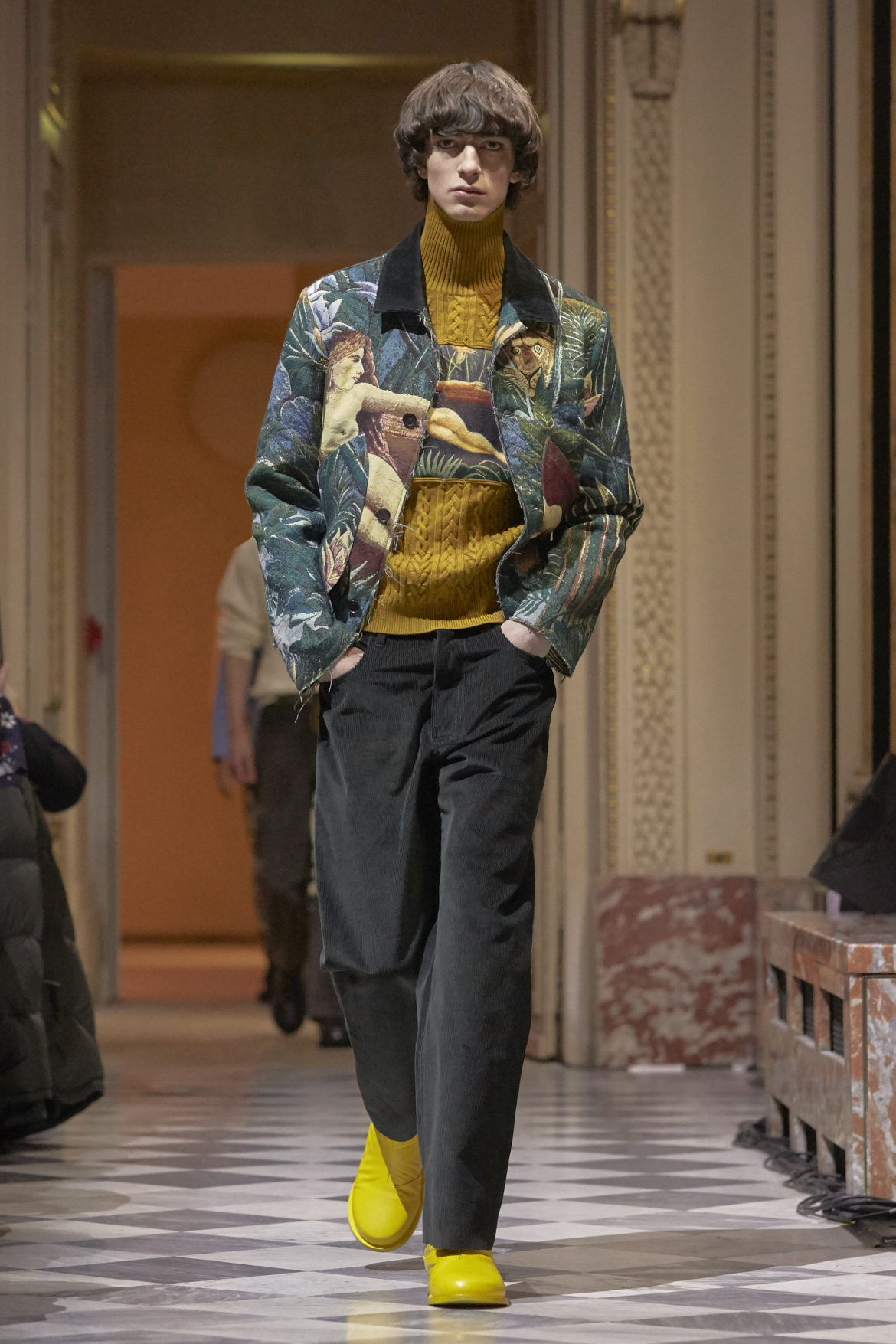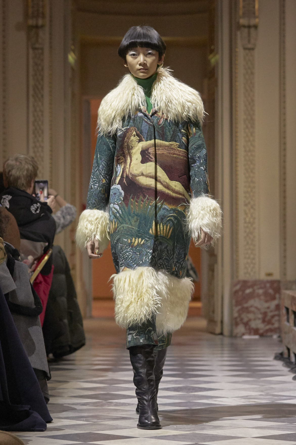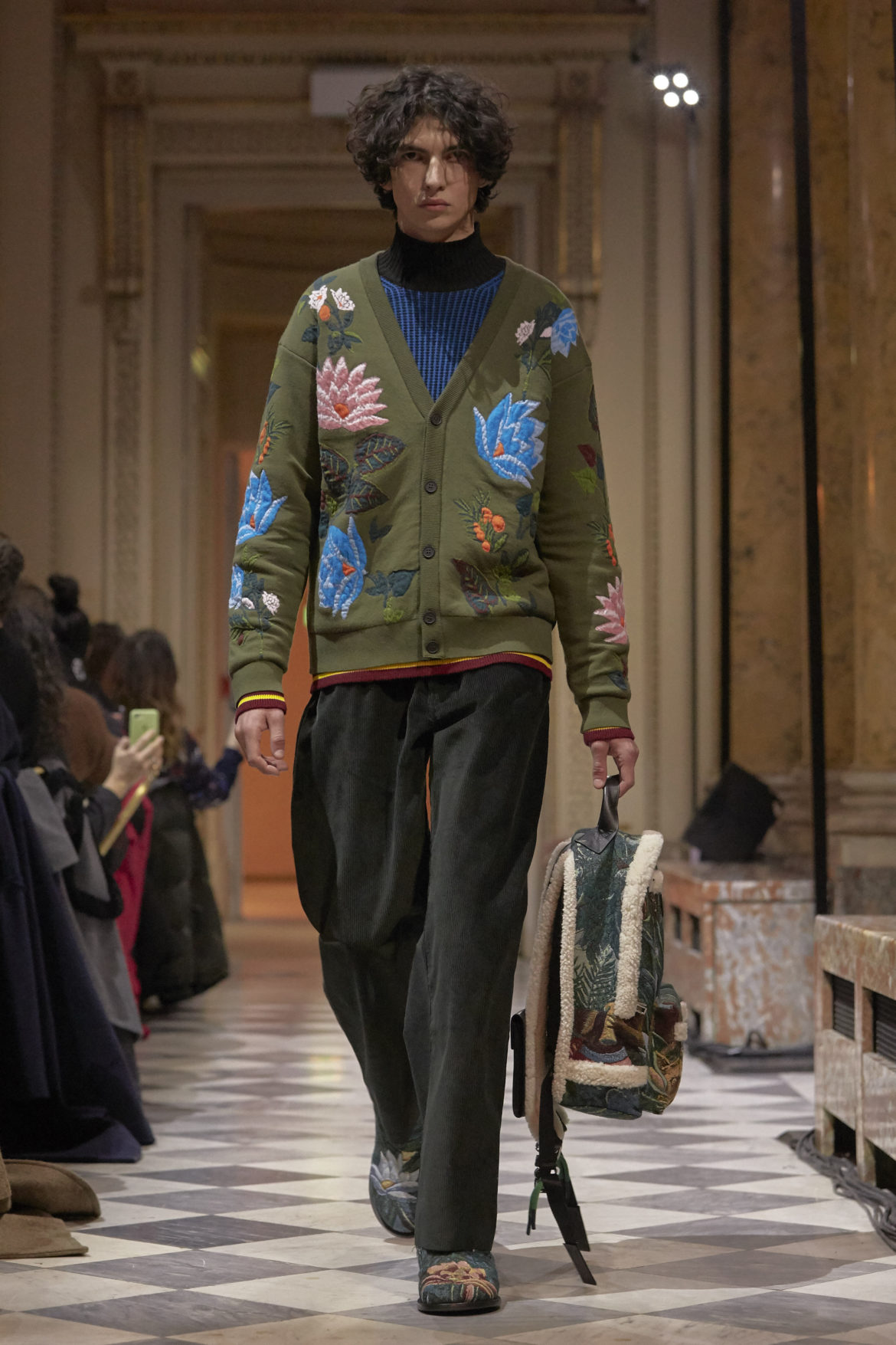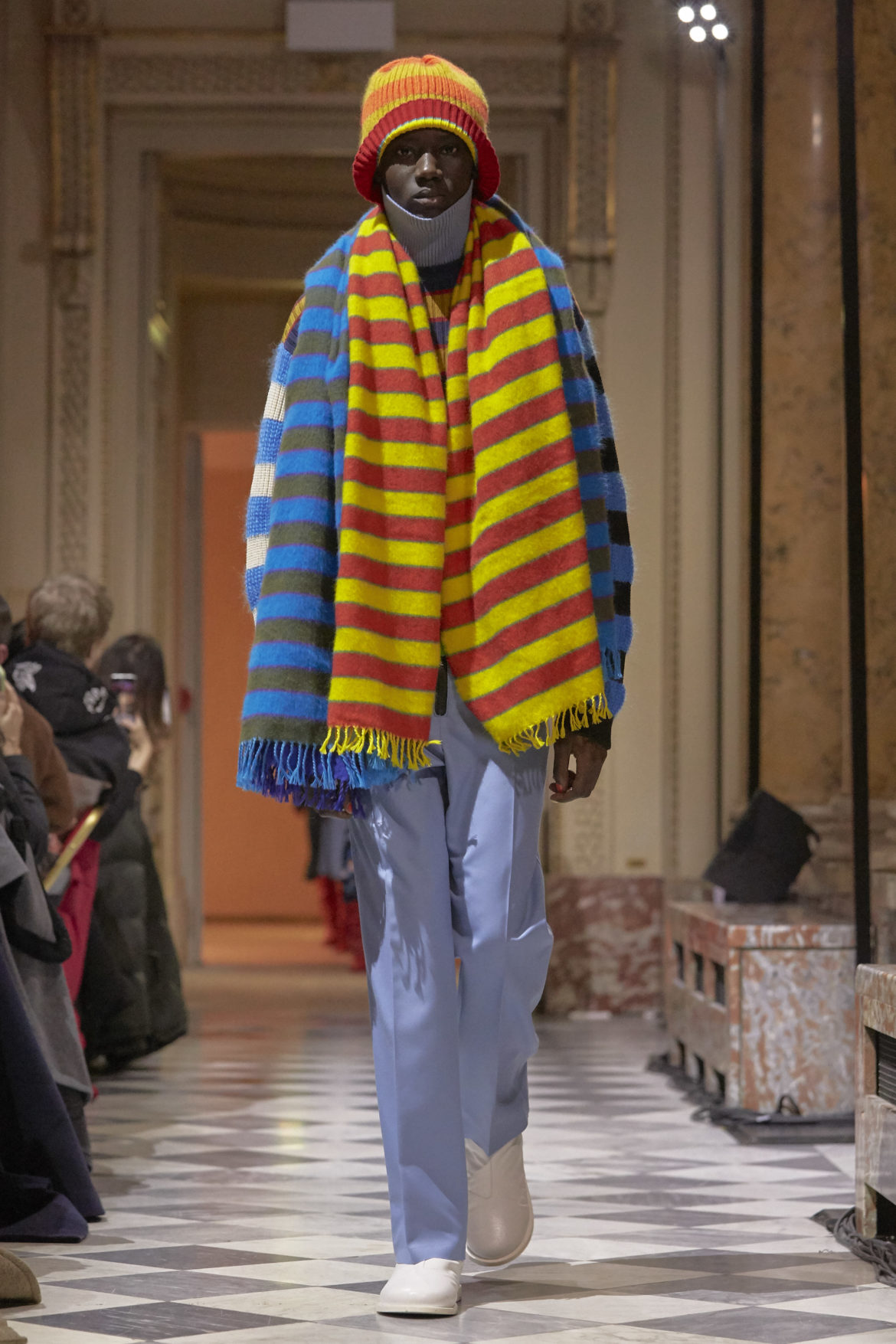 For accessories, calfskin backpacks, bum bags come in sky blue or tapestry jacquard and feature shearling trims. An archive slipper boot was the starting point for the men’s and women’s shearling lined footwear.