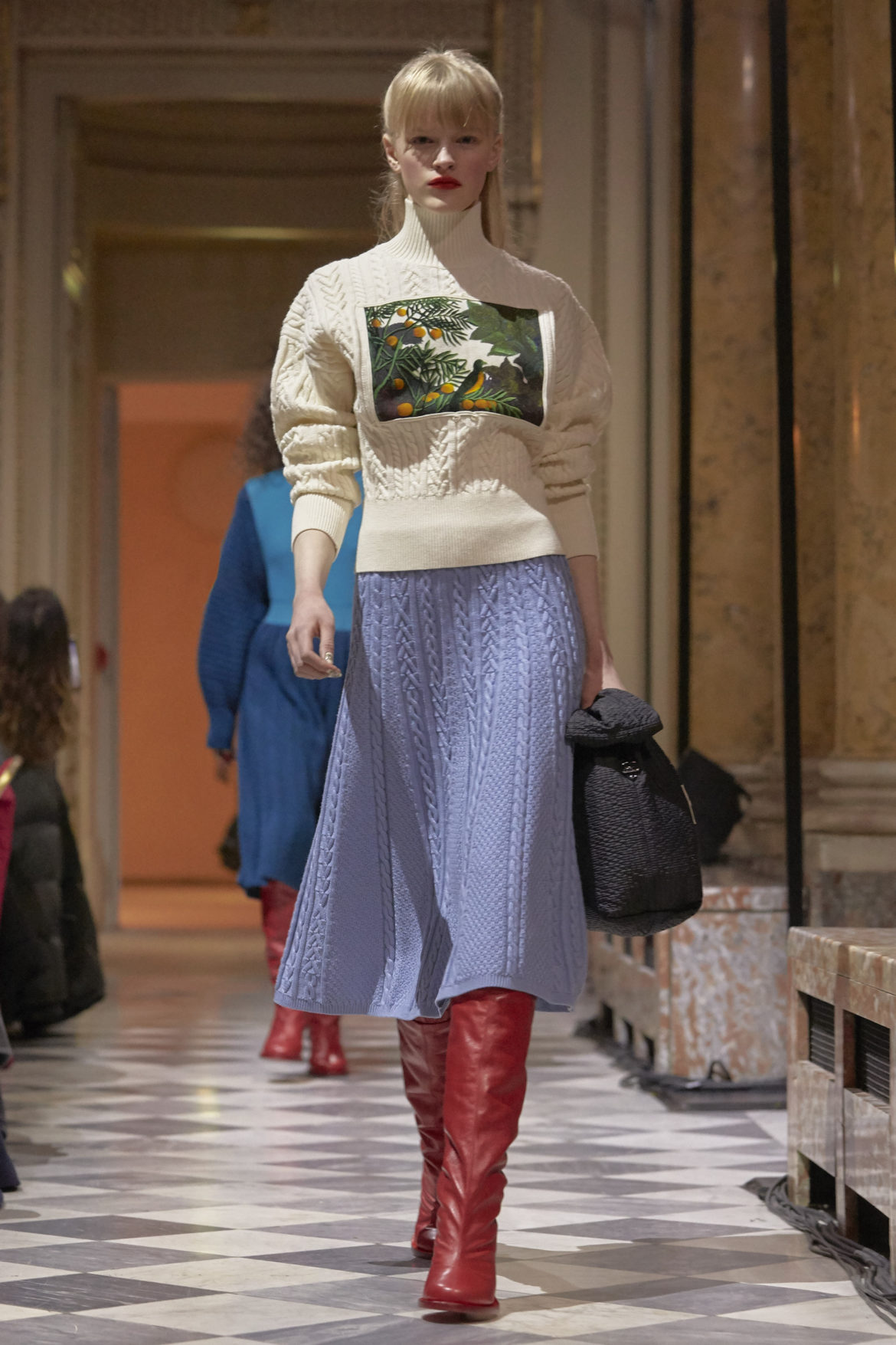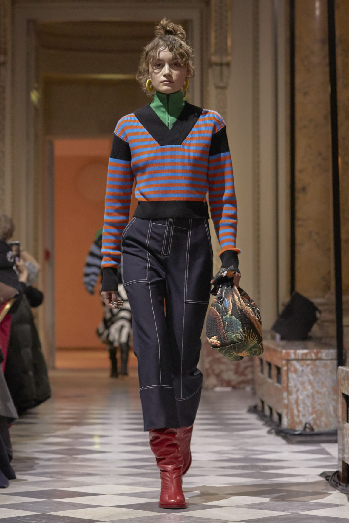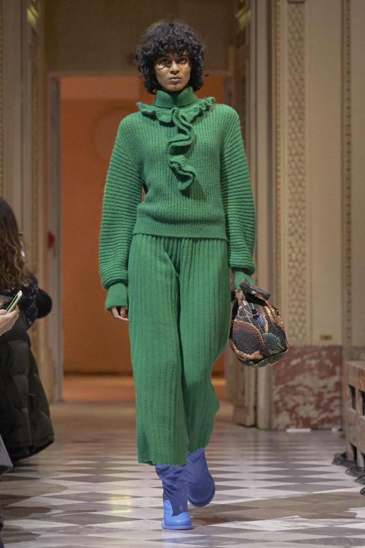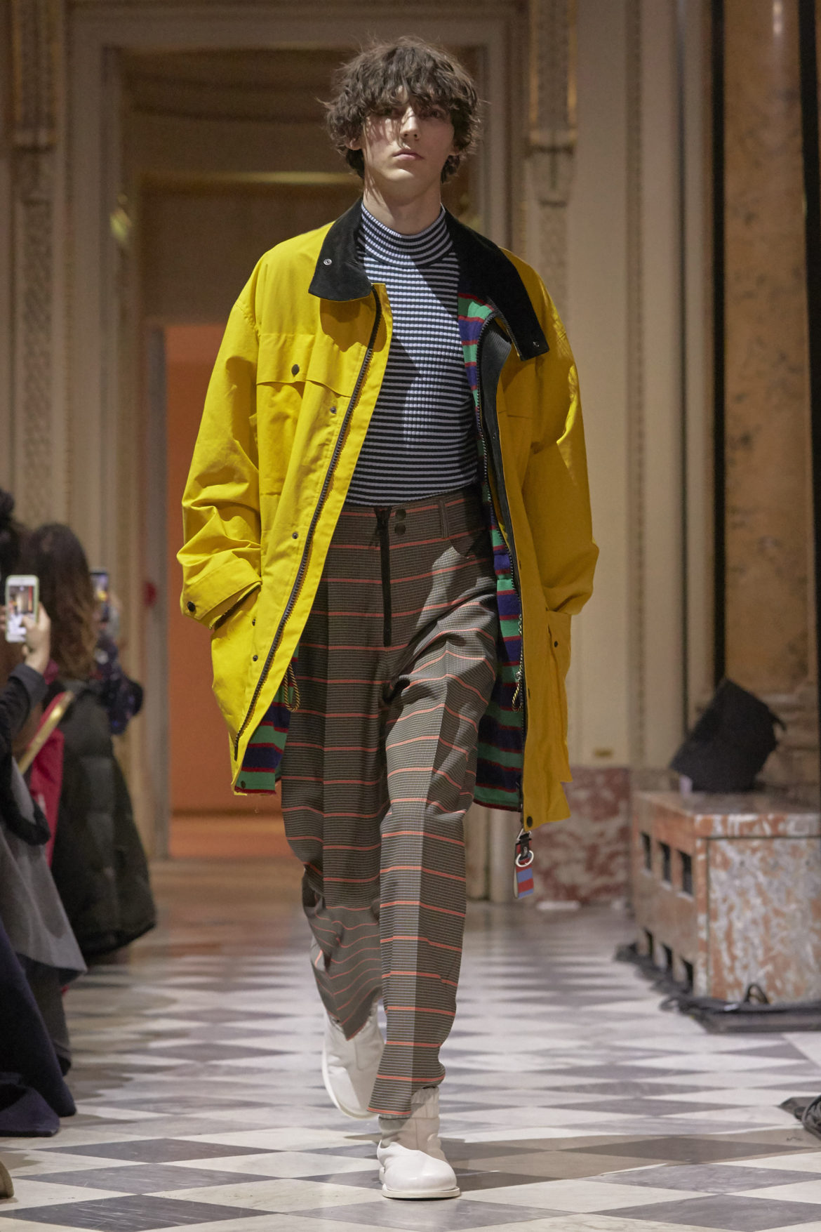 For accessories, calfskin backpacks, bum bags come in sky blue or tapestry jacquard and feature shearling trims. An archive slipper boot was the starting point for the men’s and women’s shearling lined footwear.