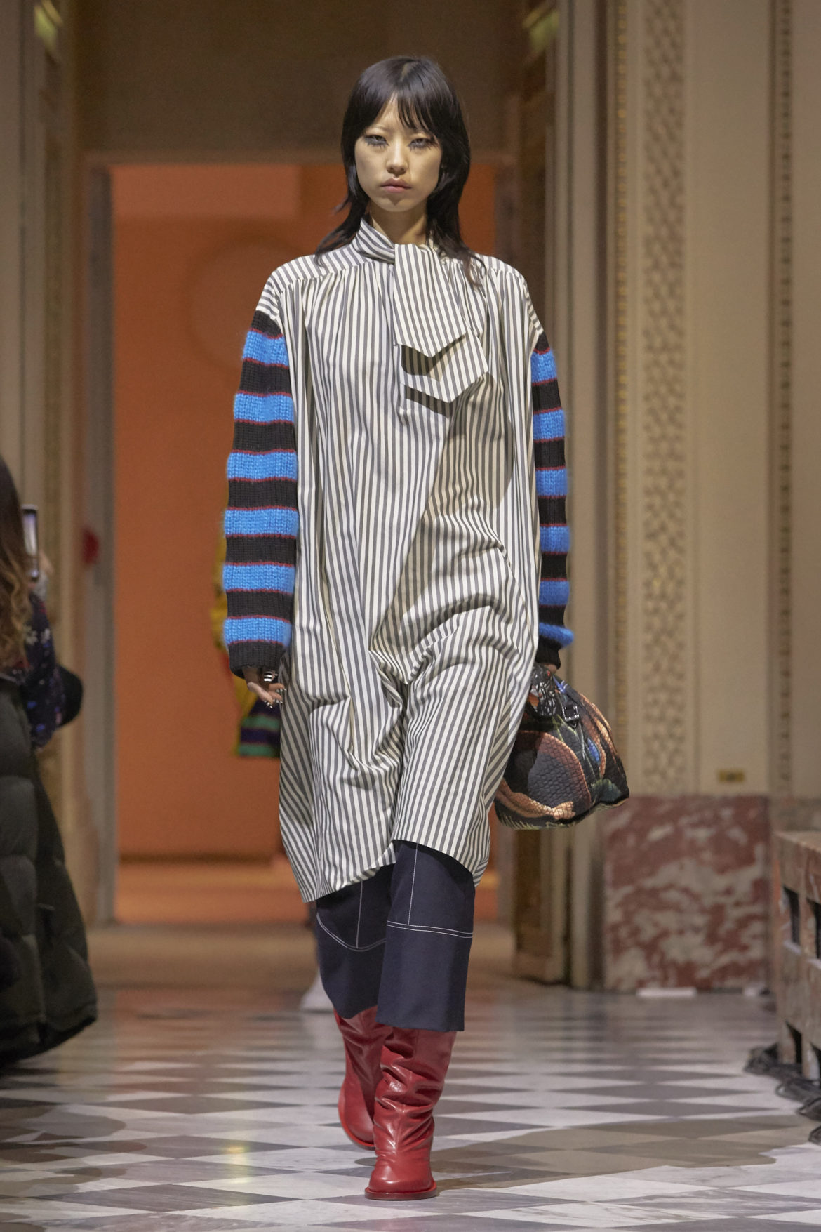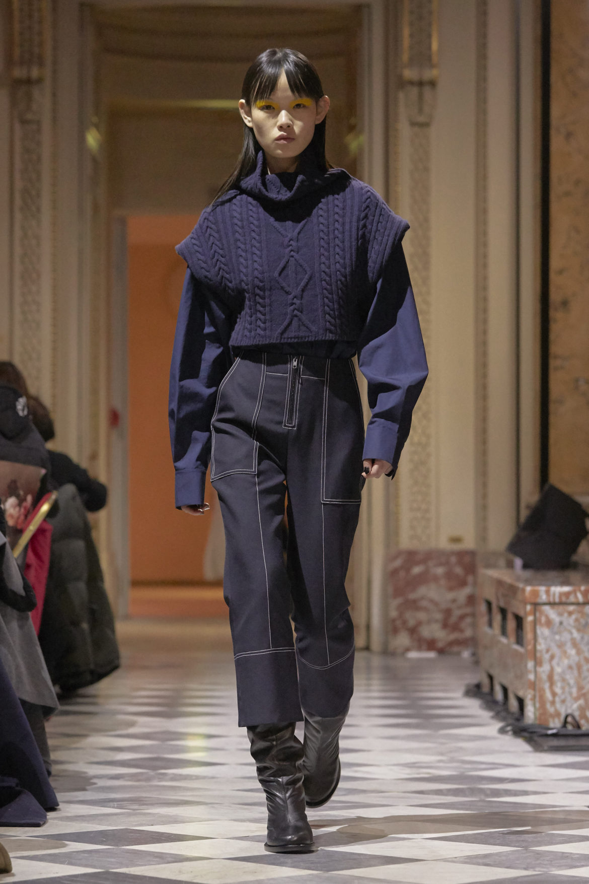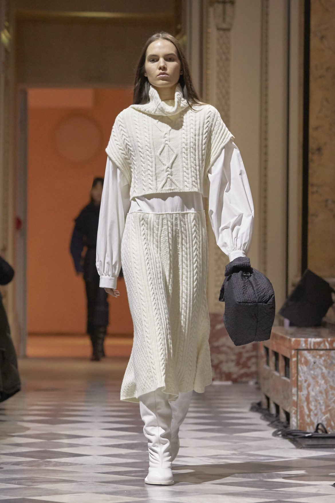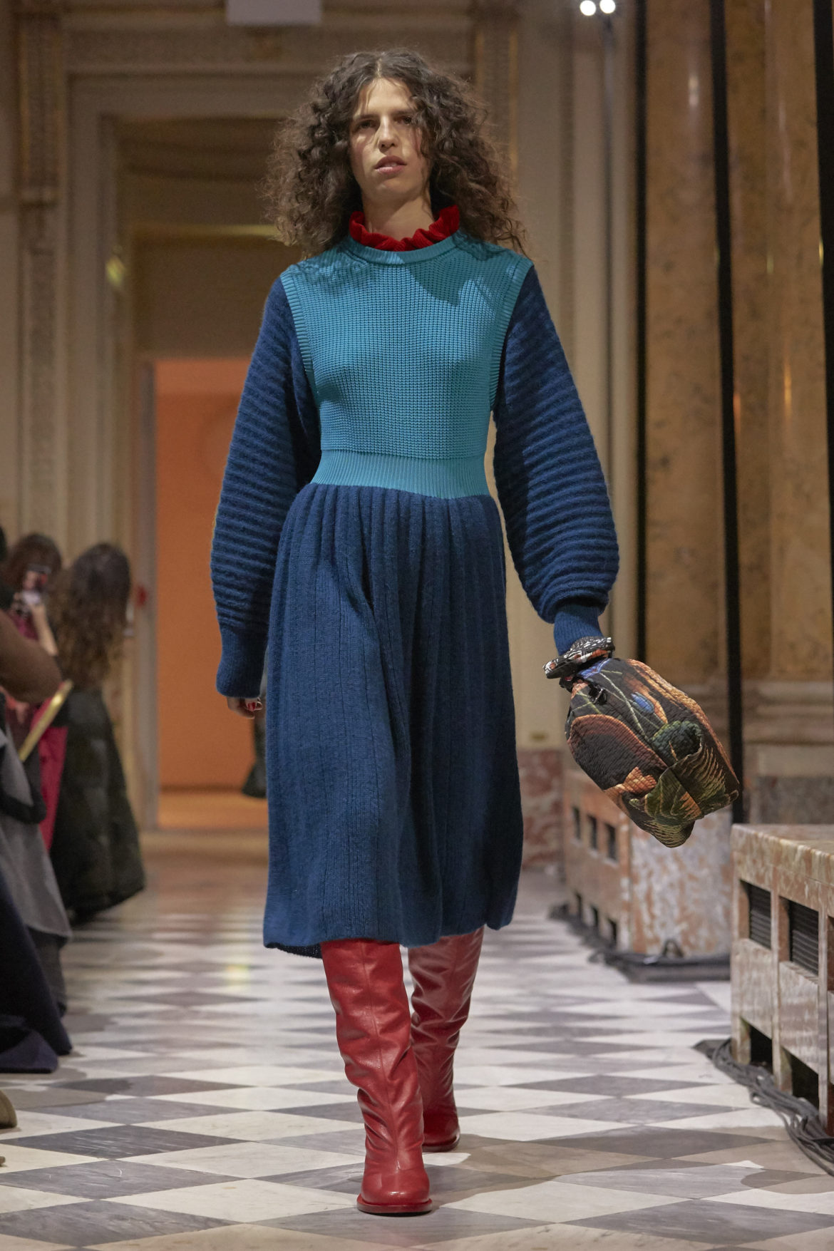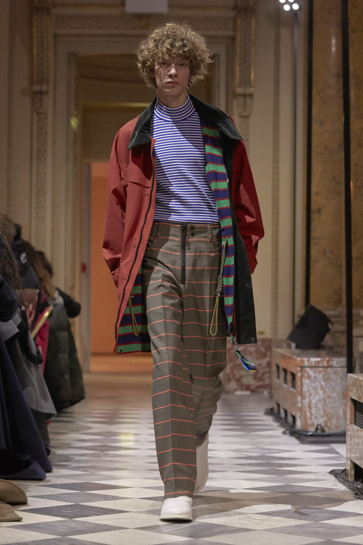 For accessories, calfskin backpacks, bum bags come in sky blue or tapestry jacquard and feature shearling trims. An archive slipper boot was the starting point for the men’s and women’s shearling lined footwear.