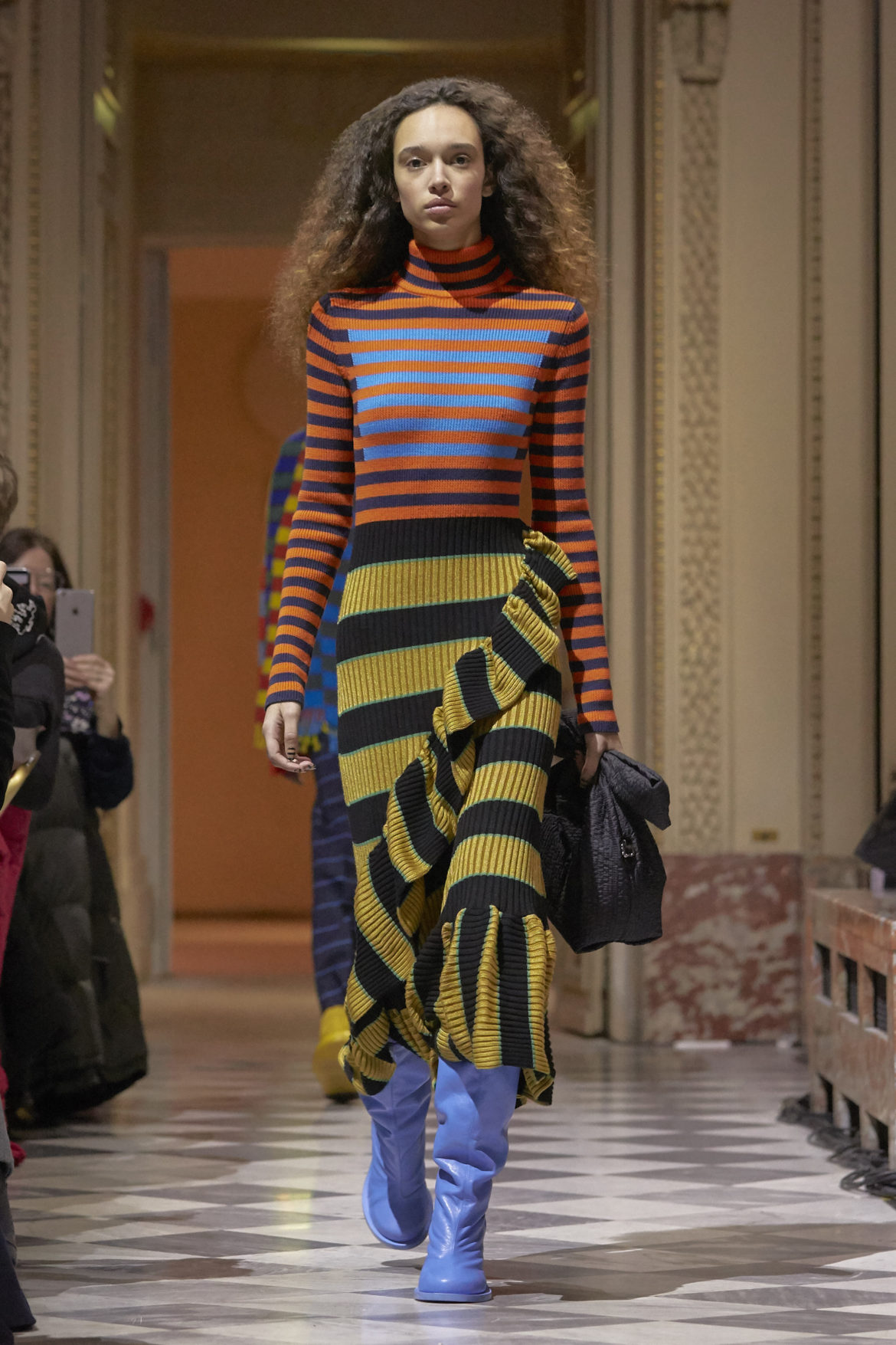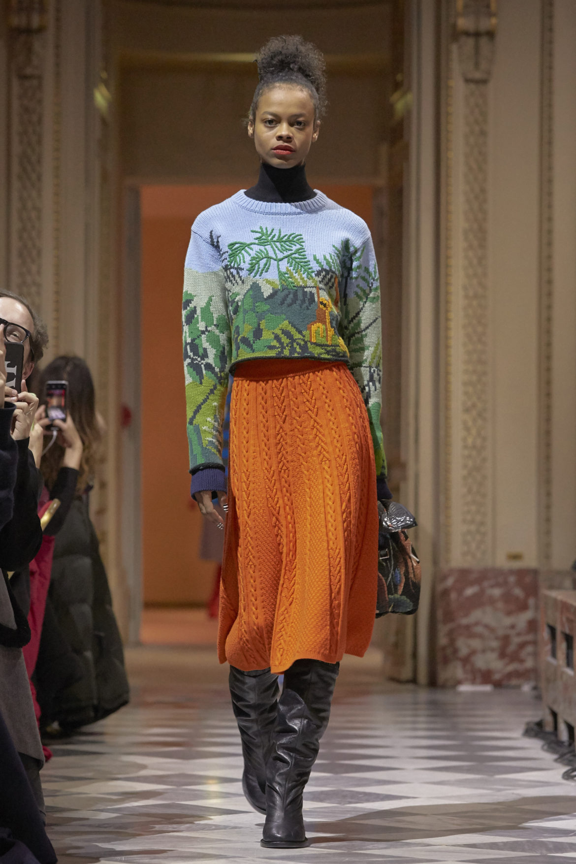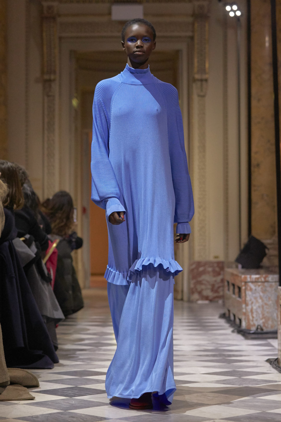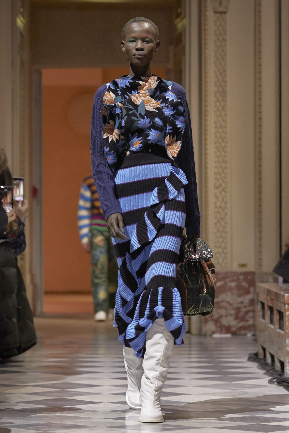 For accessories, calfskin backpacks, bum bags come in sky blue or tapestry jacquard and feature shearling trims. An archive slipper boot was the starting point for the men’s and women’s shearling lined footwear.