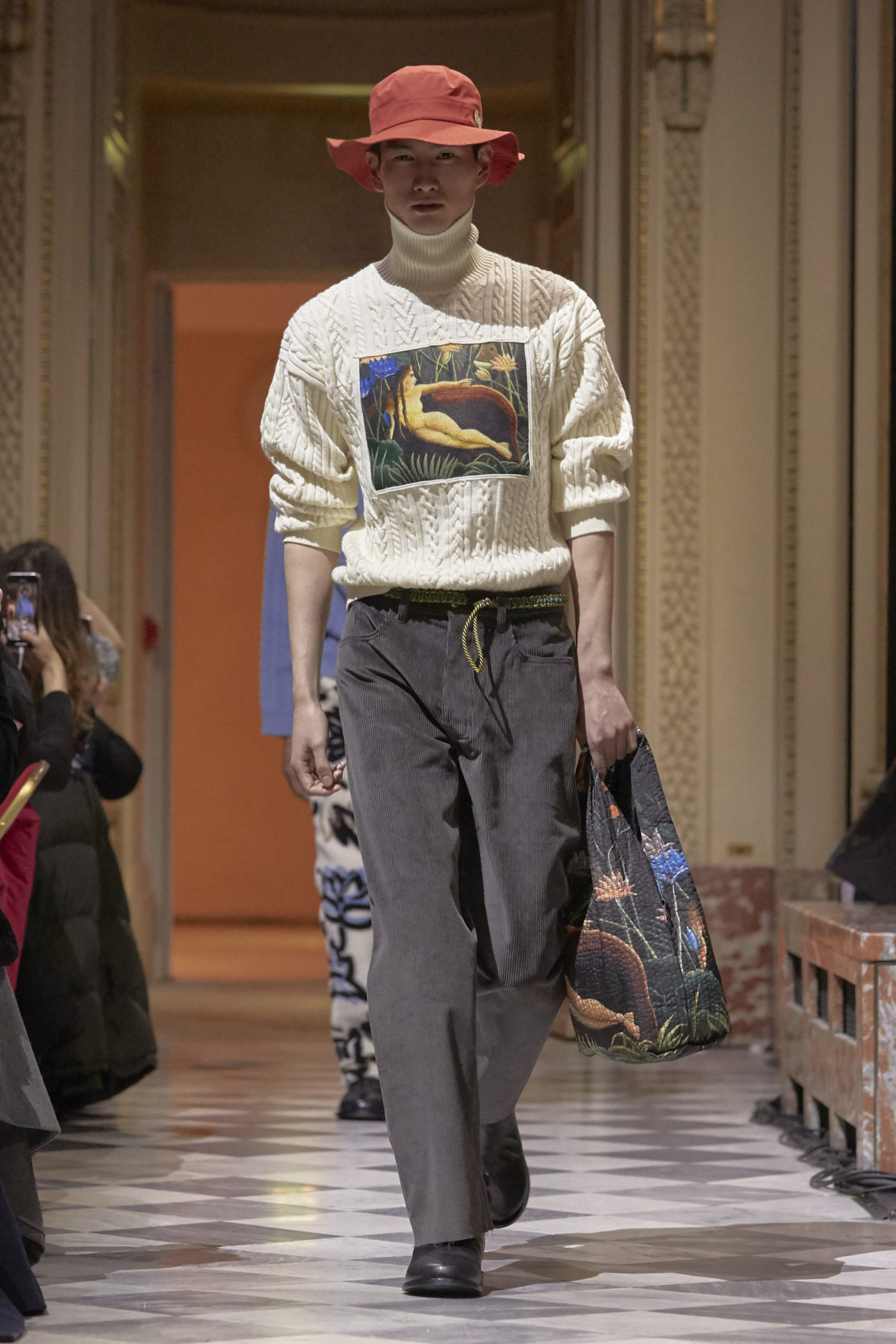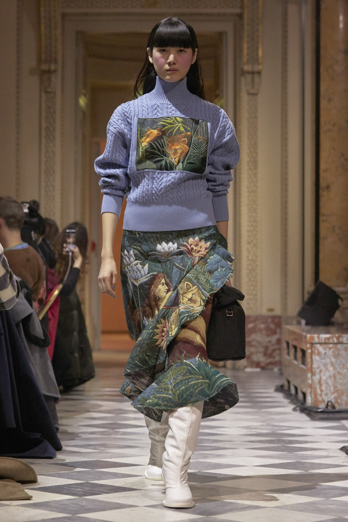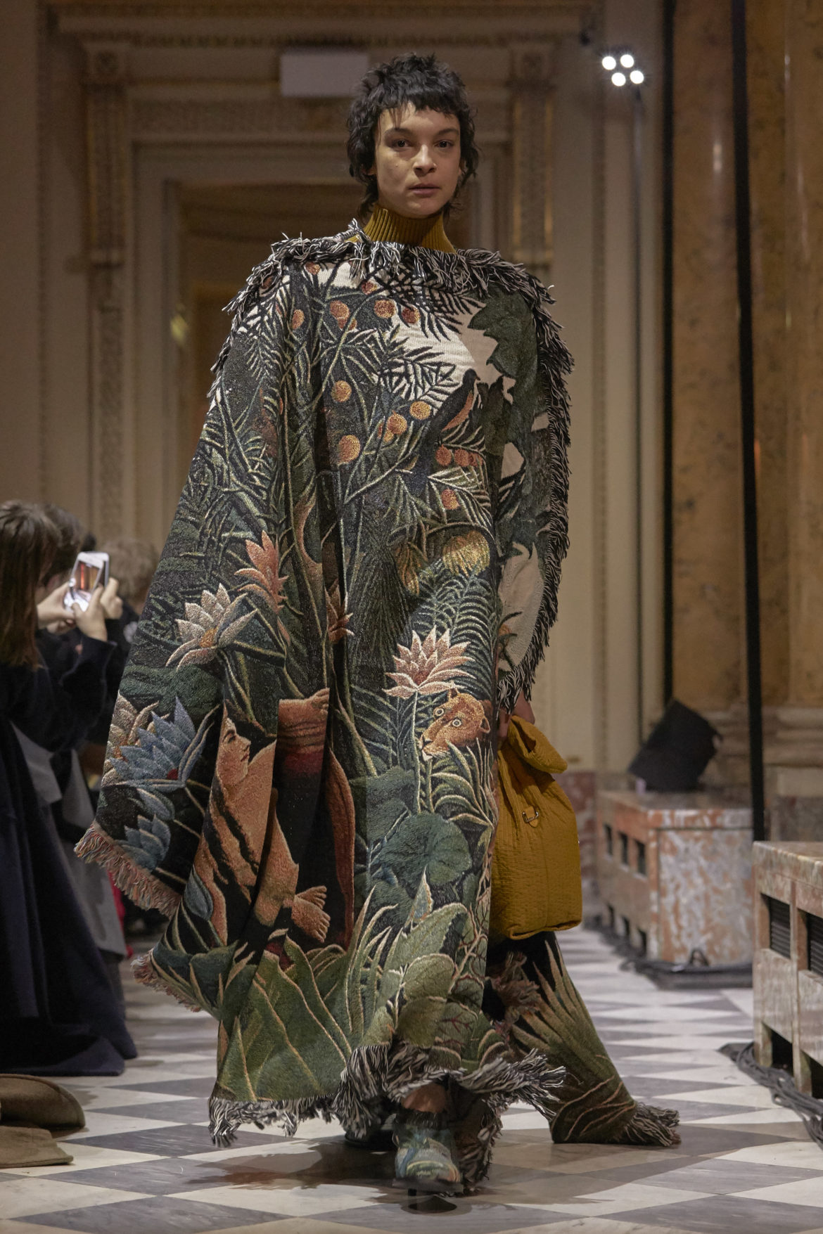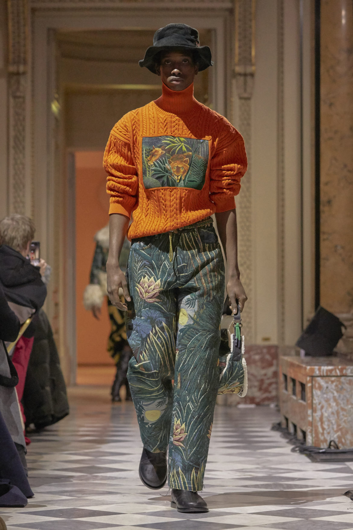 Kenzo’s adoration of the works of “Le Douanier” Rousseau inspired us to create a vibrant, colourful and tapestry led collection for KENZO – La Collection Memento N°3. The importance of knitwear for the house prompted us to honor it in all its guises throughout both the men’s and women’s collections. Archival iconic KENZO striped pieces are transformed into knitted skirts and tops. Three archival striped scarves informed the bright color palette of the knits. Yellows, blues, reds and greens prevail. Henri Rousseau’s “The Dream” is recreated as tapestry jacquards for tops, dresses, shearling coats and trousers. We laud the KENZO ruffle. For women, skirts and tops in a Rousseau flower jacquard offers pops of floral power. For men’s it’s a return to a relaxed silhouette rich in texture. Technical 70’s tailoring or corduroy for trousers and reversible striped coats offer a modern take on traditional classics.