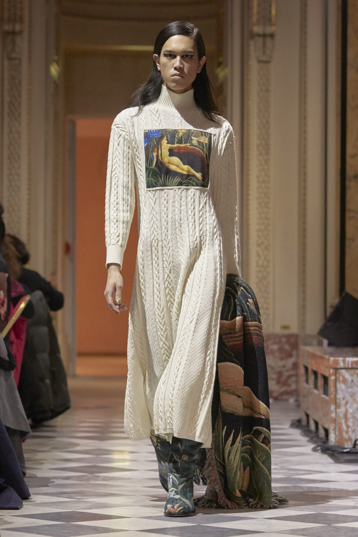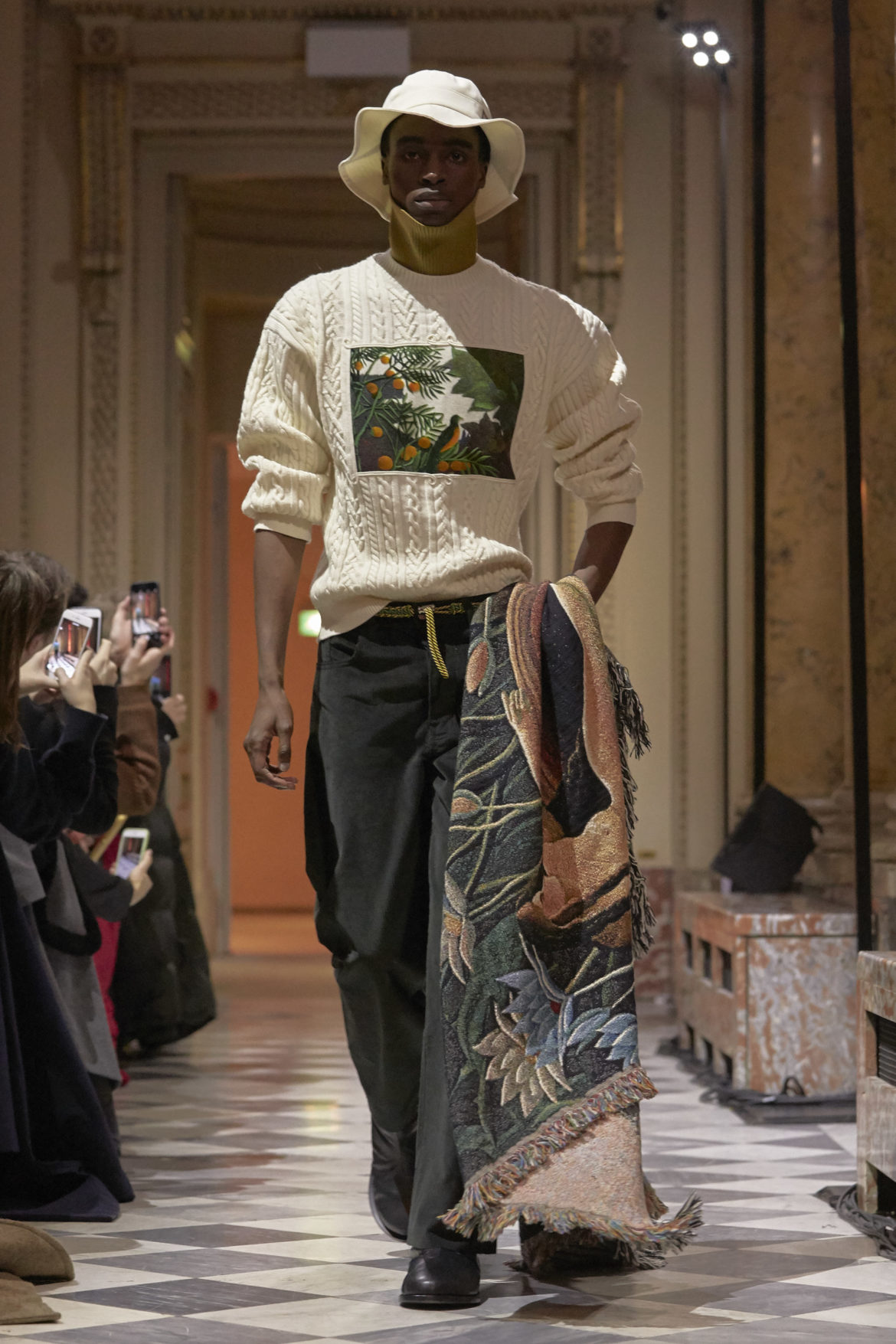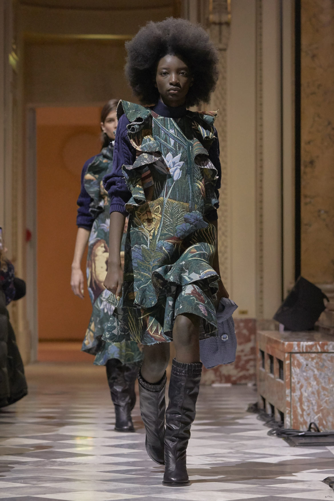 Kenzo’s adoration of the works of “Le Douanier” Rousseau inspired us to create a vibrant, colourful and tapestry led collection for KENZO – La Collection Memento N°3. The importance of knitwear for the house prompted us to honor it in all its guises throughout both the men’s and women’s collections. Archival iconic KENZO striped pieces are transformed into knitted skirts and tops. Three archival striped scarves informed the bright color palette of the knits. Yellows, blues, reds and greens prevail. Henri Rousseau’s “The Dream” is recreated as tapestry jacquards for tops, dresses, shearling coats and trousers. We laud the KENZO ruffle. For women, skirts and tops in a Rousseau flower jacquard offers pops of floral power. For men’s it’s a return to a relaxed silhouette rich in texture. Technical 70’s tailoring or corduroy for trousers and reversible striped coats offer a modern take on traditional classics.