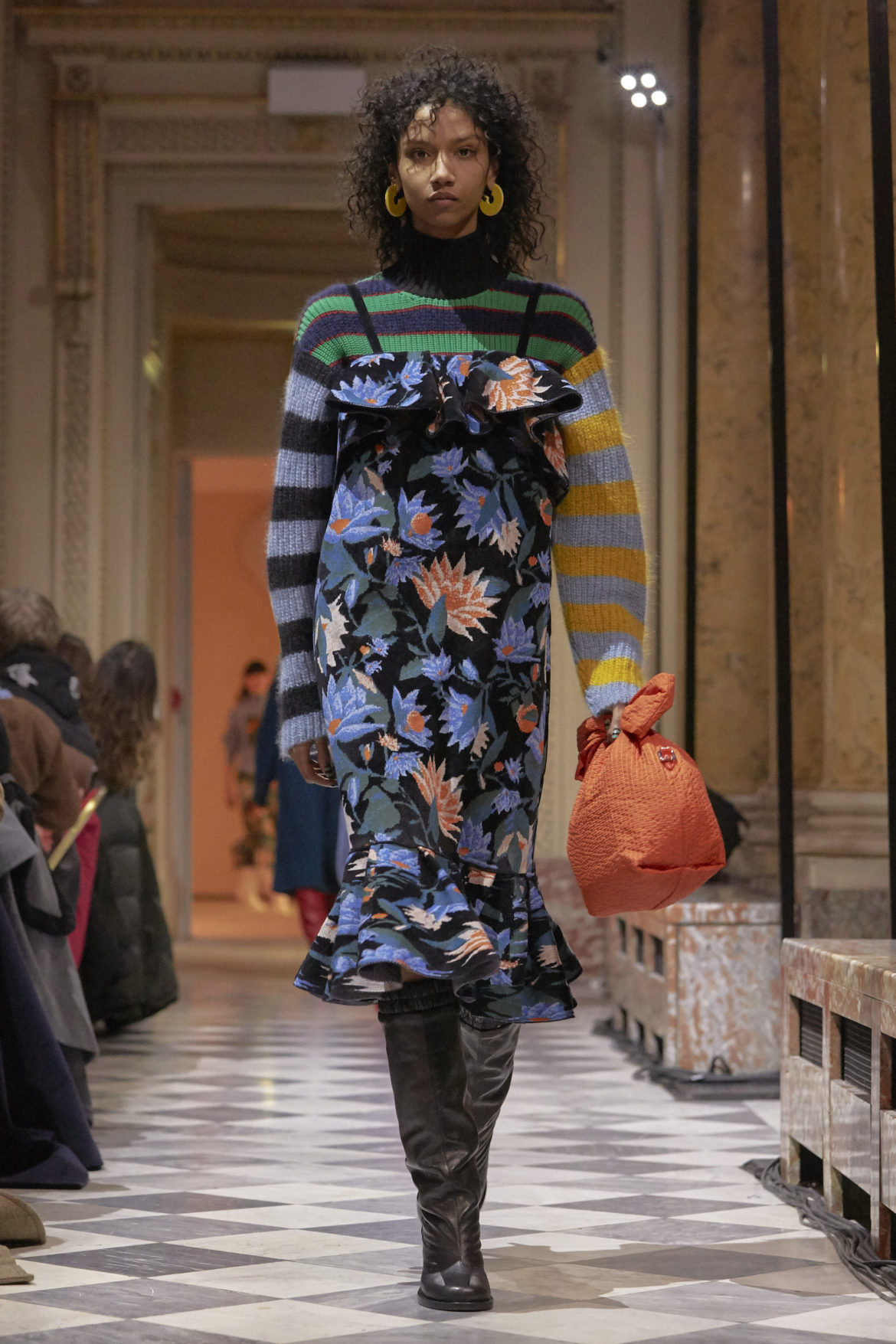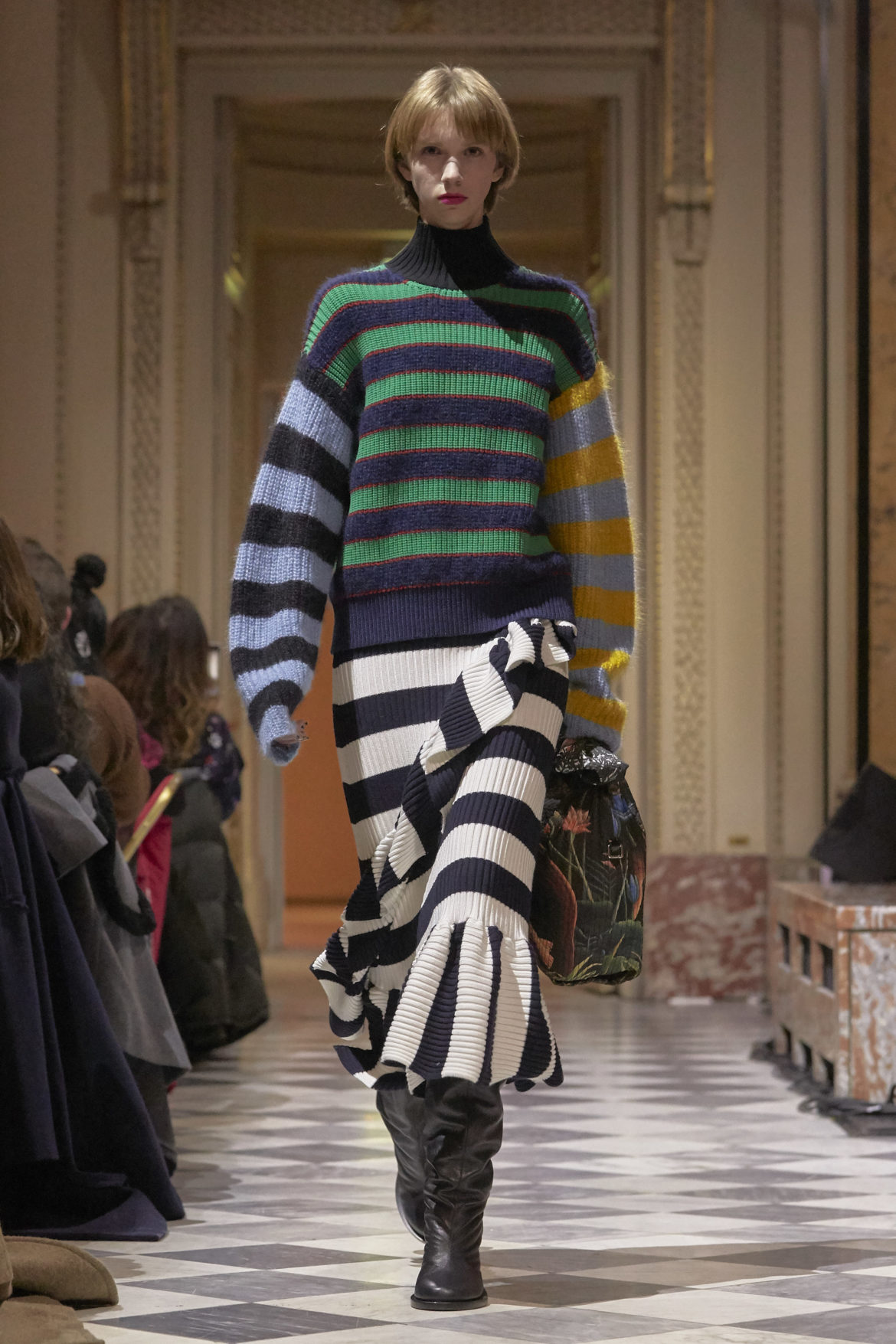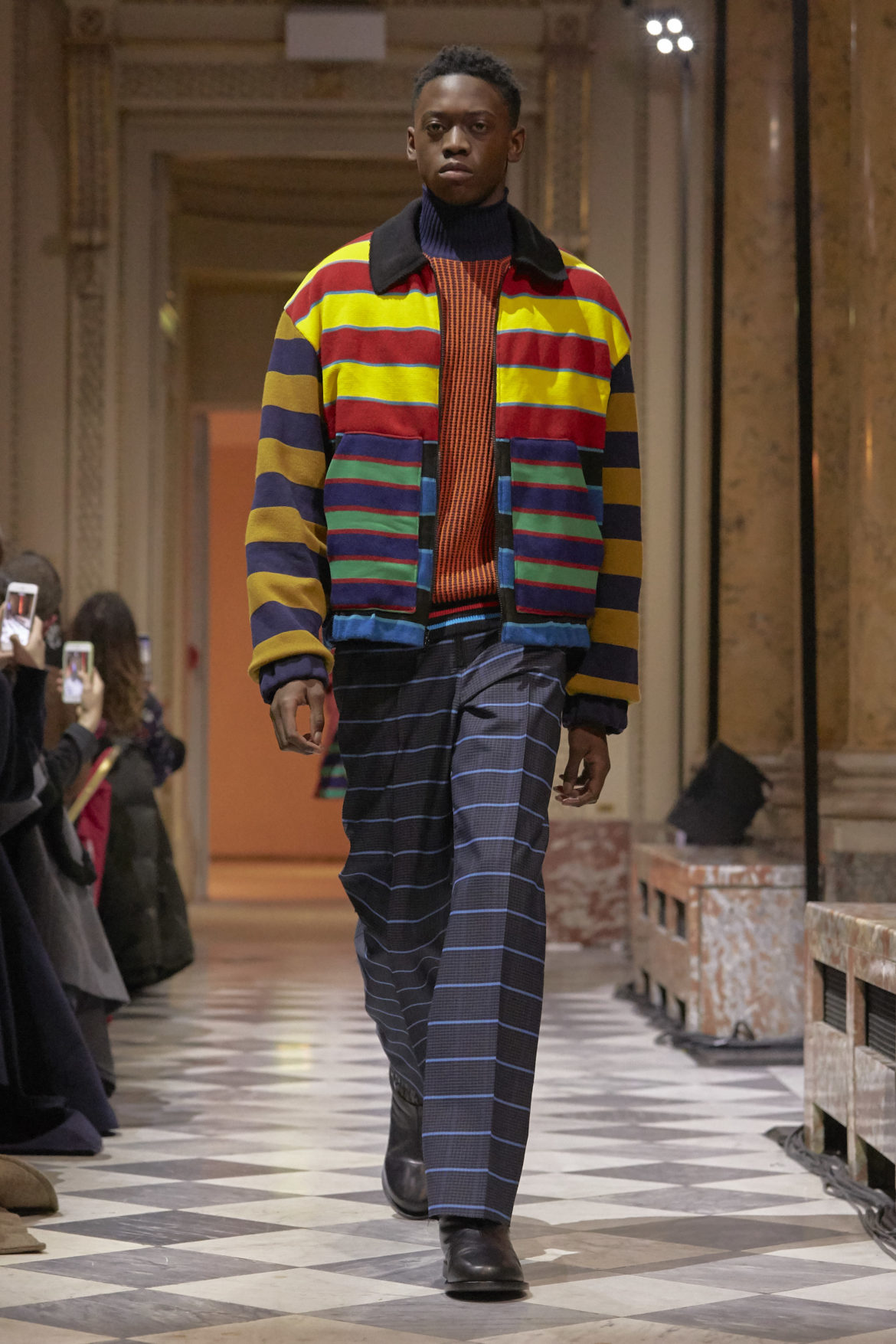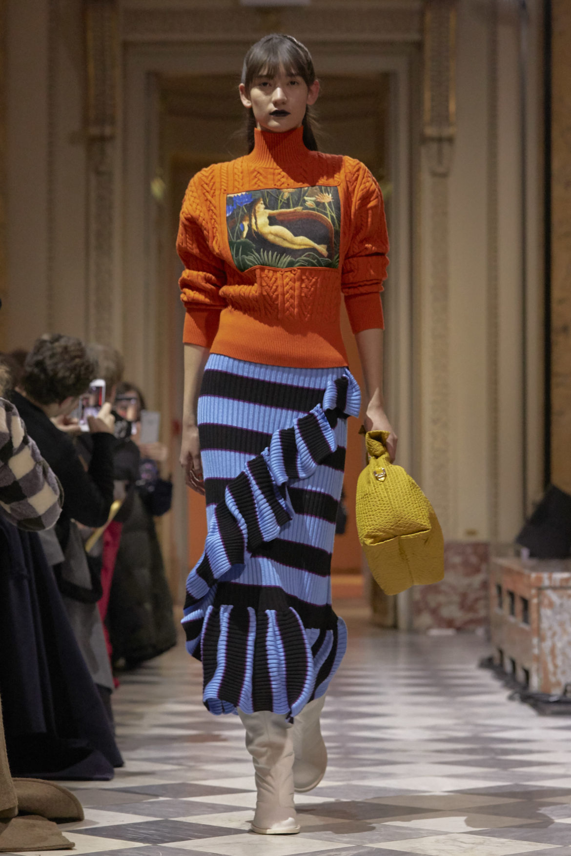 Kenzo’s adoration of the works of “Le Douanier” Rousseau inspired us to create a vibrant, colourful and tapestry led collection for KENZO – La Collection Memento N°3. The importance of knitwear for the house prompted us to honor it in all its guises throughout both the men’s and women’s collections. Archival iconic KENZO striped pieces are transformed into knitted skirts and tops. Three archival striped scarves informed the bright color palette of the knits. Yellows, blues, reds and greens prevail. Henri Rousseau’s “The Dream” is recreated as tapestry jacquards for tops, dresses, shearling coats and trousers. We laud the KENZO ruffle. For women, skirts and tops in a Rousseau flower jacquard offers pops of floral power. For men’s it’s a return to a relaxed silhouette rich in texture. Technical 70’s tailoring or corduroy for trousers and reversible striped coats offer a modern take on traditional classics.