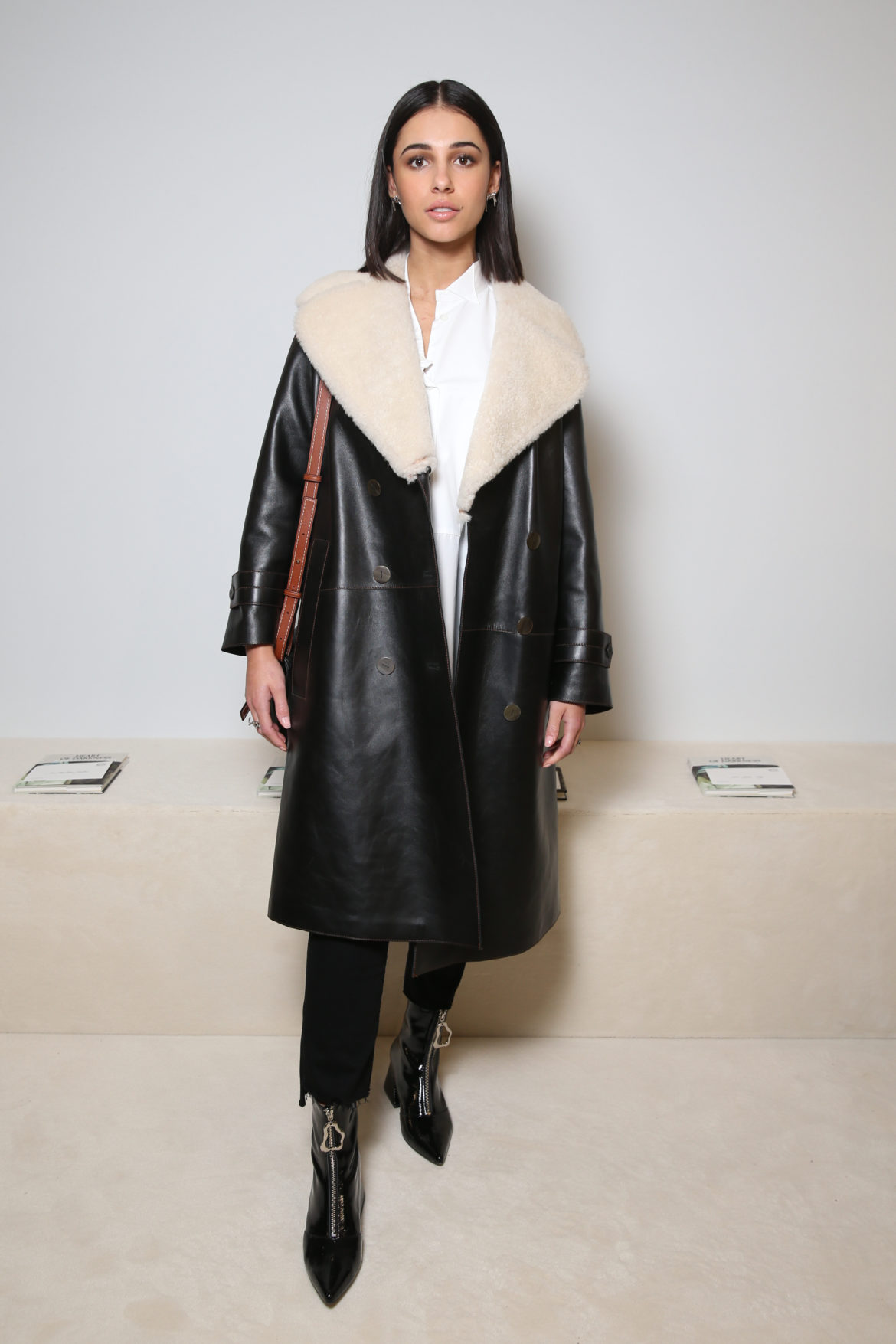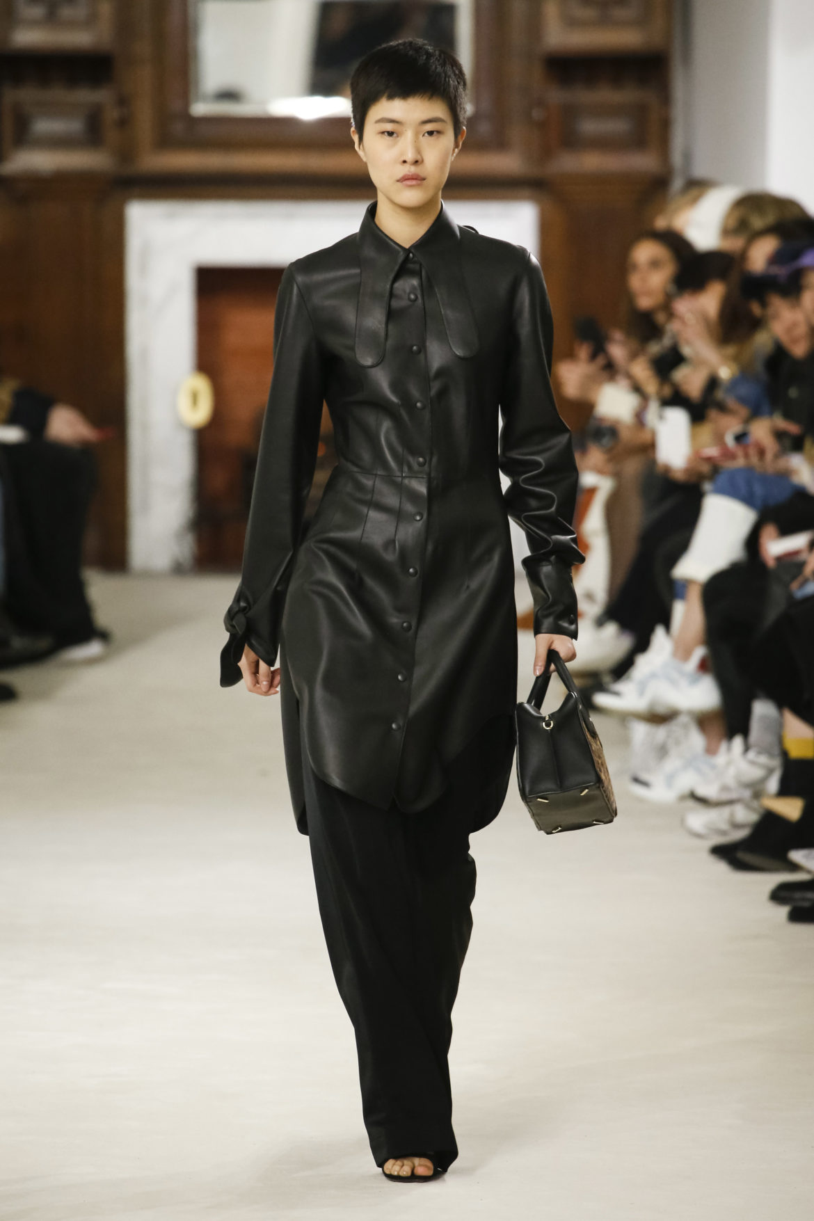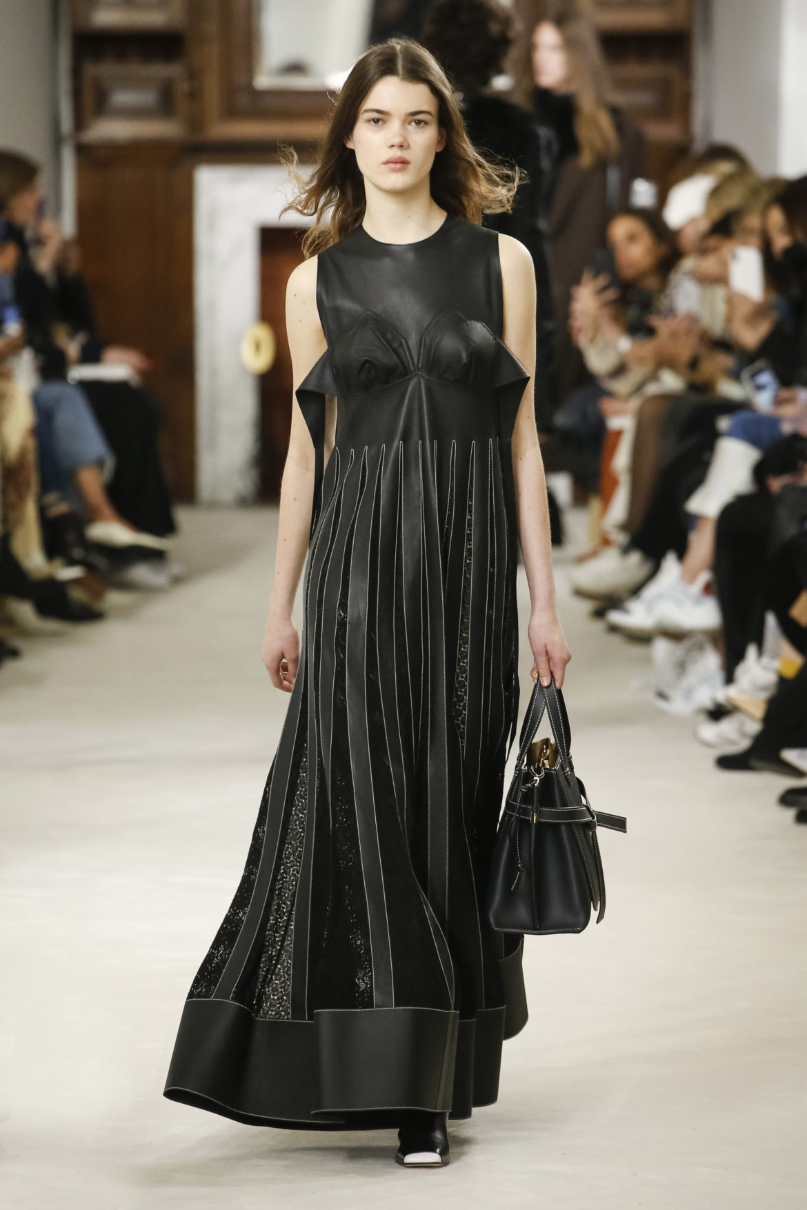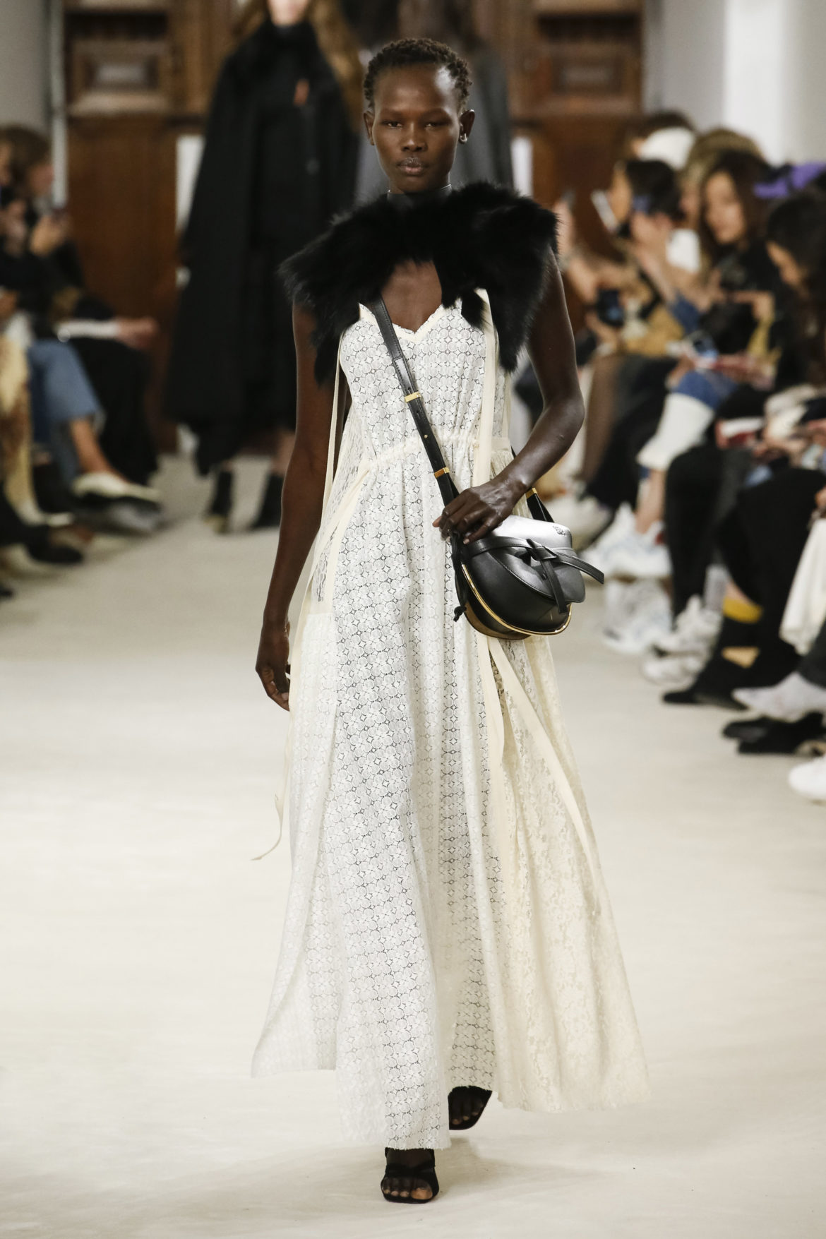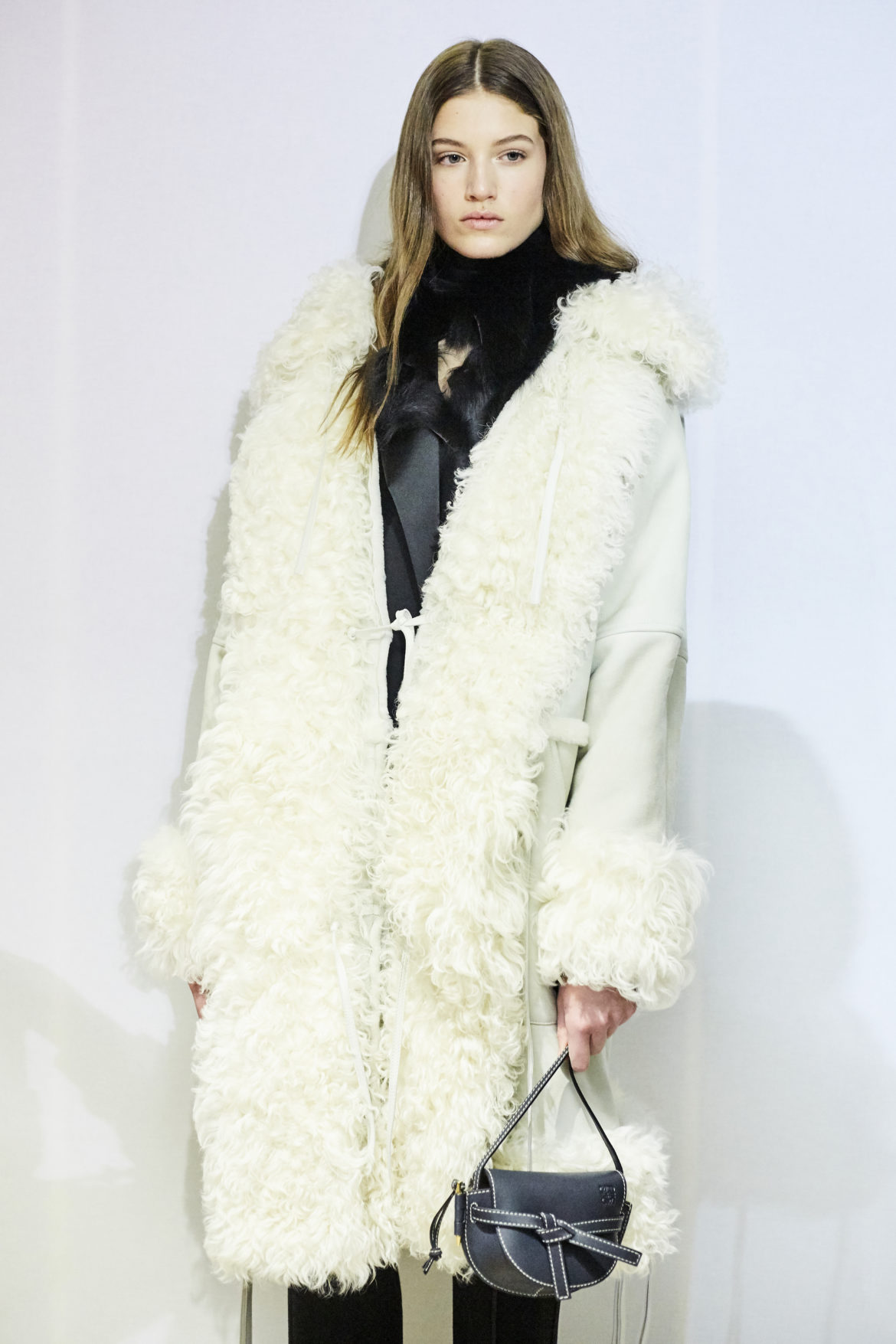 Embracing LOEWE tradition, leather is worked as both surface and adornment. Smooth topstitched calfskin imposes structure on cotton plissé dresses, is spliced through lace, or falls in vertical panels down soft smocks and trousers. Flared coats and capes create ample volume in at gabardine, plush shearling, or raw-cut optical jacquard.