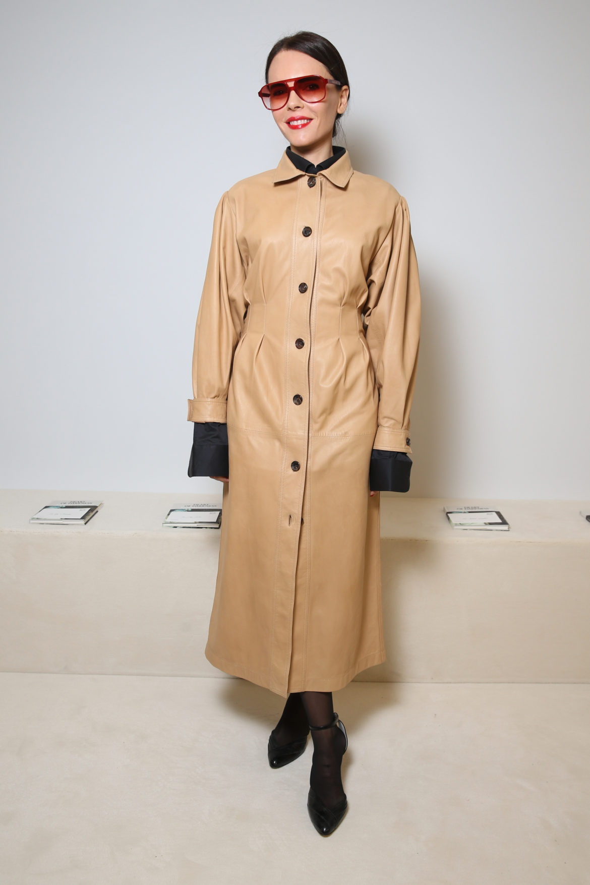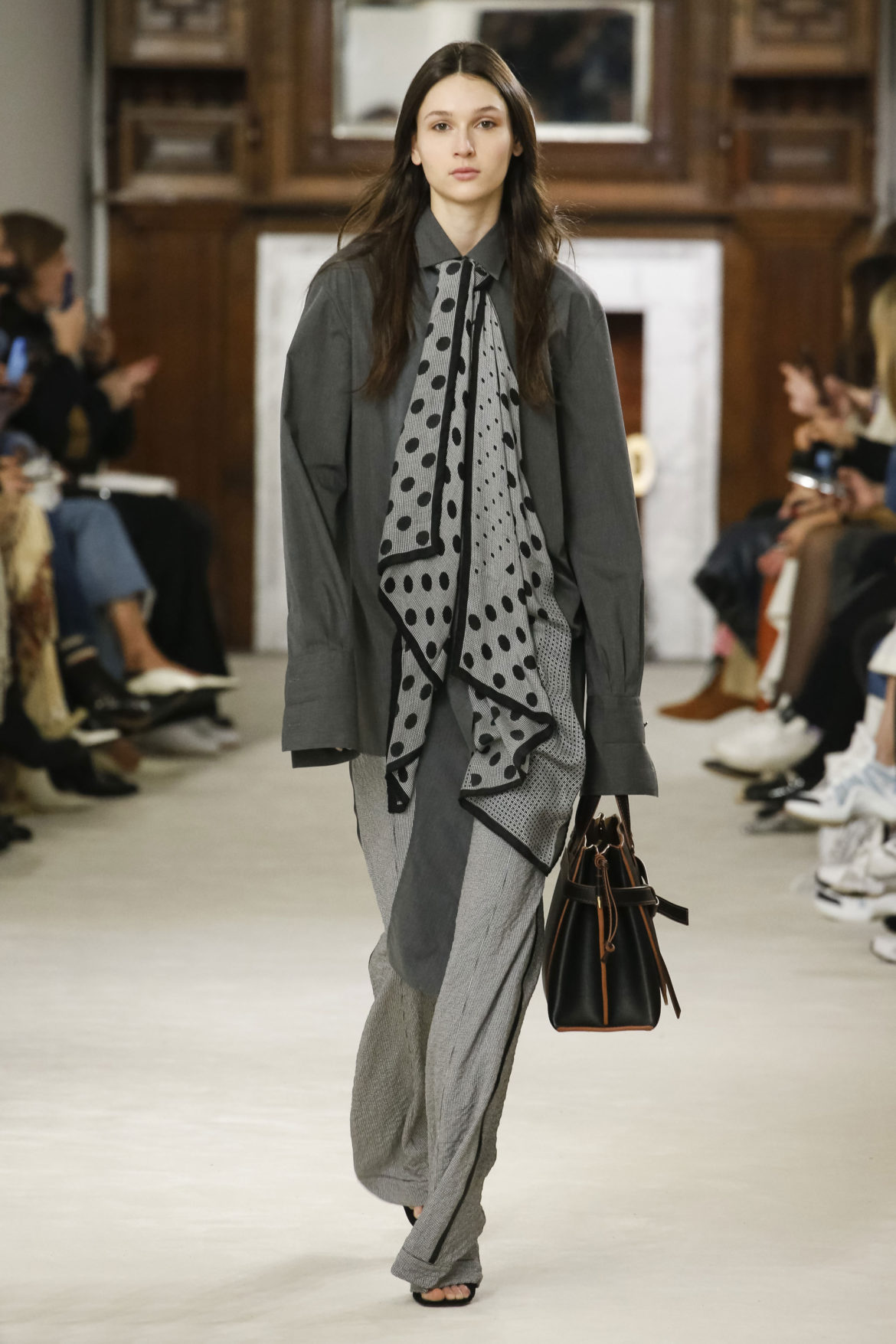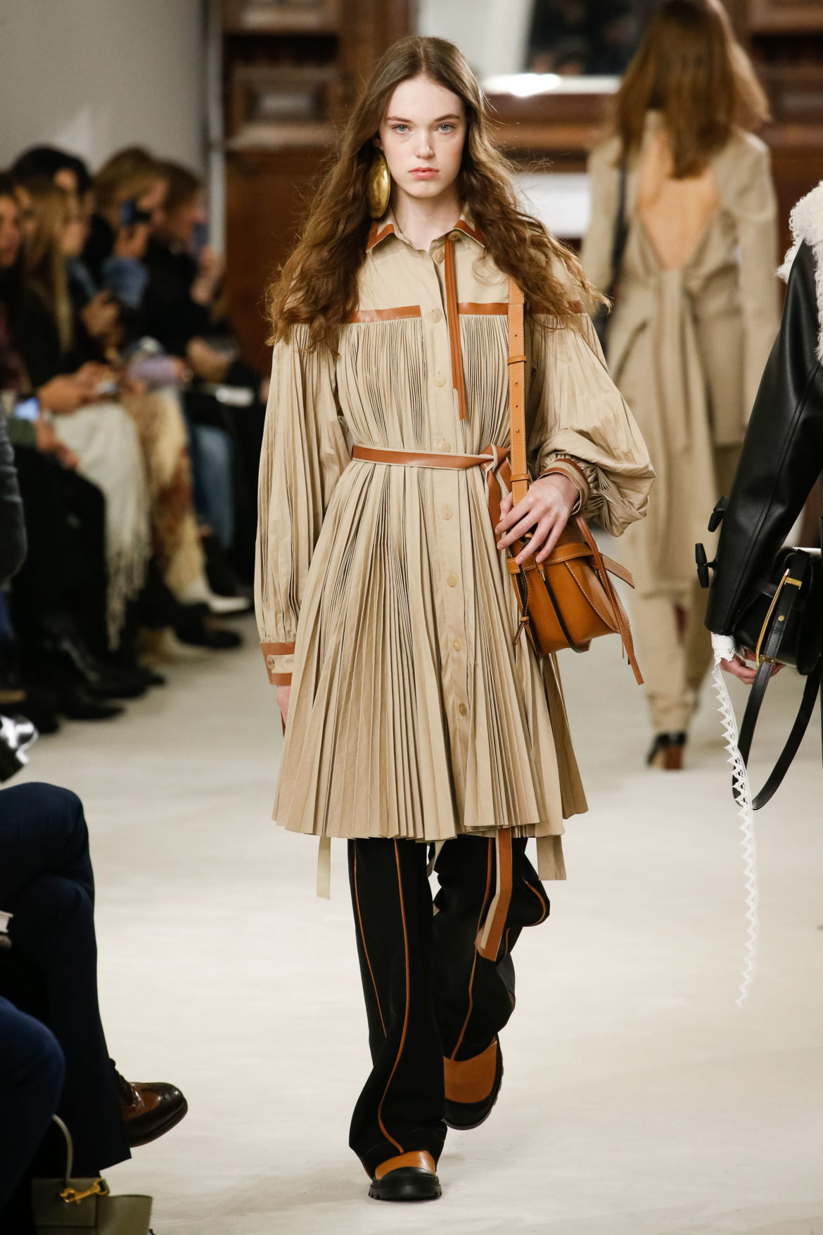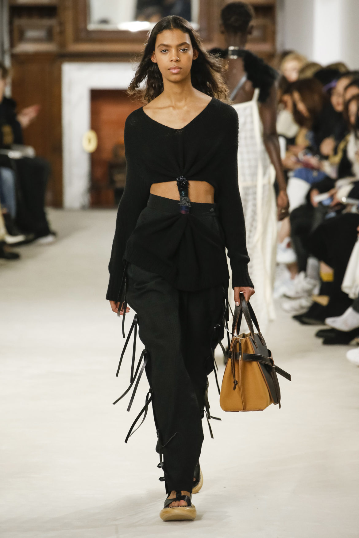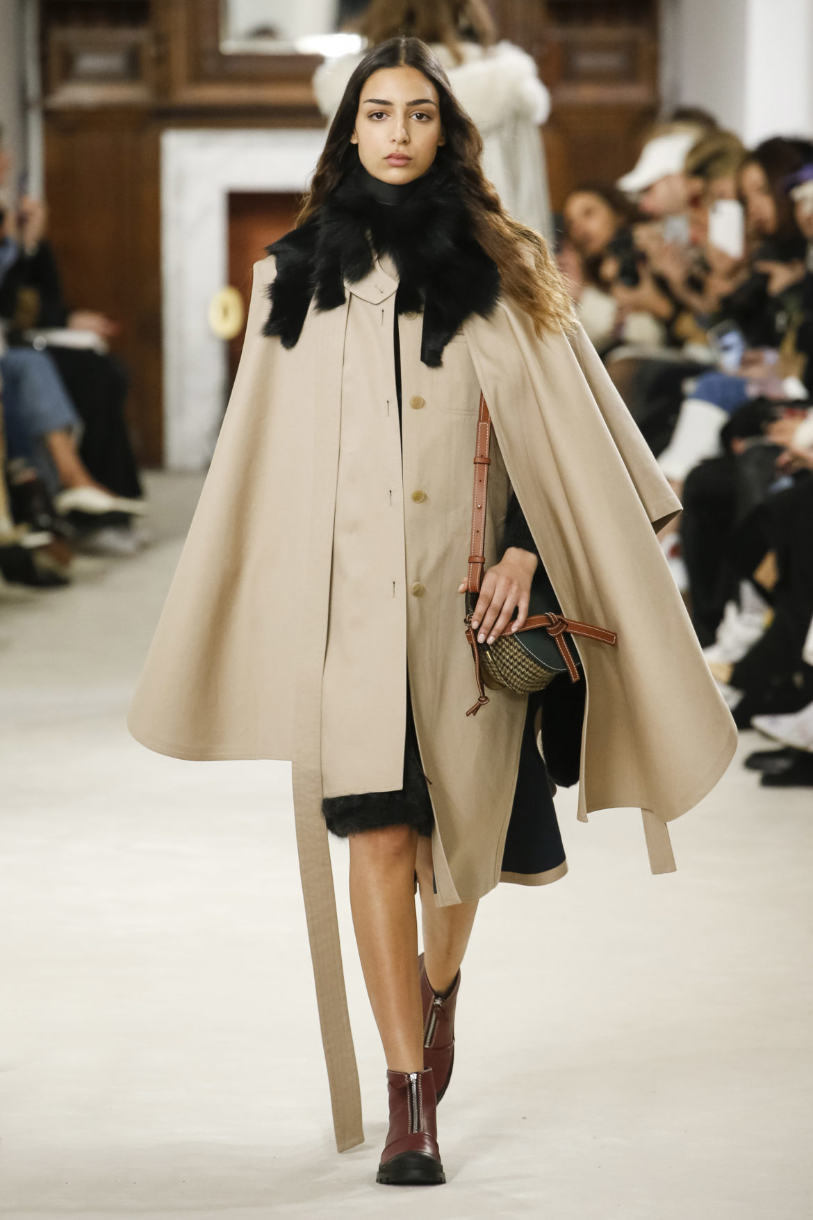 Embracing LOEWE tradition, leather is worked as both surface and adornment. Smooth topstitched calfskin imposes structure on cotton plissé dresses, is spliced through lace, or falls in vertical panels down soft smocks and trousers. Flared coats and capes create ample volume in at gabardine, plush shearling, or raw-cut optical jacquard.