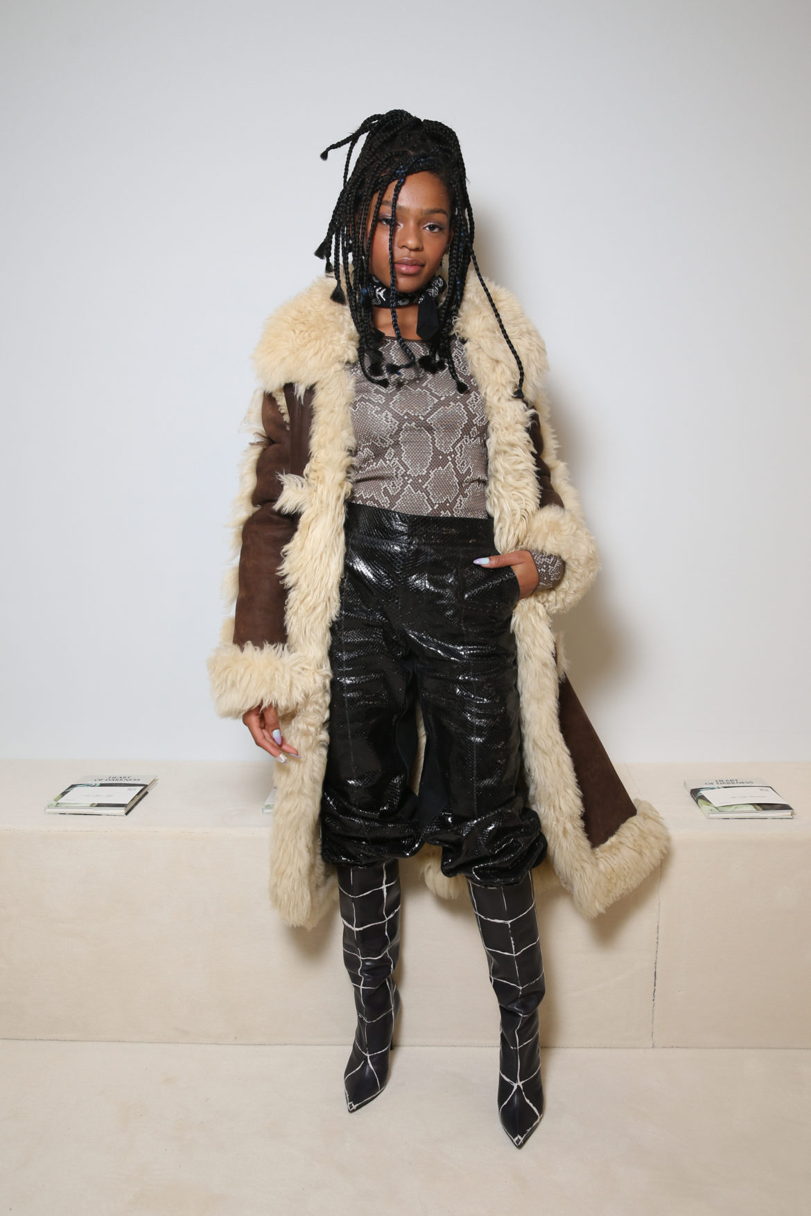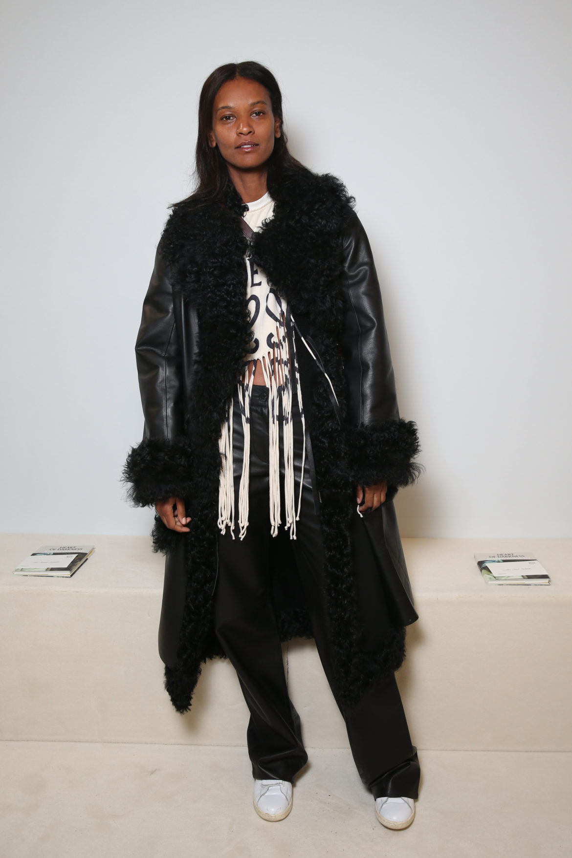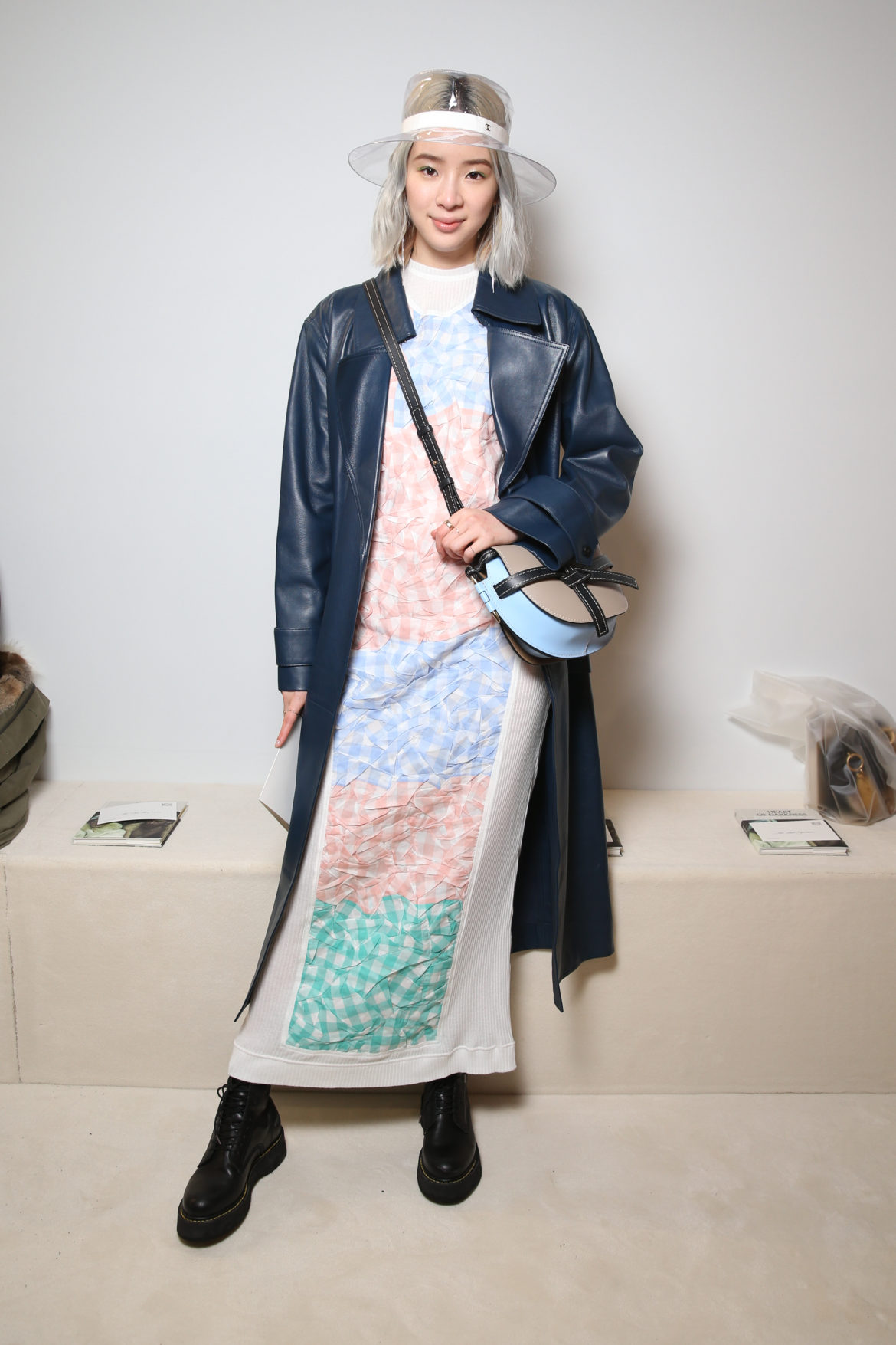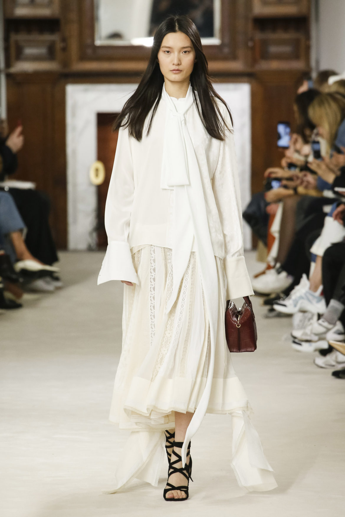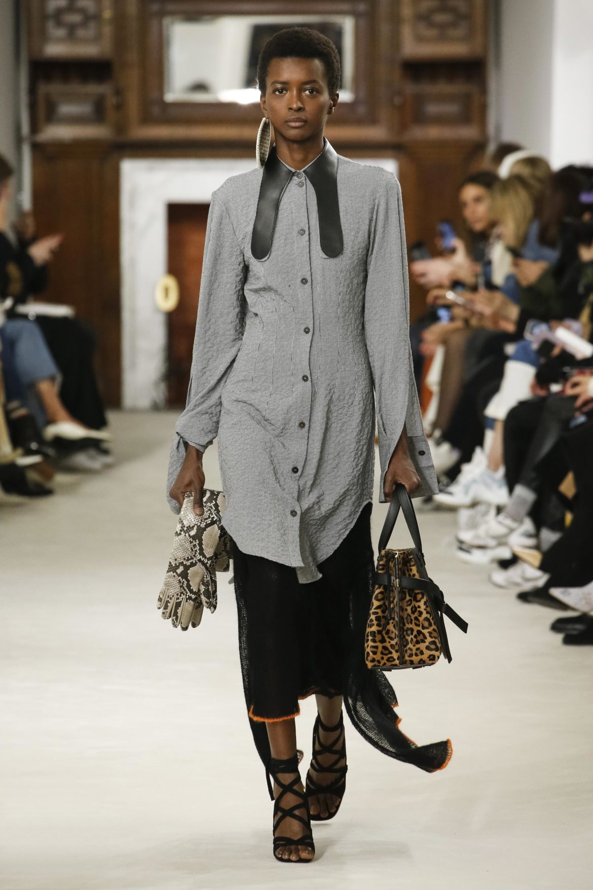 Embracing LOEWE tradition, leather is worked as both surface and adornment. Smooth topstitched calfskin imposes structure on cotton plissé dresses, is spliced through lace, or falls in vertical panels down soft smocks and trousers. Flared coats and capes create ample volume in at gabardine, plush shearling, or raw-cut optical jacquard.