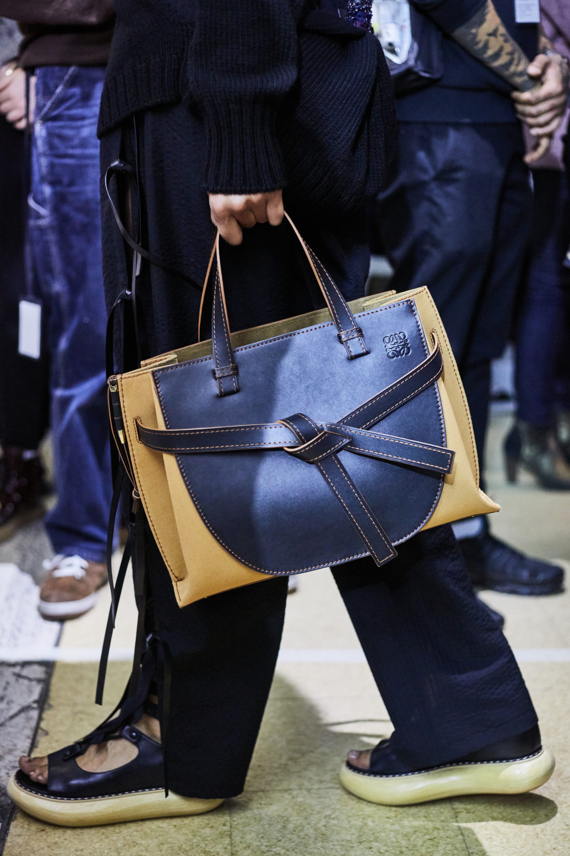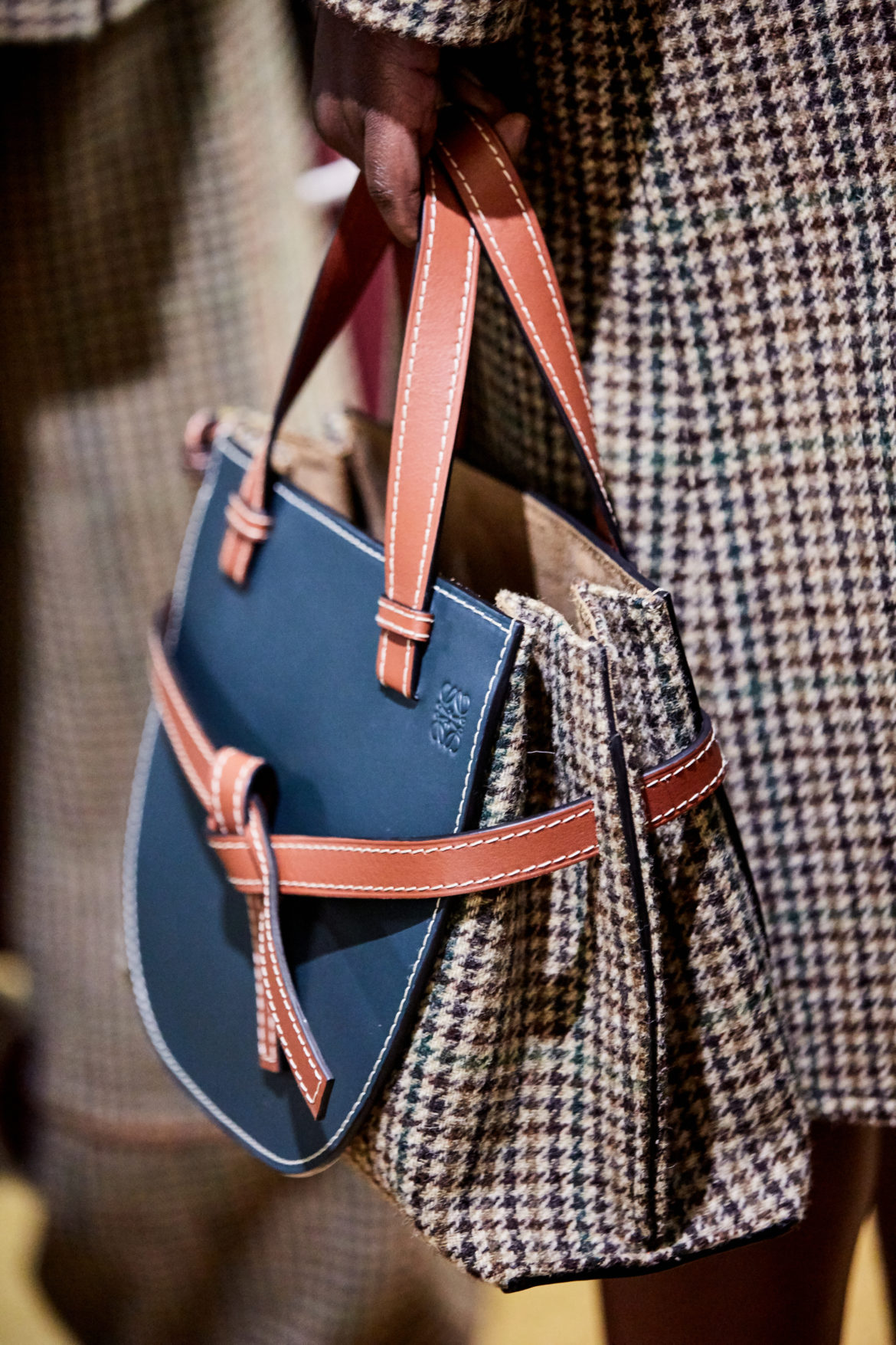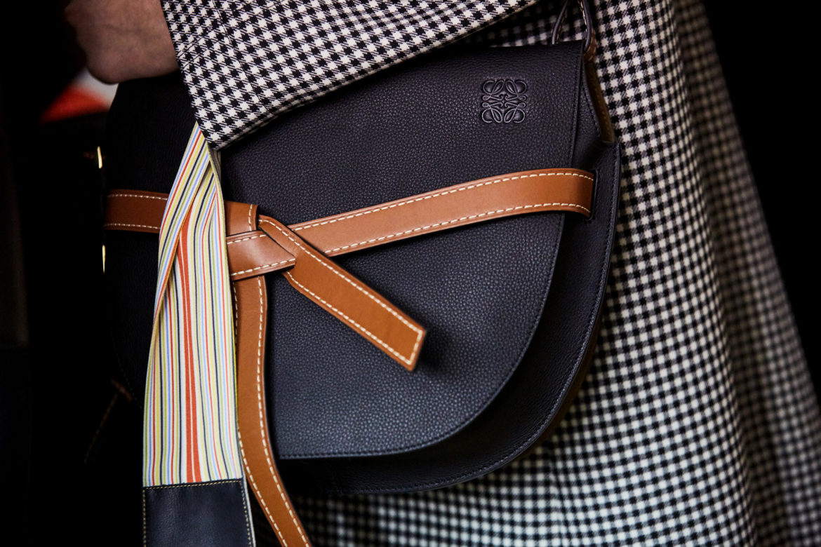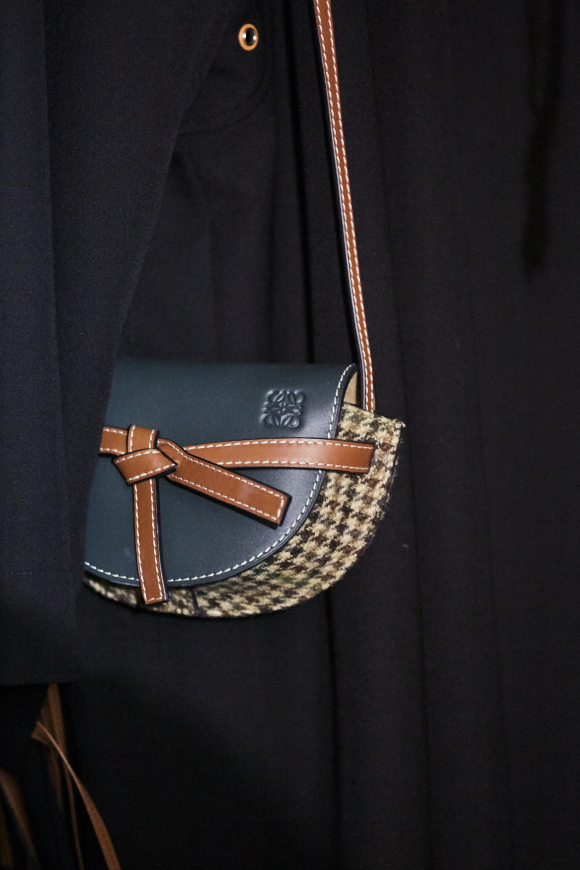 In a LOEWE take on the traditional saddle bag, the knotted ‘Gate’ bag returns for Fall Winter 2018 re-imagined in burnished box calfskin, paneled in hound’s tooth wool. It is updated in a miniature style and an exotic top-handled tote.
