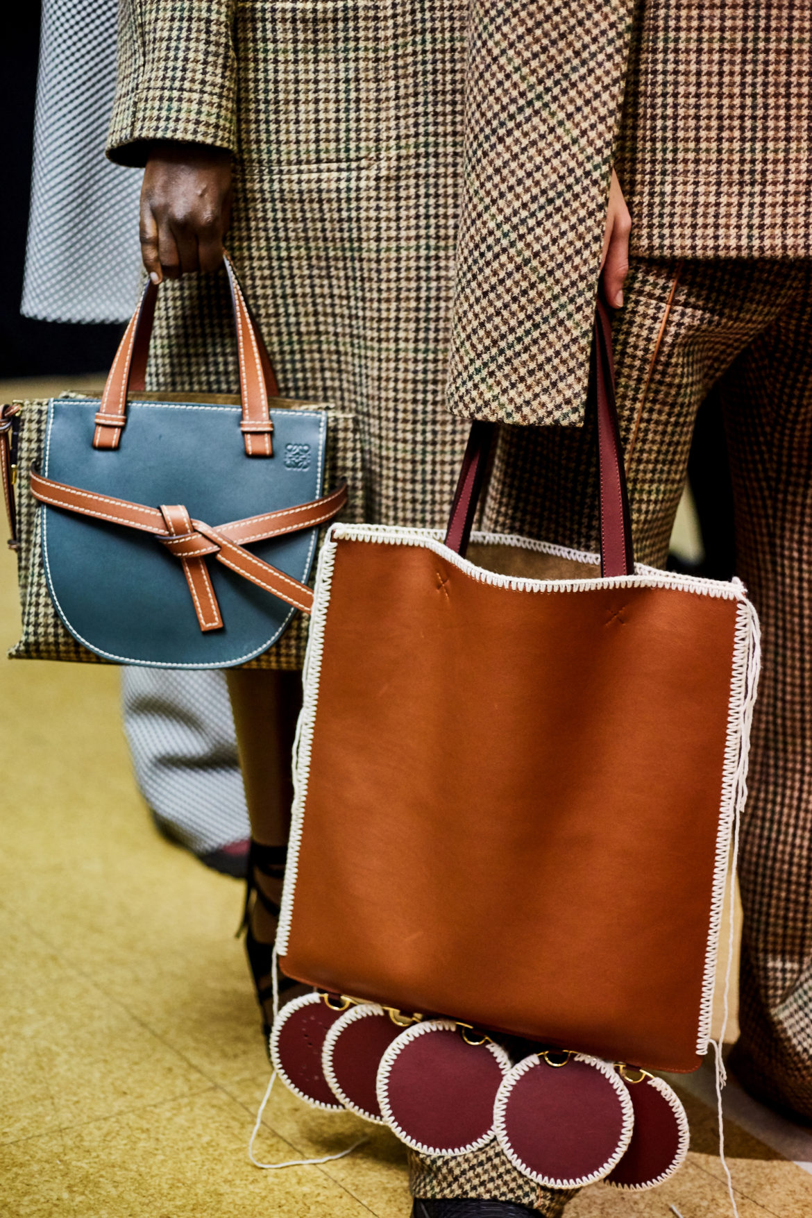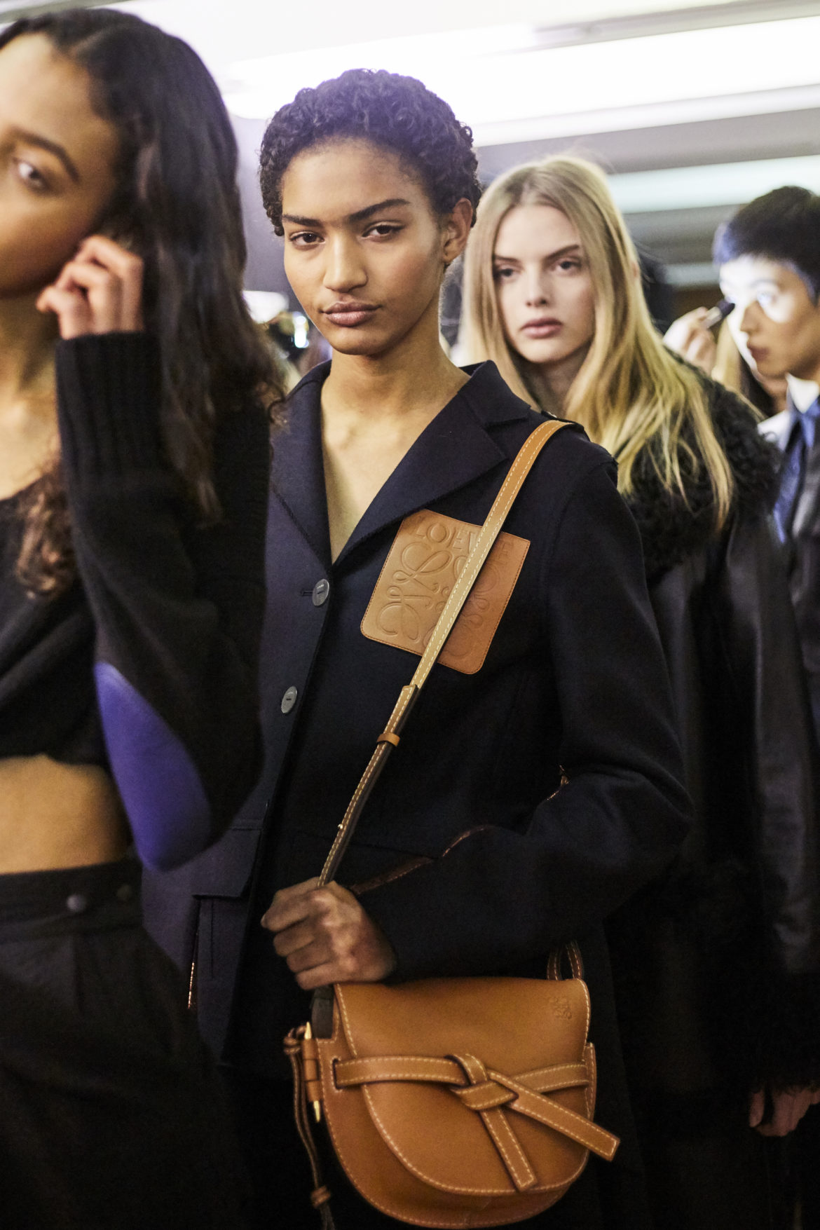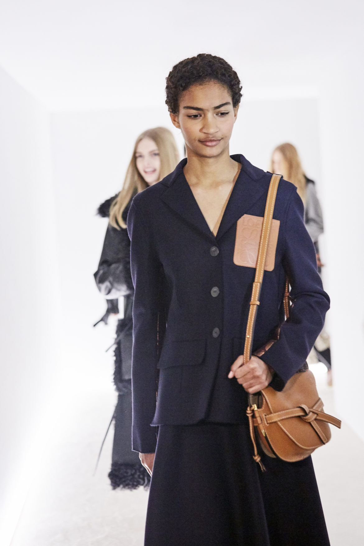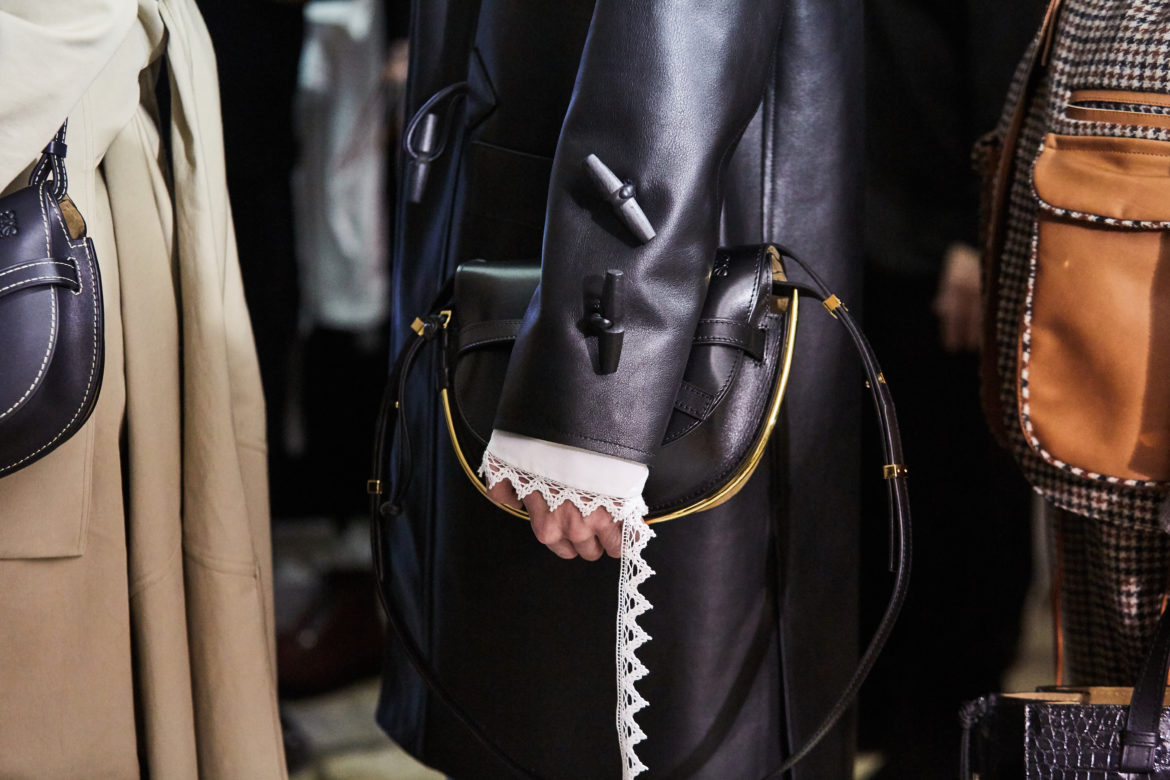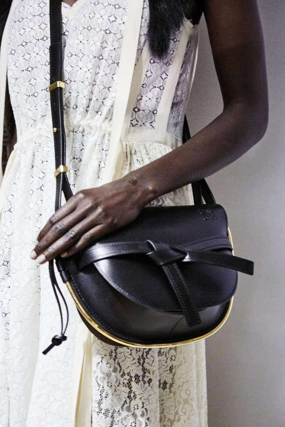In a LOEWE take on the traditional saddle bag, the knotted ‘Gate’ bag returns for Fall Winter 2018 re-imagined in burnished box calfskin, paneled in hound’s tooth wool. It is updated in a miniature style and an exotic top-handled tote.