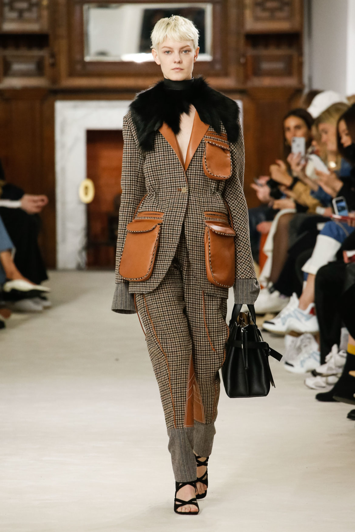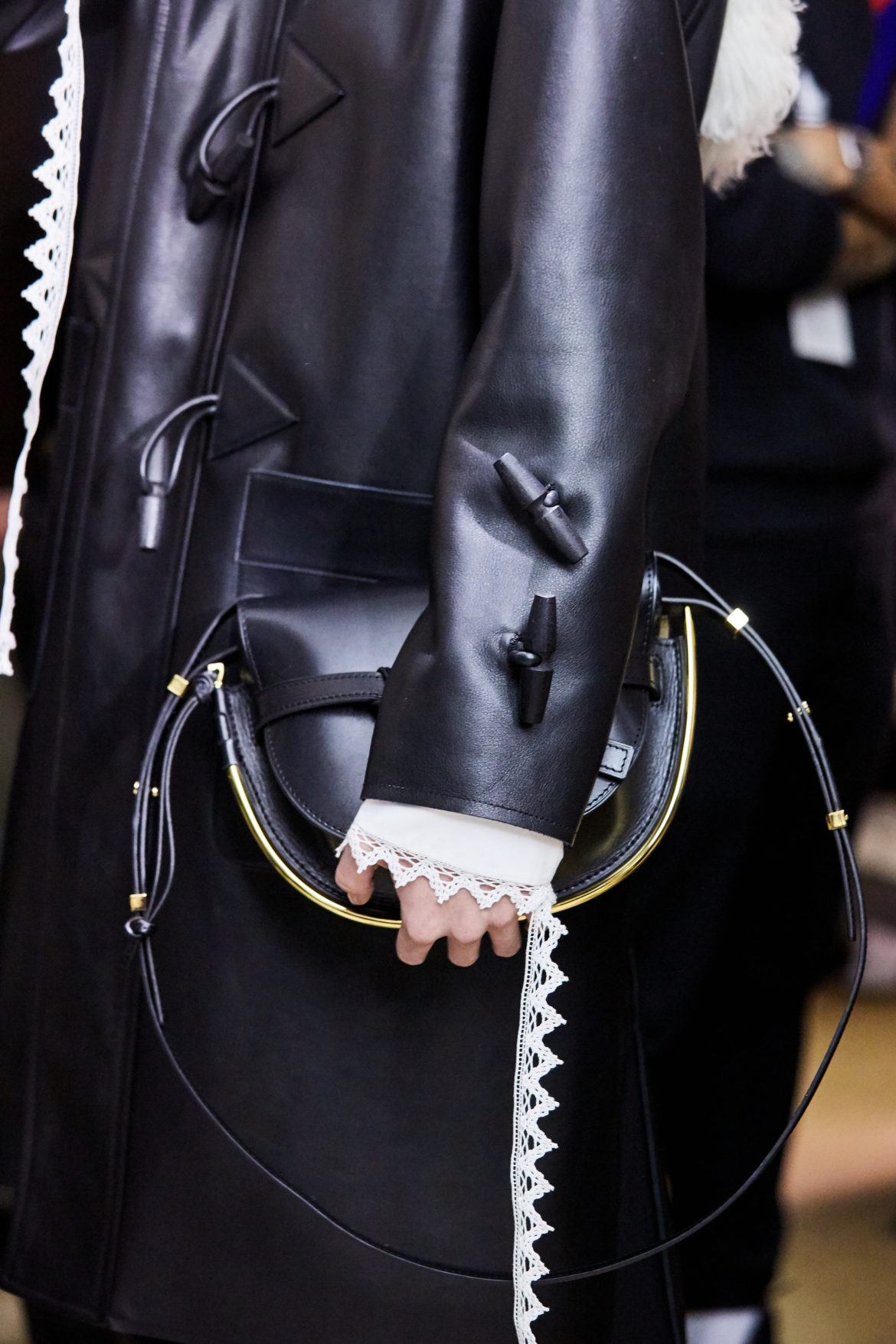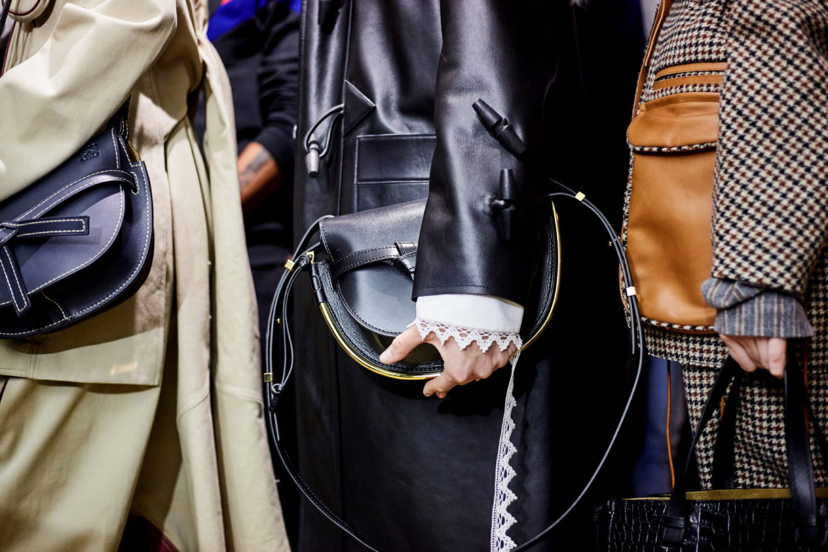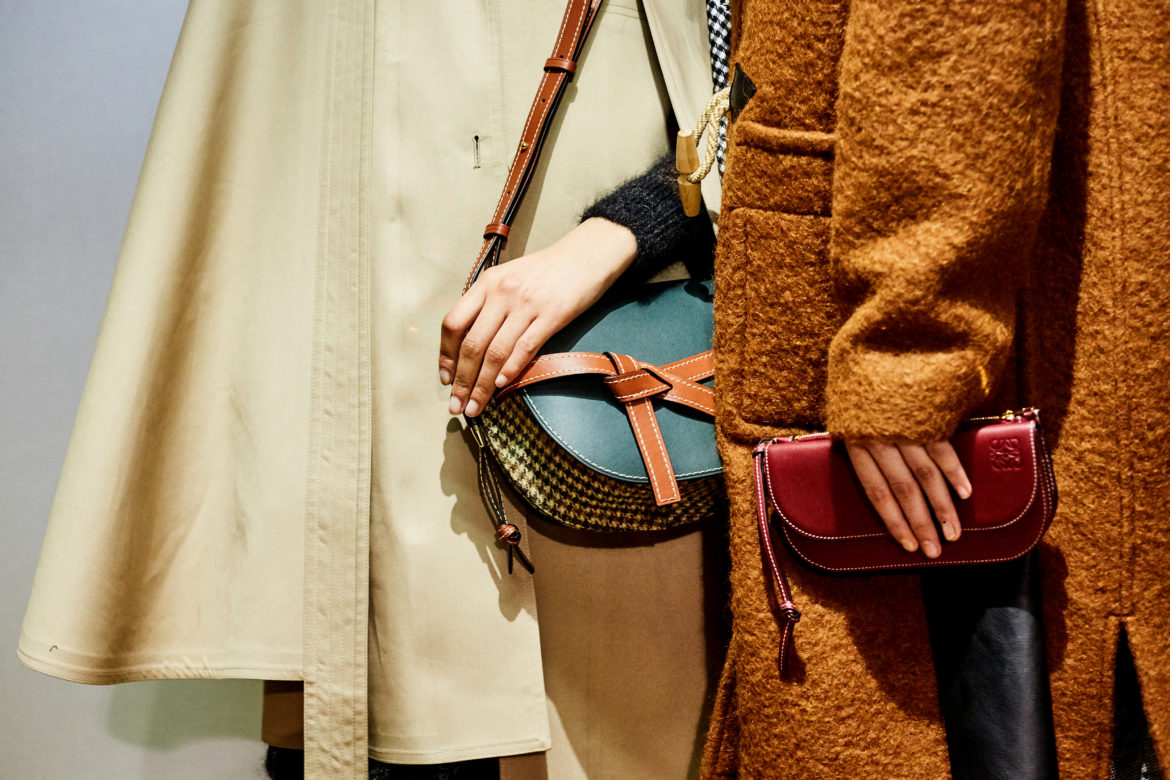 In a LOEWE take on the traditional saddle bag, the knotted ‘Gate’ bag returns for Fall Winter 2018 re-imagined in burnished box calfskin, paneled in hound’s tooth wool. It is updated in a miniature style and an exotic top-handled tote.