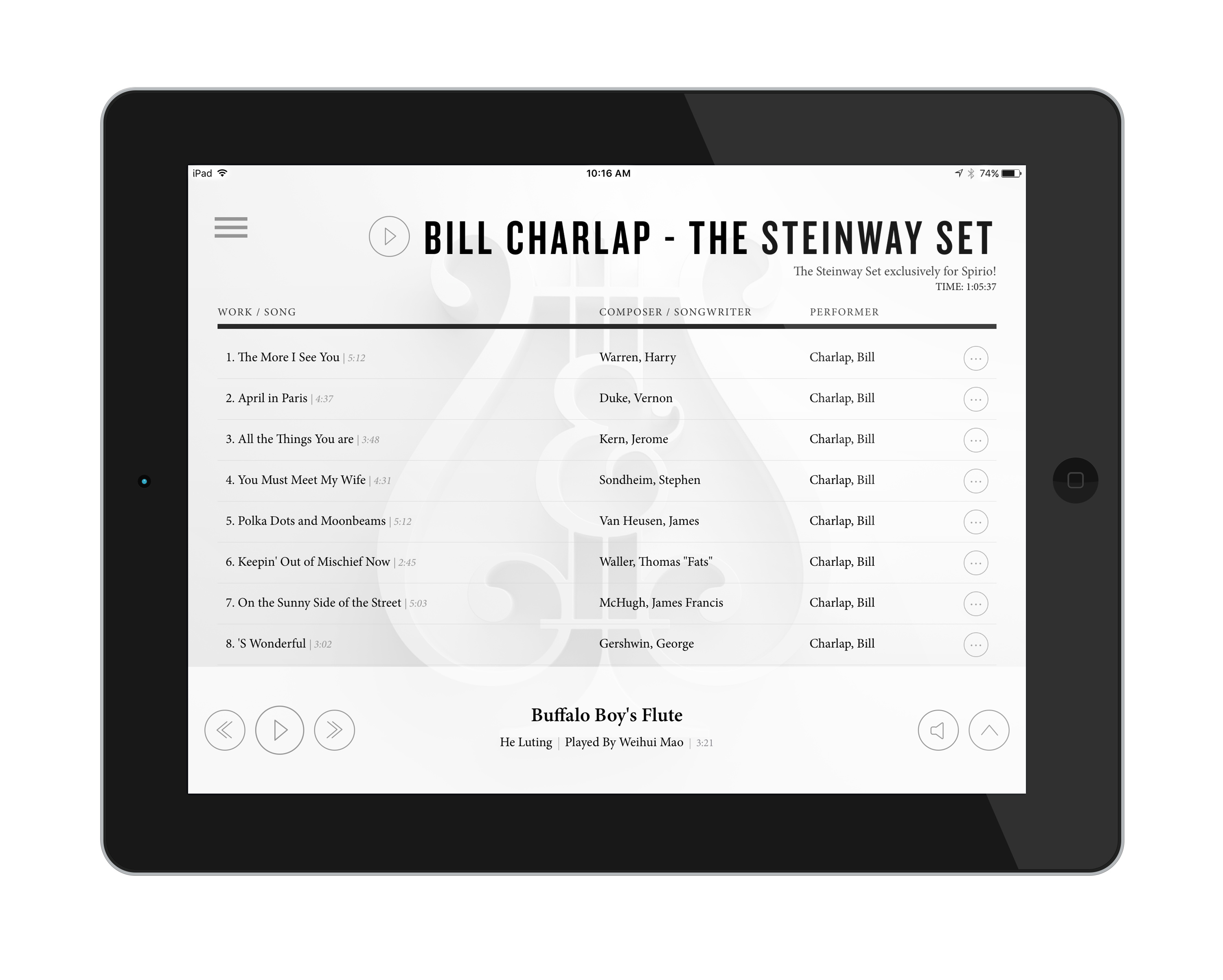 Pour utiliser le système, Steinway & Sons fournit gratuitement un iPad connecté sans fil au Spirio. Conviviale et intuitive, l’application Steinway Spirio permet un accès facile aux plus belles œuvres de votre choix préalablement enregistrées sur des pianos Steinway & Sons par des artistes Steinway. Au fur et à mesure, de nouvelles œuvres musicales seront enregistrées en studio par des artistes Steinway et automatiquement ajoutées à l’application iPad, prêts à être écoutées. Playlists, bandes originales et genres sélectionnés par Steinway & Sons s’appuient sur l’expertise musicale qui a fait la réputation de la marque afin d’offrir une ambiance sonore adaptée à chaque occasion. Intégré, le contrôle du volume sonore permet de régler avec une grande précision l’intensité de jeu du piano, permettant à la fois de relater une expérience de concert mais aussi un jeu plus doux, atténué. Spirio peut être adapté sur trois modèles de piano existants : le modèle B (Music Room Grand), le modèle M (Medium Grand, disponibles sur certains marchés nord-américains), et le modèle O (Living Room Grand, disponibles sur certains marchés européens et asiatiques). Les prix sont disponibles sur demande auprès des revendeurs Steinway & Sons et dans les boutiques Steinway & Sons.