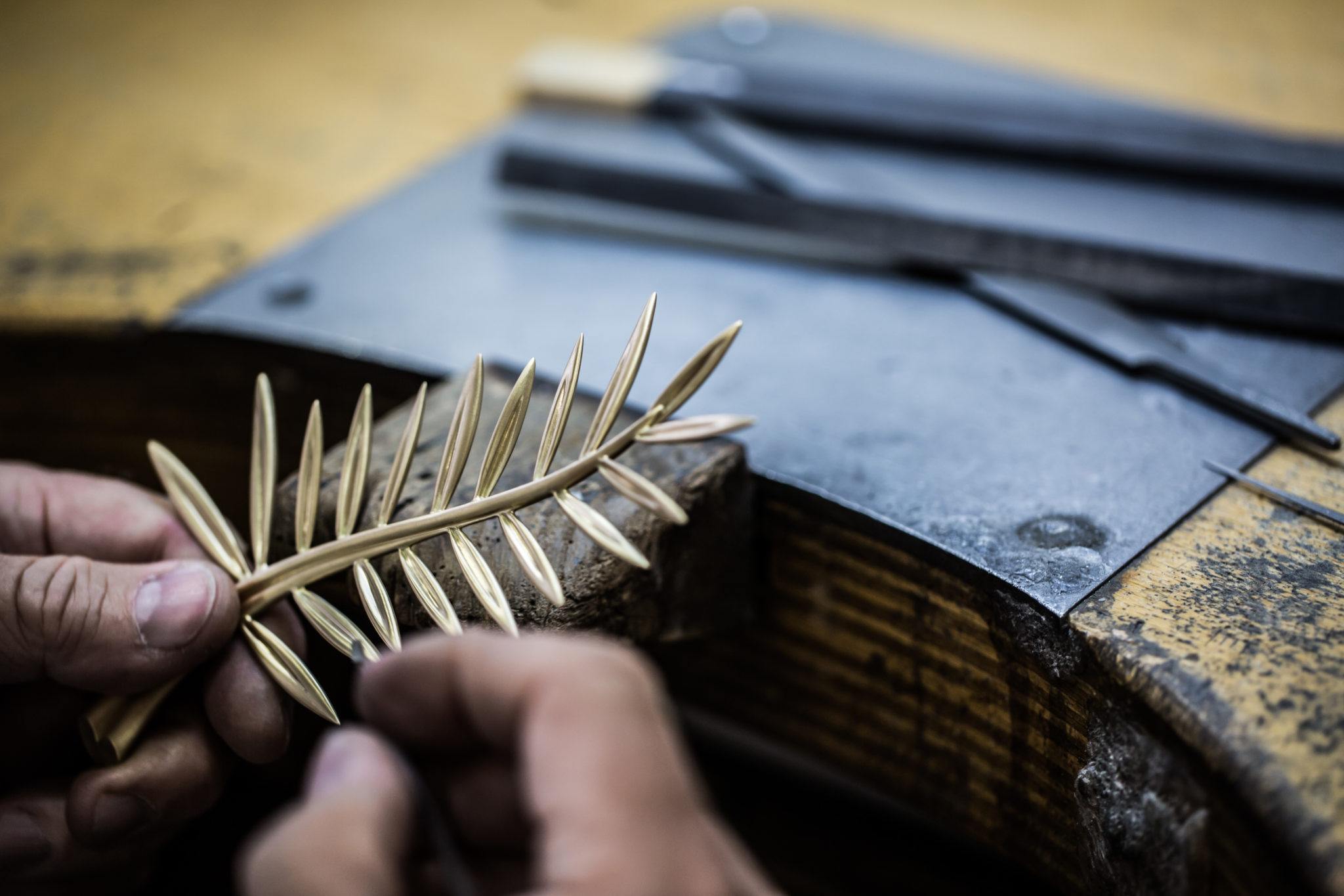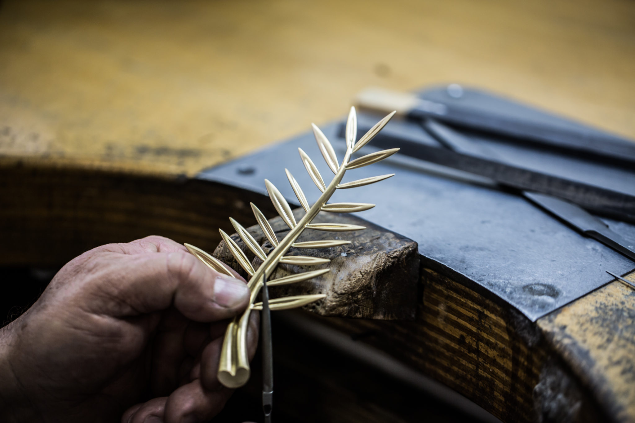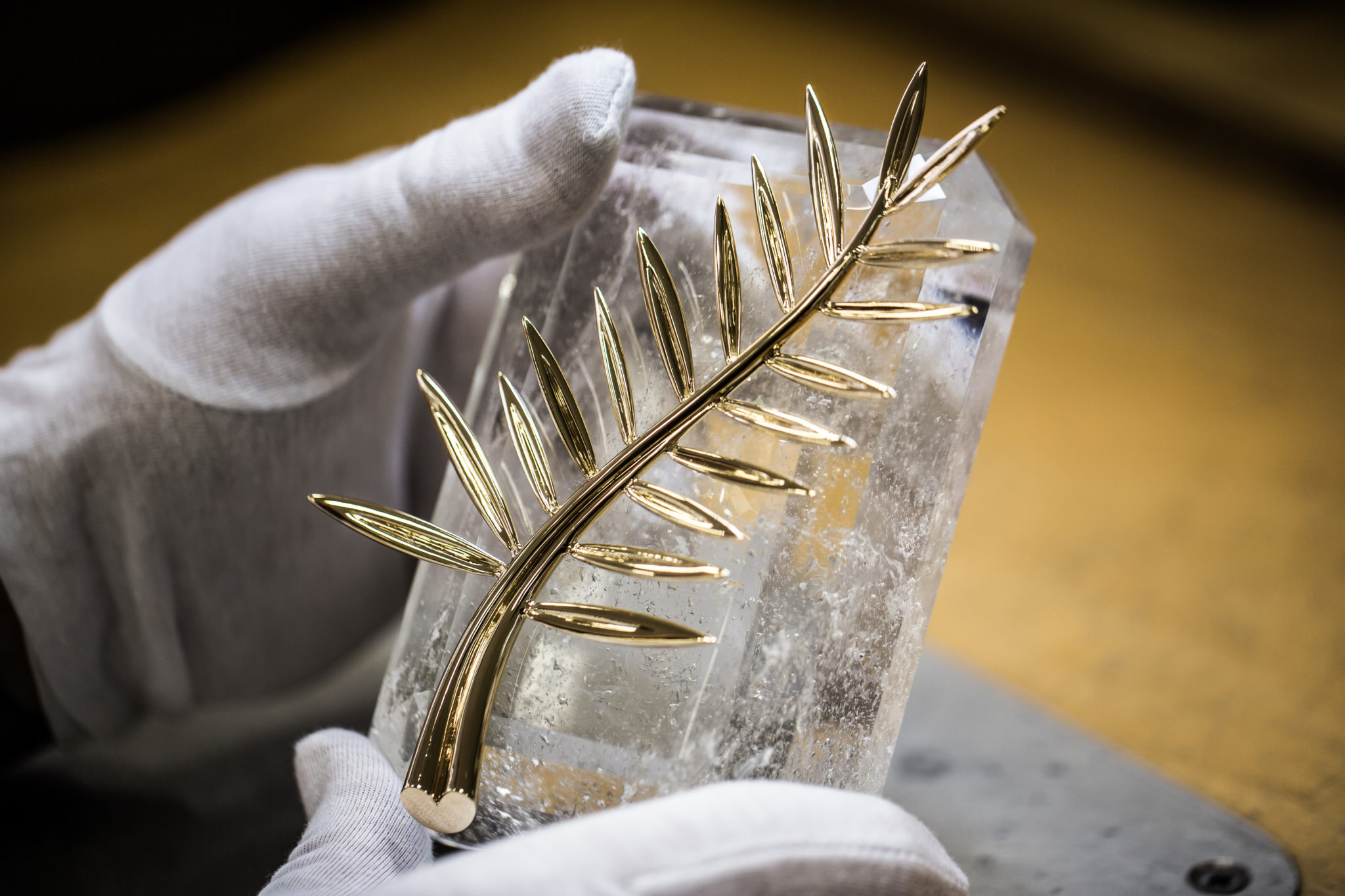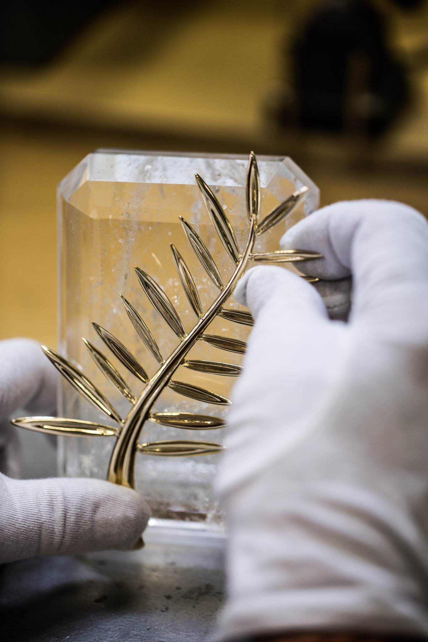 Depuis 1860, la Maison Chopard réalise dans ses ateliers des pièces joaillières et horlogères au charme contemporain, alliant savoir-faire ancestraux et techniques de pointe. Passé maître dans l’art de créer bien plus que des montres et des bijoux, la manufacture produit des créations synonymes d’émotions. Conçu au sein de ses ateliers de Haute Joaillerie depuis 1998, le précieux rameau n’échappe pas à cette promesse. La Palme d’or, dont le motif est une référence directe aux palmiers de la célèbre Croisette et aux armoiries de la ville de Cannes évoquant la fameuse légende de Saint Honorat, est composée de 118 grammes d’or jaune éthique 18ct certifié Fairmined. Bercées par une fine brise, ses feuilles graciles semblent avoir figé leur mouvement un bref instant tandis que l’extrémité de la branche dessine un petit cœur, clin d’œil de Caroline Scheufele à l’un des symboles de la Maison, le joaillier au « Grand Cœur ». Enfin, la Palme d’or repose sur un délicat coussin de cristal de roche de la forme d’un diamant de taille émeraude. Cet ultime détail confère au trophée un caractère unique, la nature ne donnant jamais naissance à deux cristaux de roche identiques. Pas moins de 40 heures de travail sont nécessaires à cinq artisans de la Maison pour façonner à la main le bijou le plus convoité du Festival.