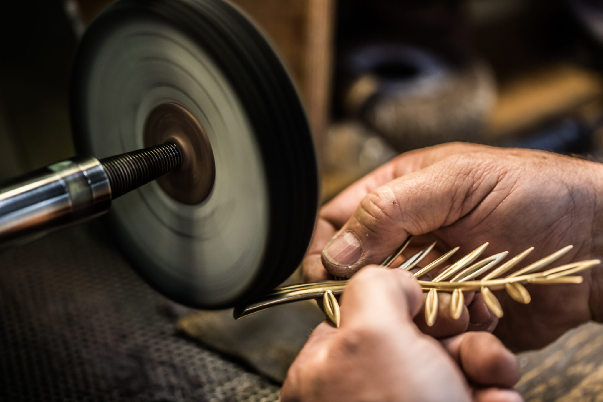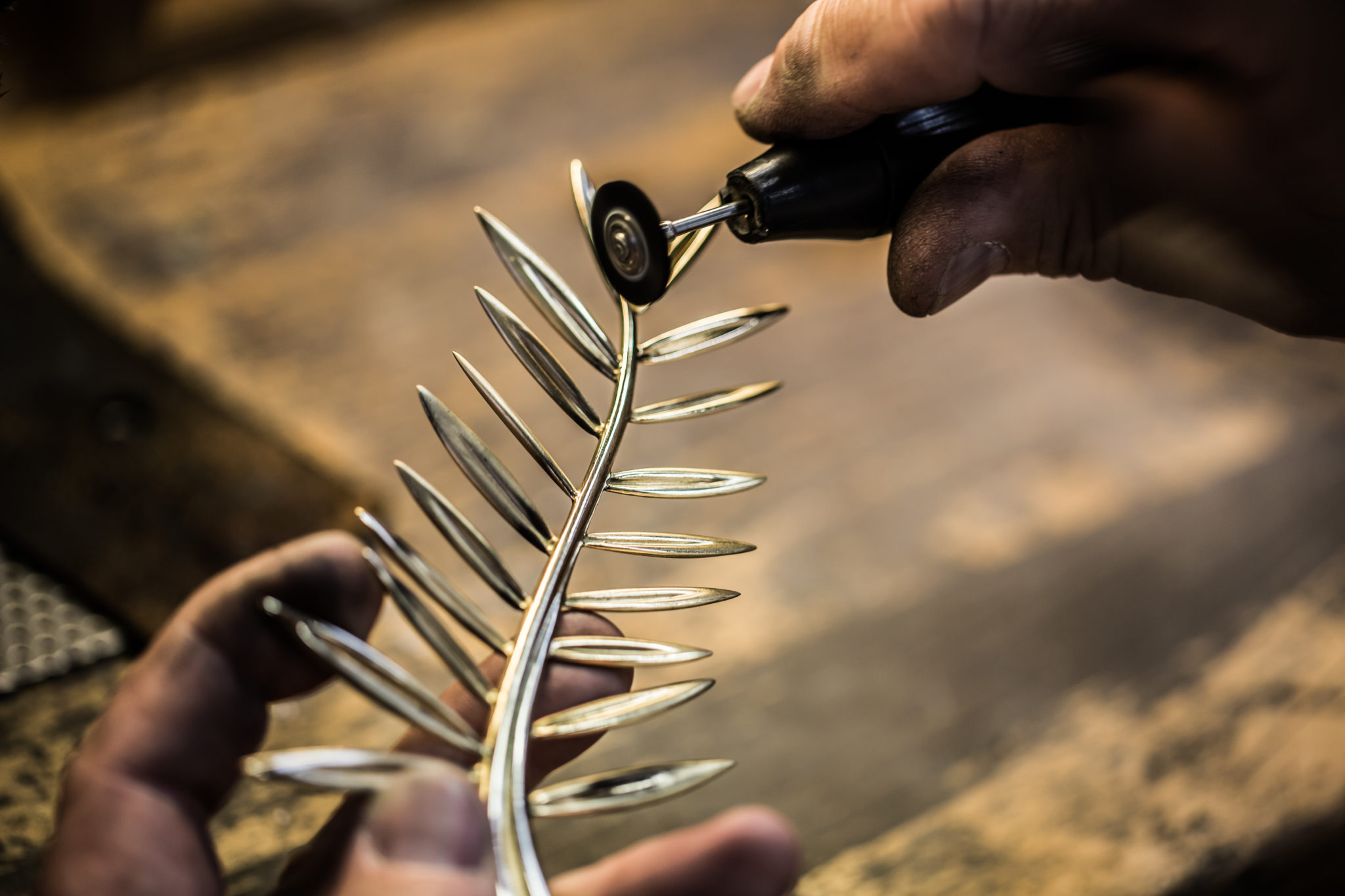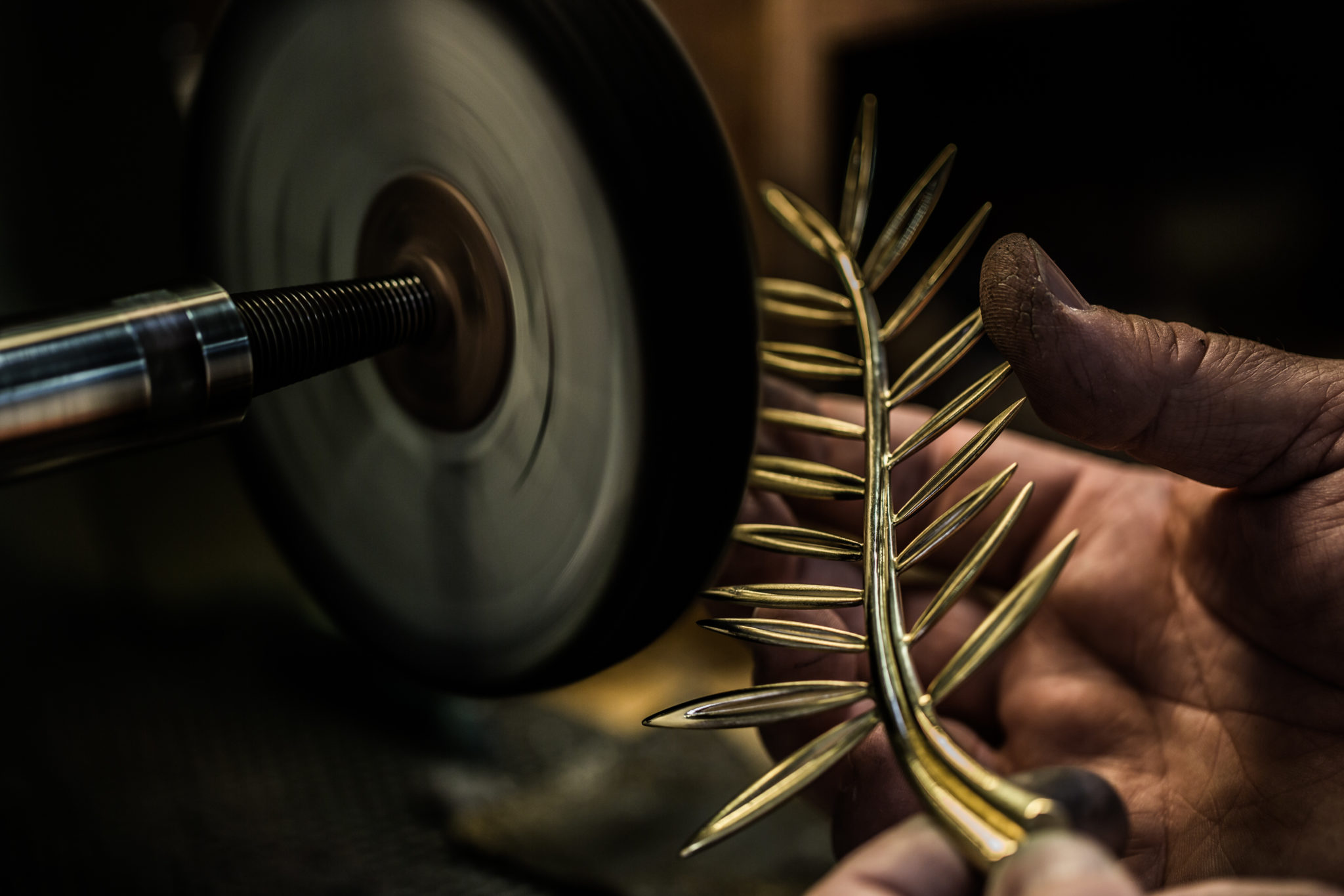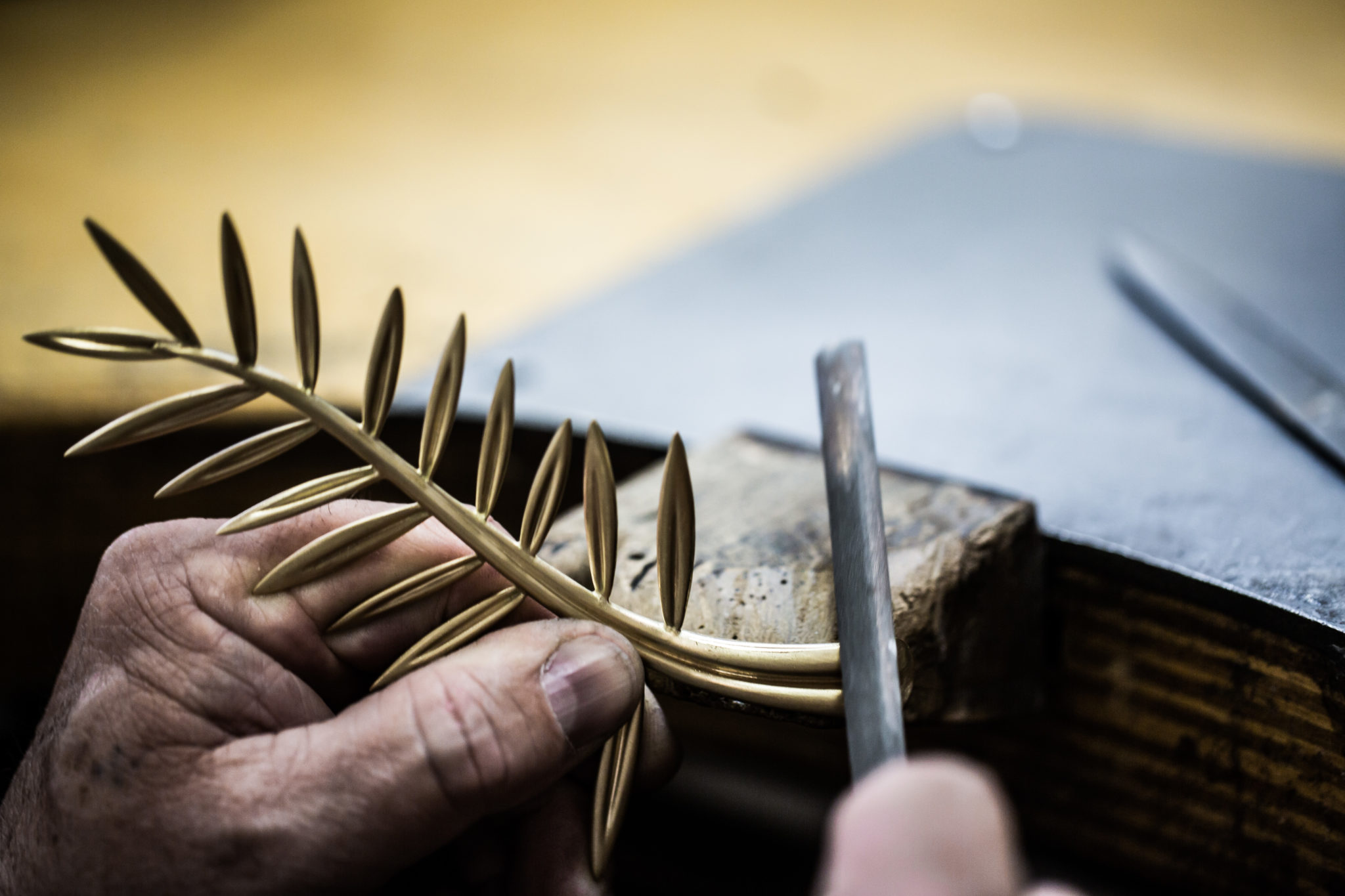Depuis 1860, la Maison Chopard réalise dans ses ateliers des pièces joaillières et horlogères au charme contemporain, alliant savoir-faire ancestraux et techniques de pointe. Passé maître dans l’art de créer bien plus que des montres et des bijoux, la manufacture produit des créations synonymes d’émotions. Conçu au sein de ses ateliers de Haute Joaillerie depuis 1998, le précieux rameau n’échappe pas à cette promesse. La Palme d’or, dont le motif est une référence directe aux palmiers de la célèbre Croisette et aux armoiries de la ville de Cannes évoquant la fameuse légende de Saint Honorat, est composée de 118 grammes d’or jaune éthique 18ct certifié Fairmined. Bercées par une fine brise, ses feuilles graciles semblent avoir figé leur mouvement un bref instant tandis que l’extrémité de la branche dessine un petit cœur, clin d’œil de Caroline Scheufele à l’un des symboles de la Maison, le joaillier au « Grand Cœur ». Enfin, la Palme d’or repose sur un délicat coussin de cristal de roche de la forme d’un diamant de taille émeraude. Cet ultime détail confère au trophée un caractère unique, la nature ne donnant jamais naissance à deux cristaux de roche identiques. Pas moins de 40 heures de travail sont nécessaires à cinq artisans de la Maison pour façonner à la main le bijou le plus convoité du Festival.