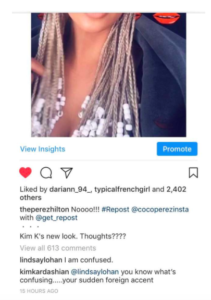 Anna Alix Koffi, fondatrice du magazine Something We African Gots remarque: si les blancs ne peuvent pas porter de Wax, alors pourquoi aurait-elle le droit de porter des marinières ?  Y’aurait t-il un droit à l’appropriation culturelle ? Faudrait t-il forcément être issu d’une minorité pour que les bons blancs, qui distribuent vos fringues aient pitié et vous laissent mixer les références stylistiques ? En janvier dernier la pop culture nous a donné un exemple de l’effet boomerang du terme appropriation culturelle : Kim Kardashian pose une photo d’elle avec des nattes. La référence revendiquée : Bo Derek. Plusieurs commentaires déssaprouvent, et l’accusent « d’appropriation culturelle ». Lindsay Lohan est « confused ».