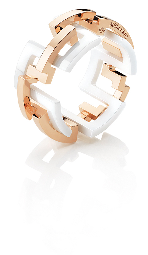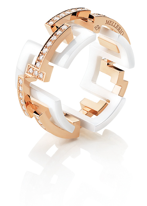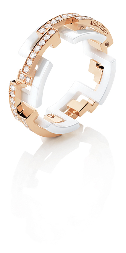 Le premier opus, disponible dès maintenant, souligne encore davantage son design architecturé en apportant du contraste grâce à une matière que Mellerio utilise pour la première fois : la céramique. Quasiment aussi dure que le diamant et inoxydable grâce à sa cuisson haute température, elle révèle avec force le graphisme des lignes de la bague.