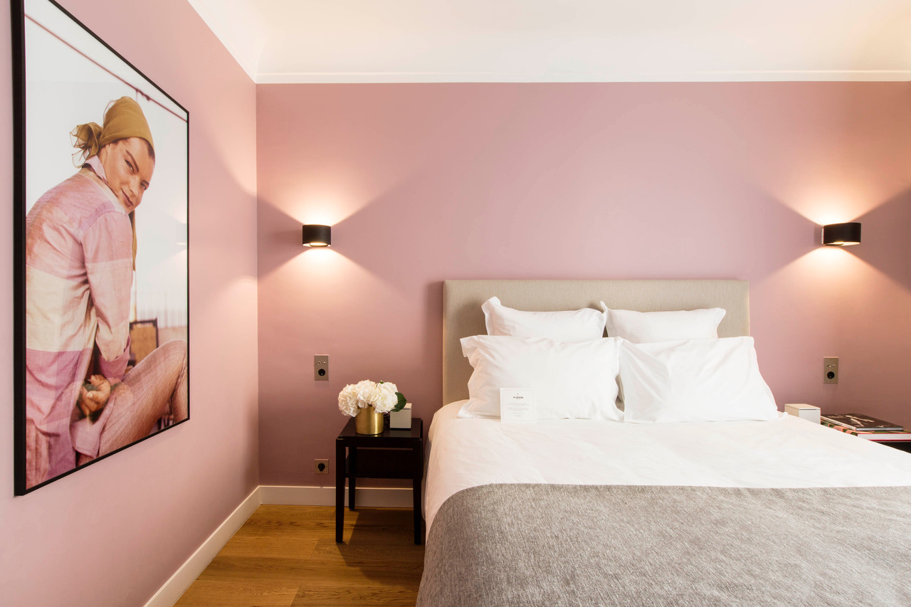 Si le Mathis demeure cette maison à la singularité très forte, il y a un avant et un après l’époque Gérald Nanty. Alors que l’hôtel existe depuis le début, il n’est clairement pas la priorité pour l’homme de la nuit. Depuis son rachat par le groupe H8 en juin 2015, le Mathis est un nouvel hôtel, toutes les chambres ont été refaites et complétement repensées les unes après les autres par la décoratrice Sylvia Fabbian. « Le Mathis a toujours été un lieu à la personnalité très forte » résume Sylvia Fabbian « mais il n’y avait pas de véritable colonne vertébrale ». Il manque une âme. Elle commence alors par mettre en scène des objets très forts dans les parties communes à la manière de cette collection IT Light de chez Floss. Puis elle se penche sur chacune des chambres « j’aimais cette idée qu’elles soient toutes différentes et singulières, mais il était nécessaire de ramener des éléments de langage communs ». On pense immédiatement à ces lampes de chevet Cuboluce de chez Cini et Nils ou ces chaises Bertoia de chez Knoll. Et puis les parquets en chêne naturel remplacent les moquettes, les papiers peints Cole & Son se marient aux peintures de chez Farrow & Ball. Chaque chambre est un univers bien à soi. La Schneider avec ses couleurs rose indien, la Gainsbourg, la Bardot, la Perroquet, la Singe, la Jungle…