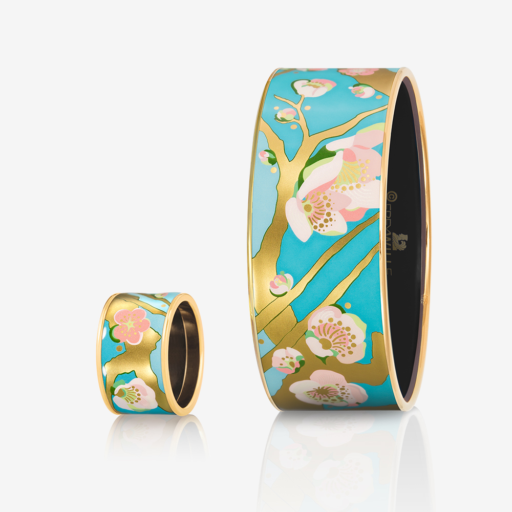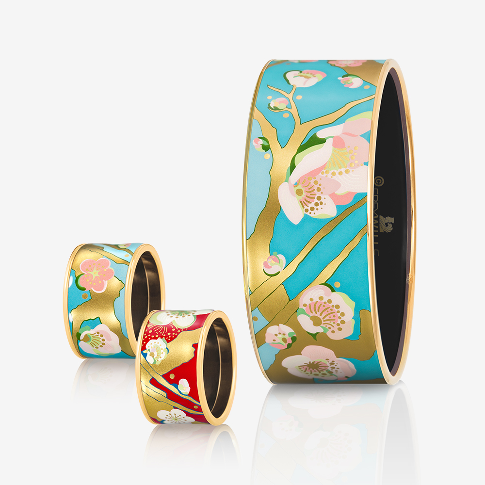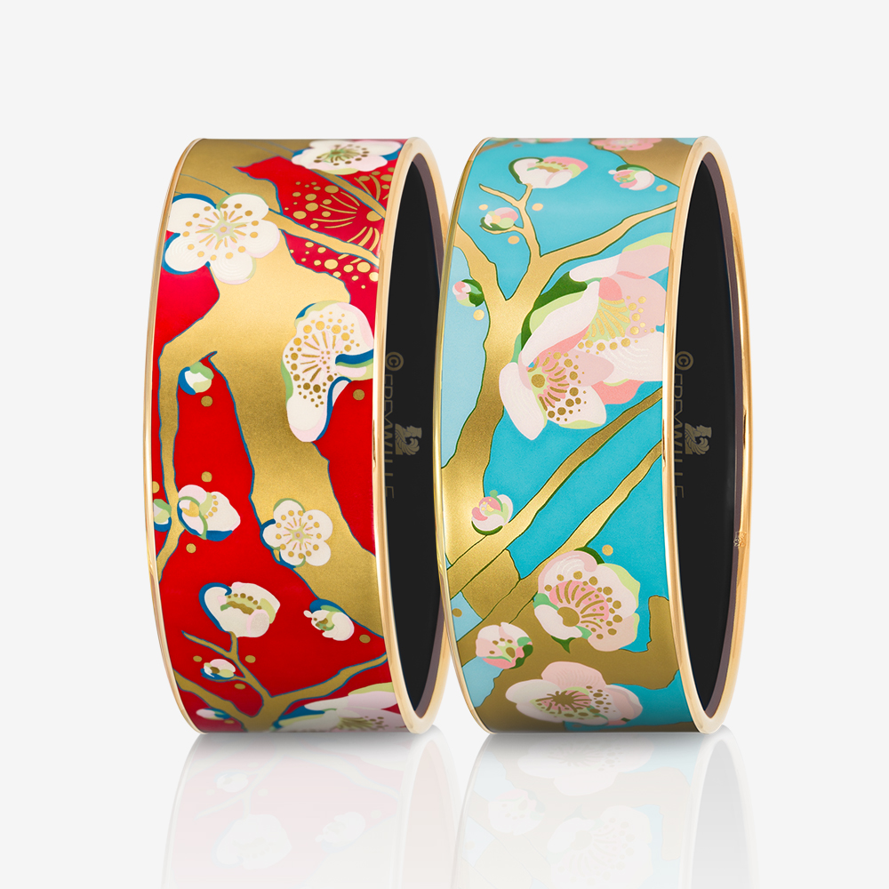 Les 2 interprétations utilisent de la poudre d’or 24 carats au sein même de l’émail grand-feu, équilibrant parfaitement les couleurs intenses des bourgeons d’amandiers et leurs branches dorées.