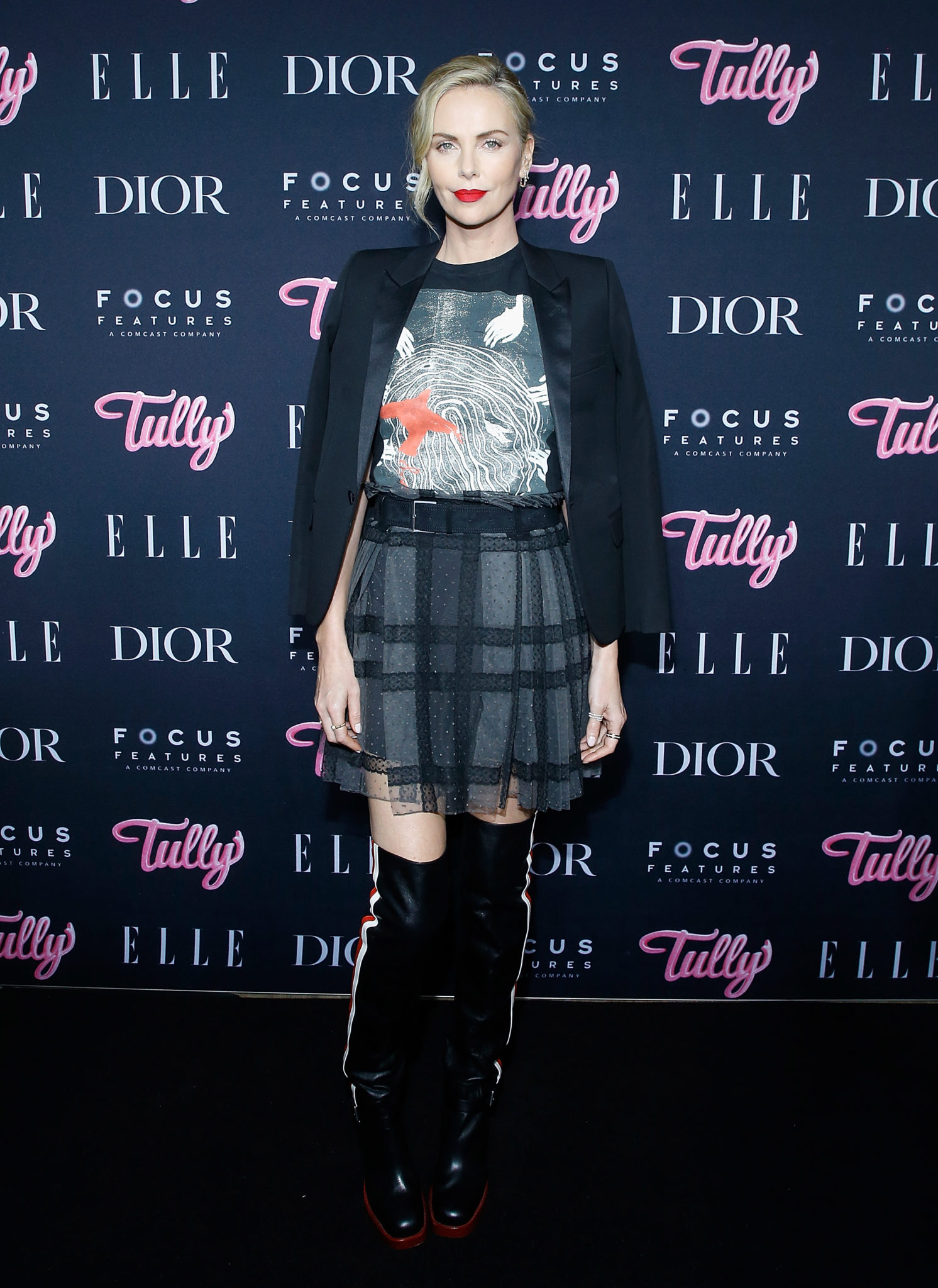 Charlize Theron portait une veste en laine et soie noires Dior, un tee-shirt en coton imprimé Dior, une jupe en tulle noir Dior et des bottes en cuir noir Dior lors de la projection spéciale du film « Tully » en partenariat avec Dior et Elle.