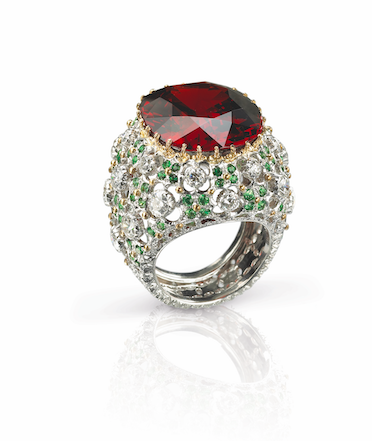 Pendant Earrings in White Gold set with 74 Round Brilliant-Cut Diamonds and two Baroque Pearls, a Cocktail Ring in White & Yellow Gold set with 22 Round Brilliant-Cut Diamonds, 96 Faceted Tzavorites and one Faceted Spessartine and a Ring in Yellow & White Gold set with 100 Round Brilliant-Cut Diamonds, 20 Diamonds and one Oval Cabochon Emerald.