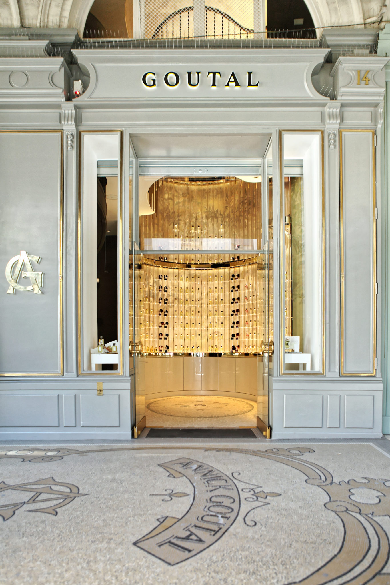En façade, les architectes Bruno Moinard et Claire Bétaille ont choisi de restaurer les boiseries d’un gris perlé, rehaussées d’or. derrière la façade très parisienne, un signe raffiné invite le promeneur à la halte : l’œuvre lapidaire historique des allées sous les arcades extérieures se poursuit à l’intérieur. Au sol, une mosaïque artisanale de grès aux demi-tons élégants dessine, parmi des motifs floraux, le mono- gramme d’Annick Goutal.