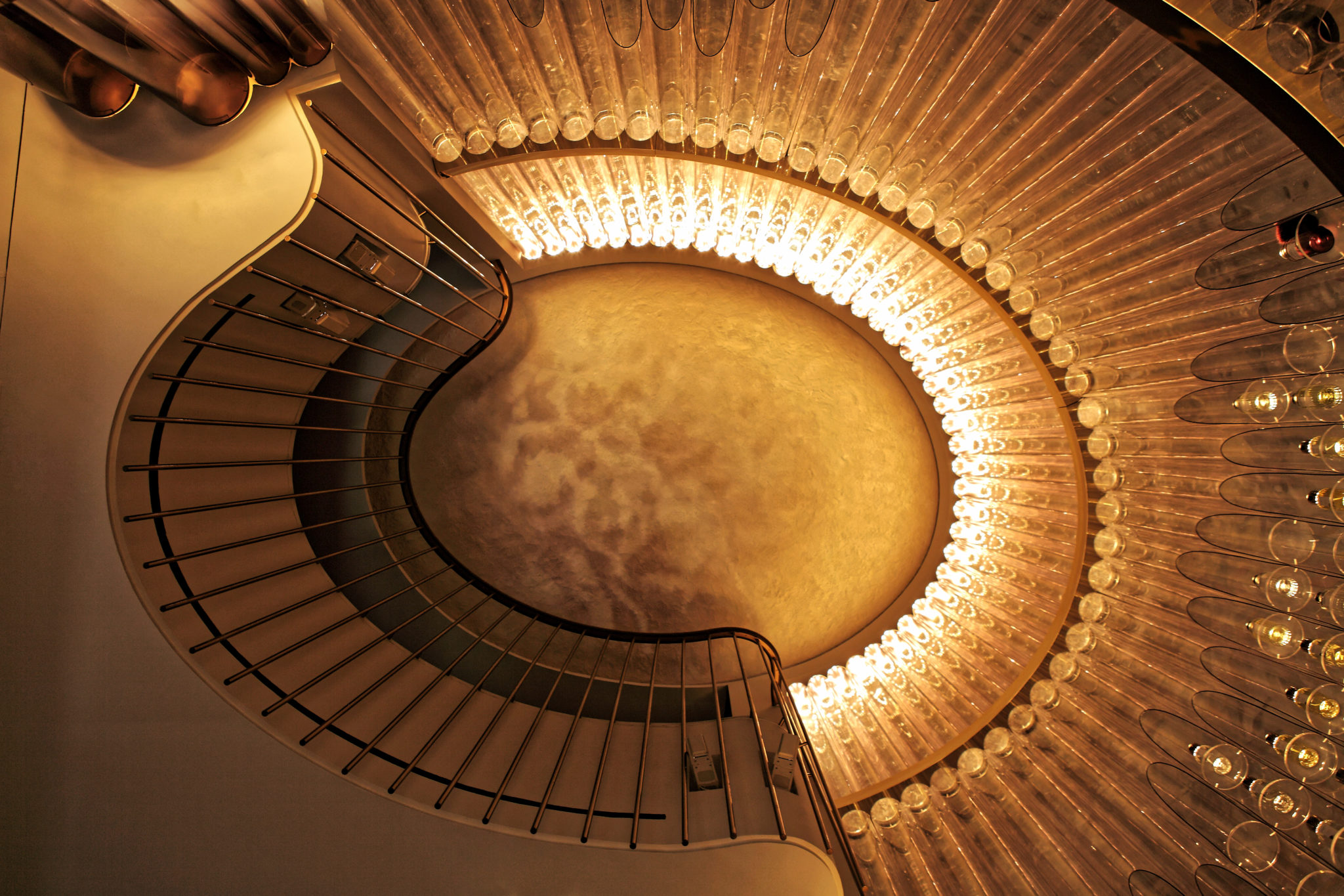 Pour rendre hommage à la pianiste et compositeur de parfums Annick Goutal, pour allier ces deux penchants créateurs en une image forte et pleine de sens, le parti a été pris d’aménager un orgue hybride à mi-chemin entre la musique et le parfum. Haut de 7 mètres et large comme le fût d’un arbre plusieurs fois centenaire, il est composé de longilignes cylindres transparents, verticaux, rythmés de lignes ogivales. déployé autour d’une ellipse enveloppante, l’orgue prend place devant un grand décor peint a fresco, fait d’ombres de sous- bois dégradées. Le décor bucolique qui sert de cadre à l’harmonium se développe avec lui vers des hauteurs insoupçonnées, magnifiées sur les deux étages par un plafond courbe de staff qui évoque les cimes, le mouvement, l’infini. des ombres de feuillages bruissant sont projetées sur cette coupole, un ciel végétal propice à la méditation, à l’évocation de la douceur du temps qui passe dans le sillage du merveilleux.
