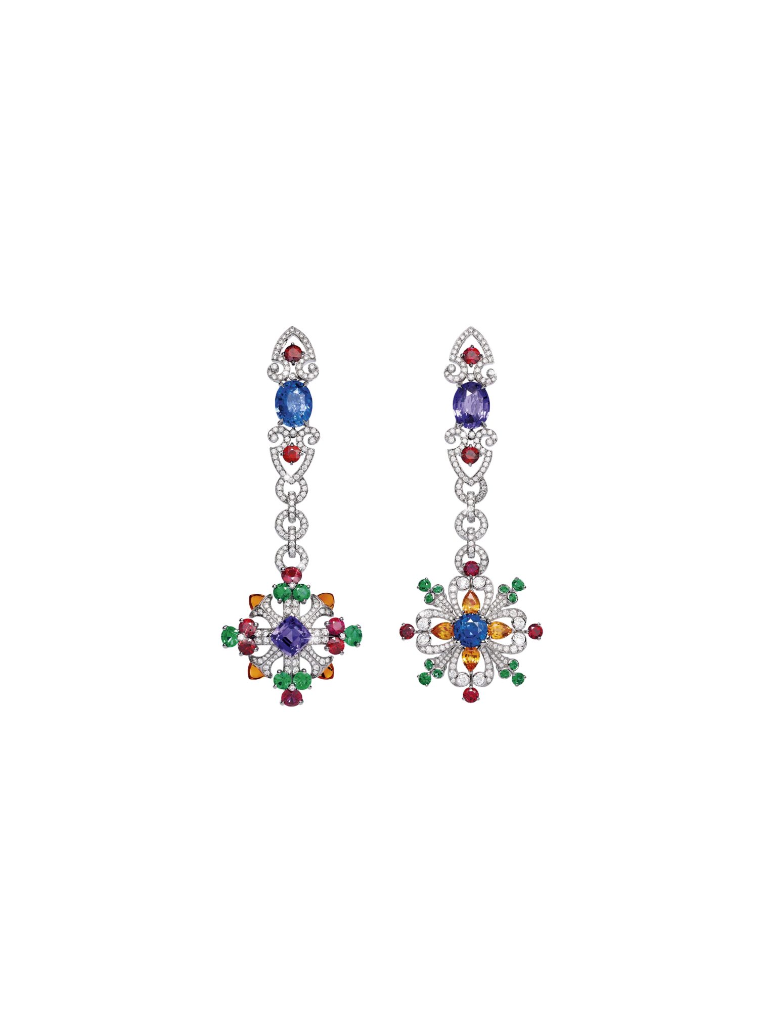Earrings. Blue sapphire (Sri Lanka) – 3.61 cts. Purple sapphire (Madagascar) – 2.37 cts. Multi-coloured fine and precious stones, diamonds, white gold.