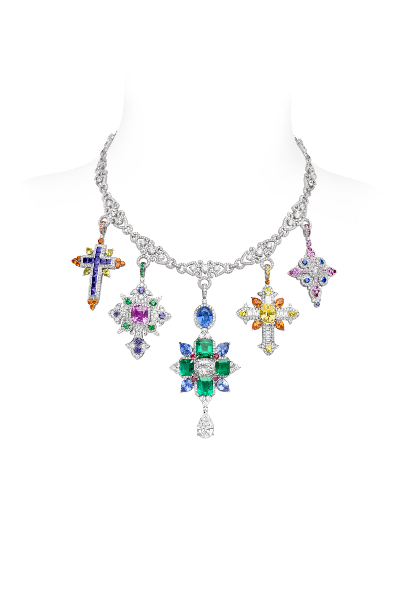 Transformable jewel: necklace, pendant, brooch. Pear-shaped diamond – 5.02 cts. Cushion diamond – 3.01 cts. Four emeralds (Colombia) – 14.58 cts. Blue sapphire (Sri Lanka) – 6.93 cts. Pink sapphire (Madagascar) – 5.37 cts. Yellow sapphire (Sri Lanka) – 6.00 cts. Multi-coloured fine and precious stones, diamonds, white gold.