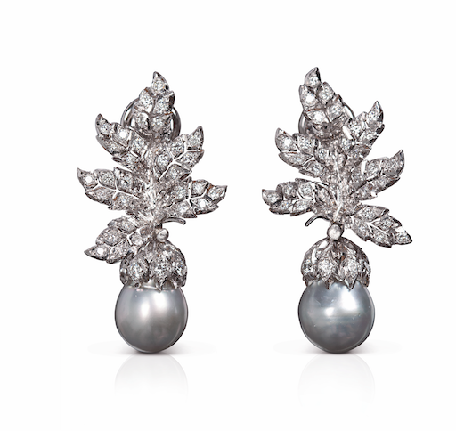 Pendant Earrings in White Gold set with 74 Round Brilliant-Cut Diamonds and two Baroque Pearls, a Cocktail Ring in White & Yellow Gold set with 22 Round Brilliant-Cut Diamonds, 96 Faceted Tzavorites and one Faceted Spessartine and a Ring in Yellow & White Gold set with 100 Round Brilliant-Cut Diamonds, 20 Diamonds and one Oval Cabochon Emerald.