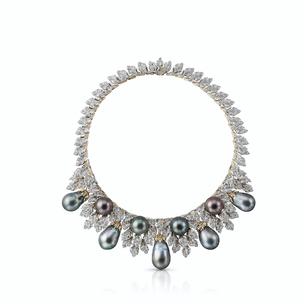 Buccellati necklace in White & Yellow gold set with five Drop-Shaped Pearls, four Pearls and 261 Rose-Cut Diamonds,