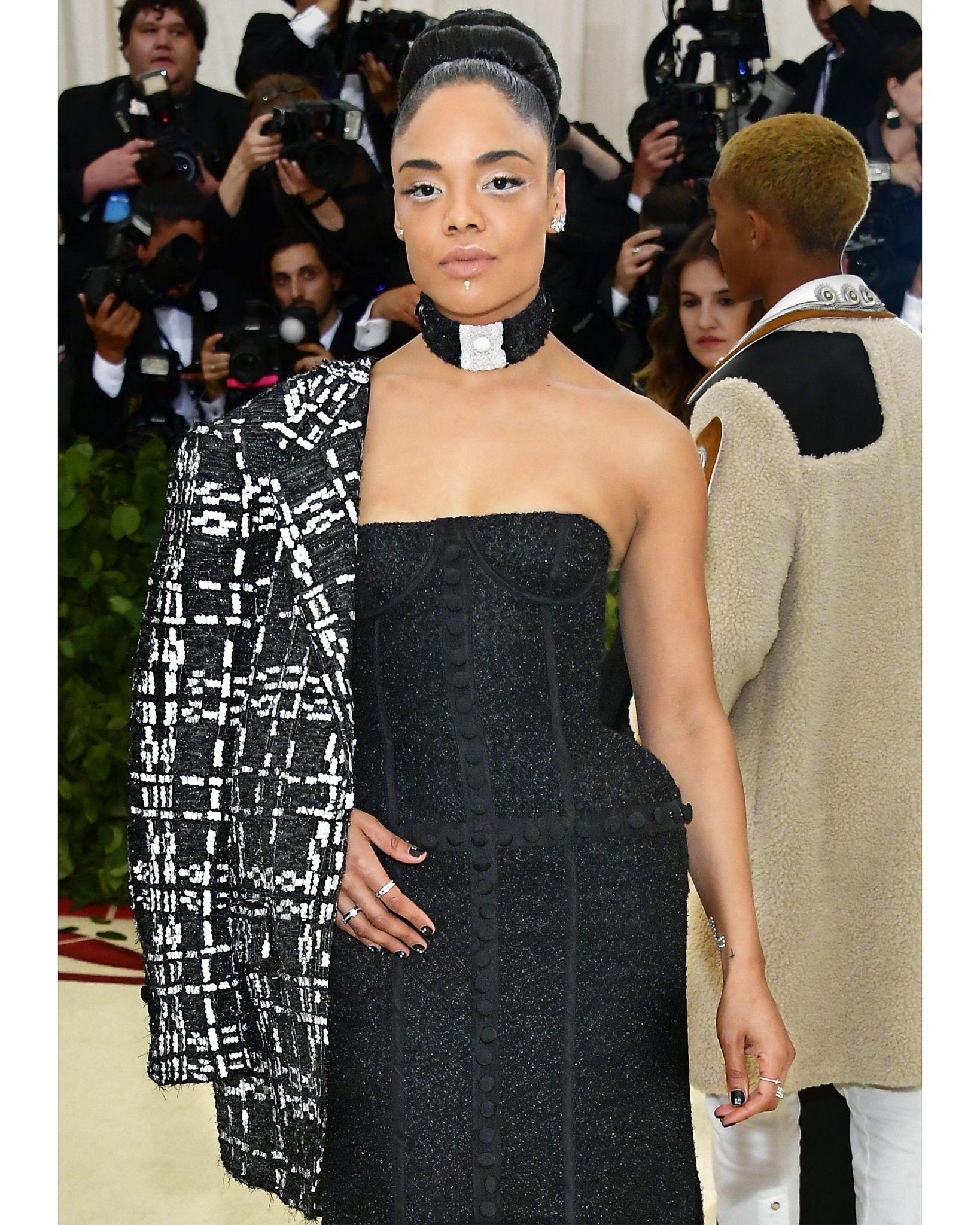 Actress Tessa Thompson donned Tiffany Victoria diamond earrings and Tiffany T rings with her Thom Browne dress.
