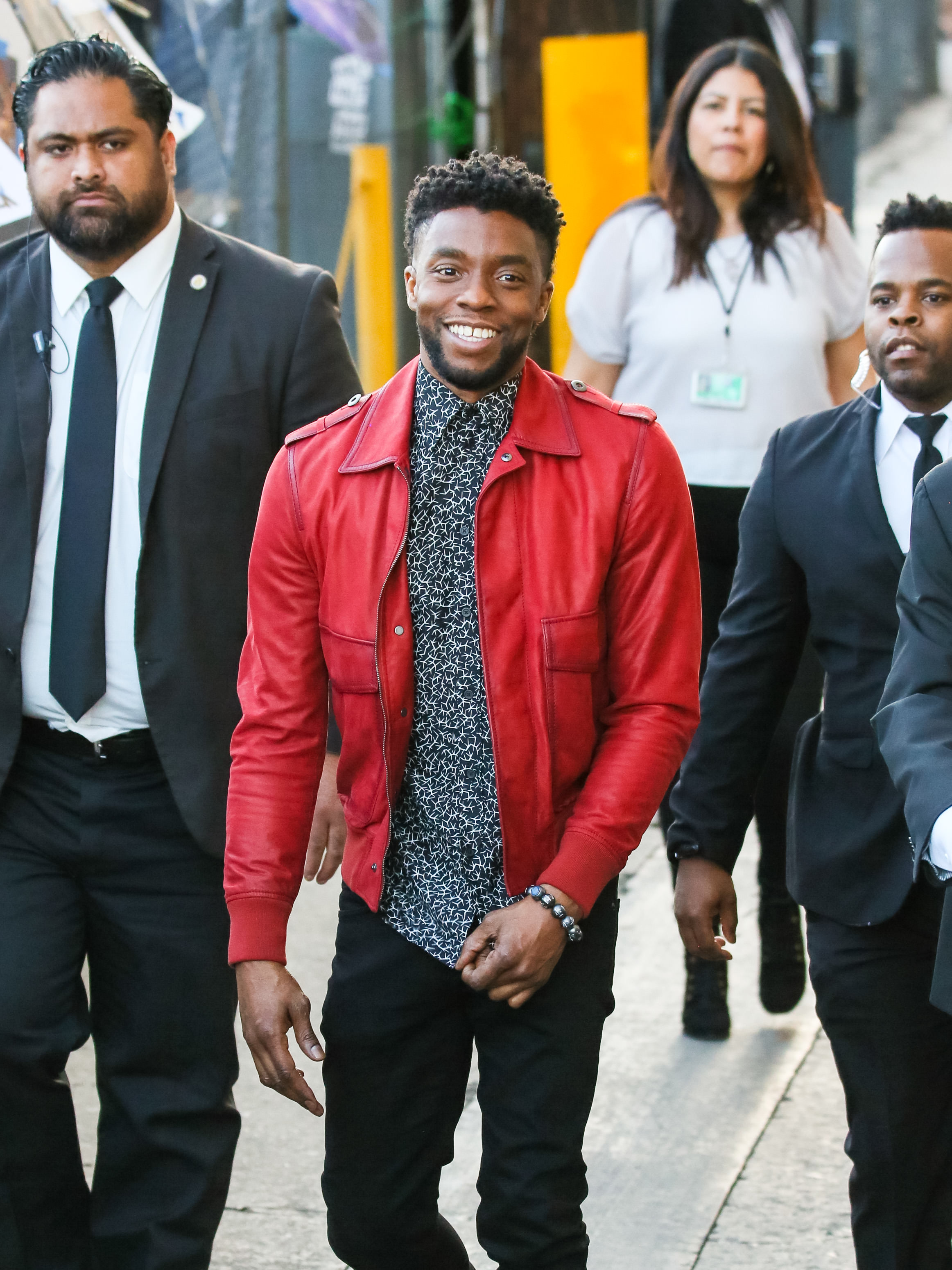 Chadwick Boseman wearing Bottega Veneta Early Fall 2018 Red Leather Bomber Jacket in occasion of the ‘Jimmy Kimmel Live’ show , held on April 25th 2018 in Los Angeles.