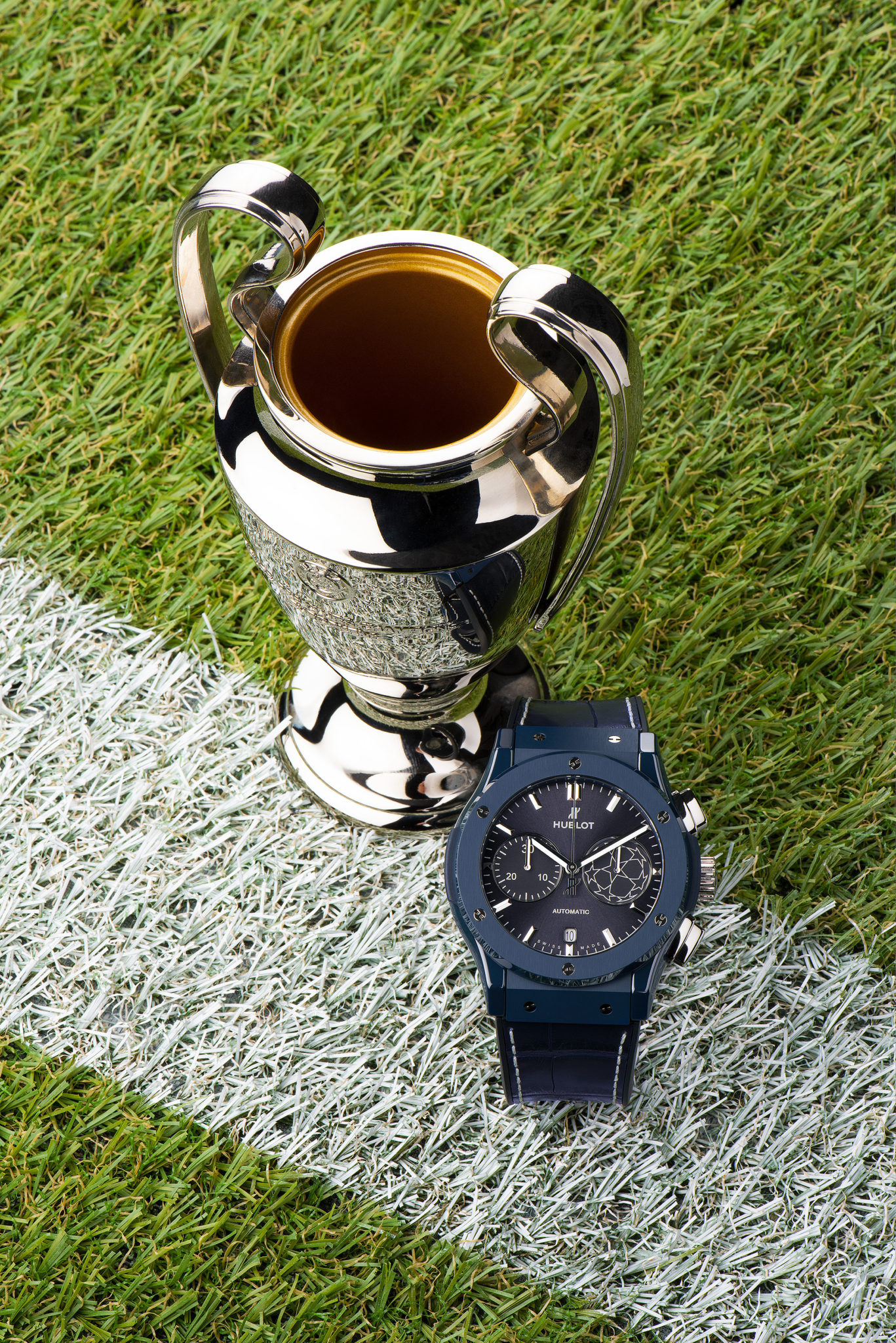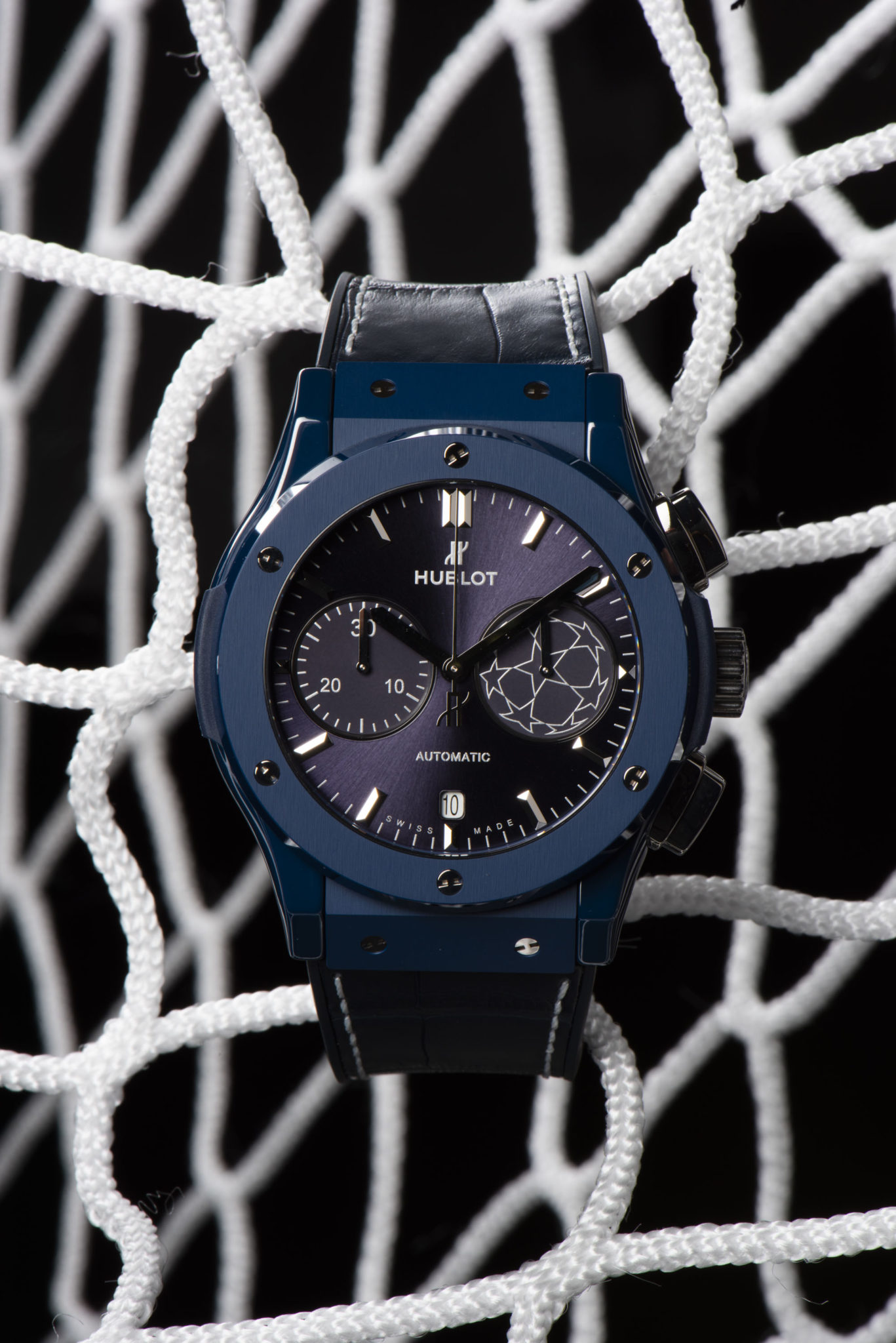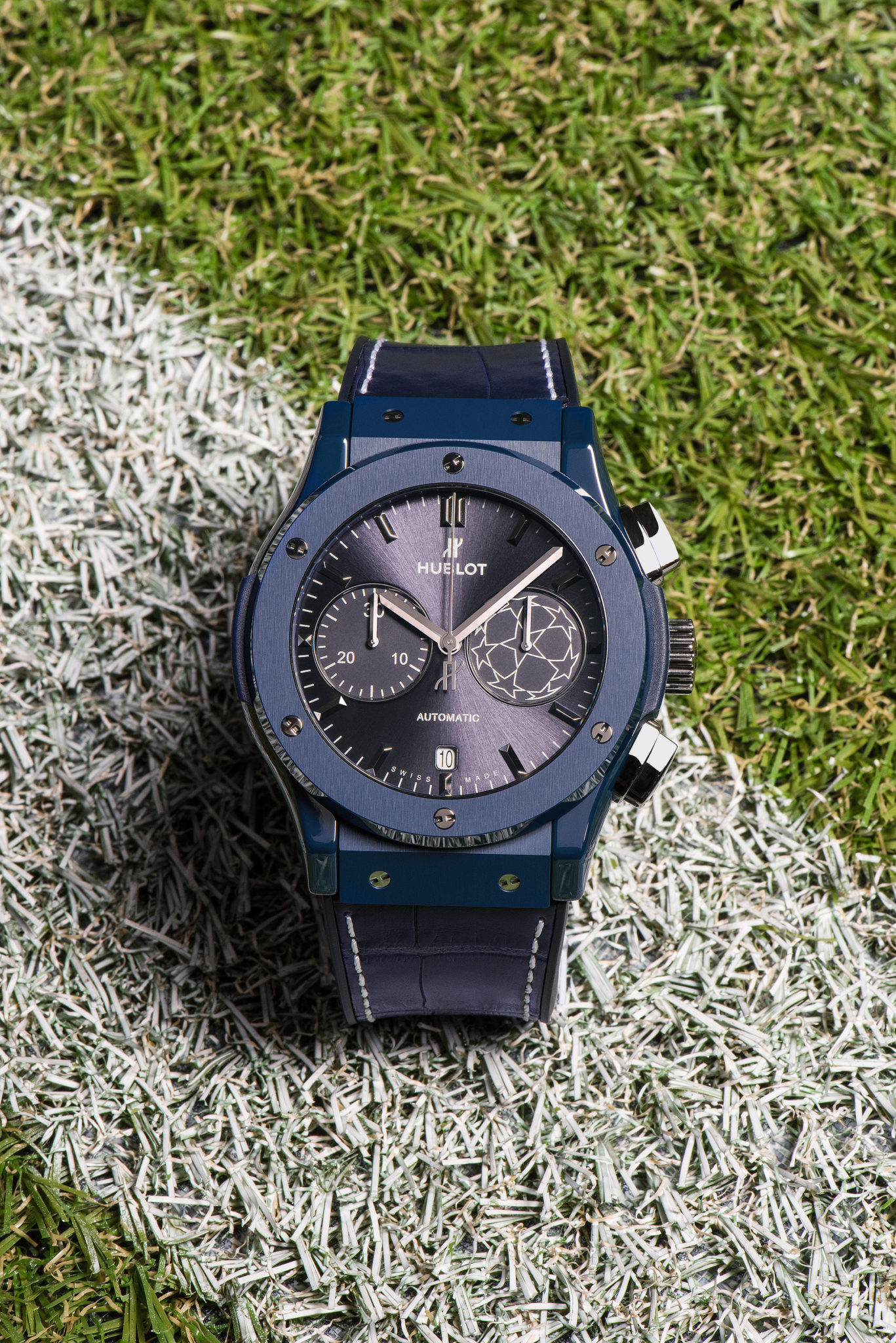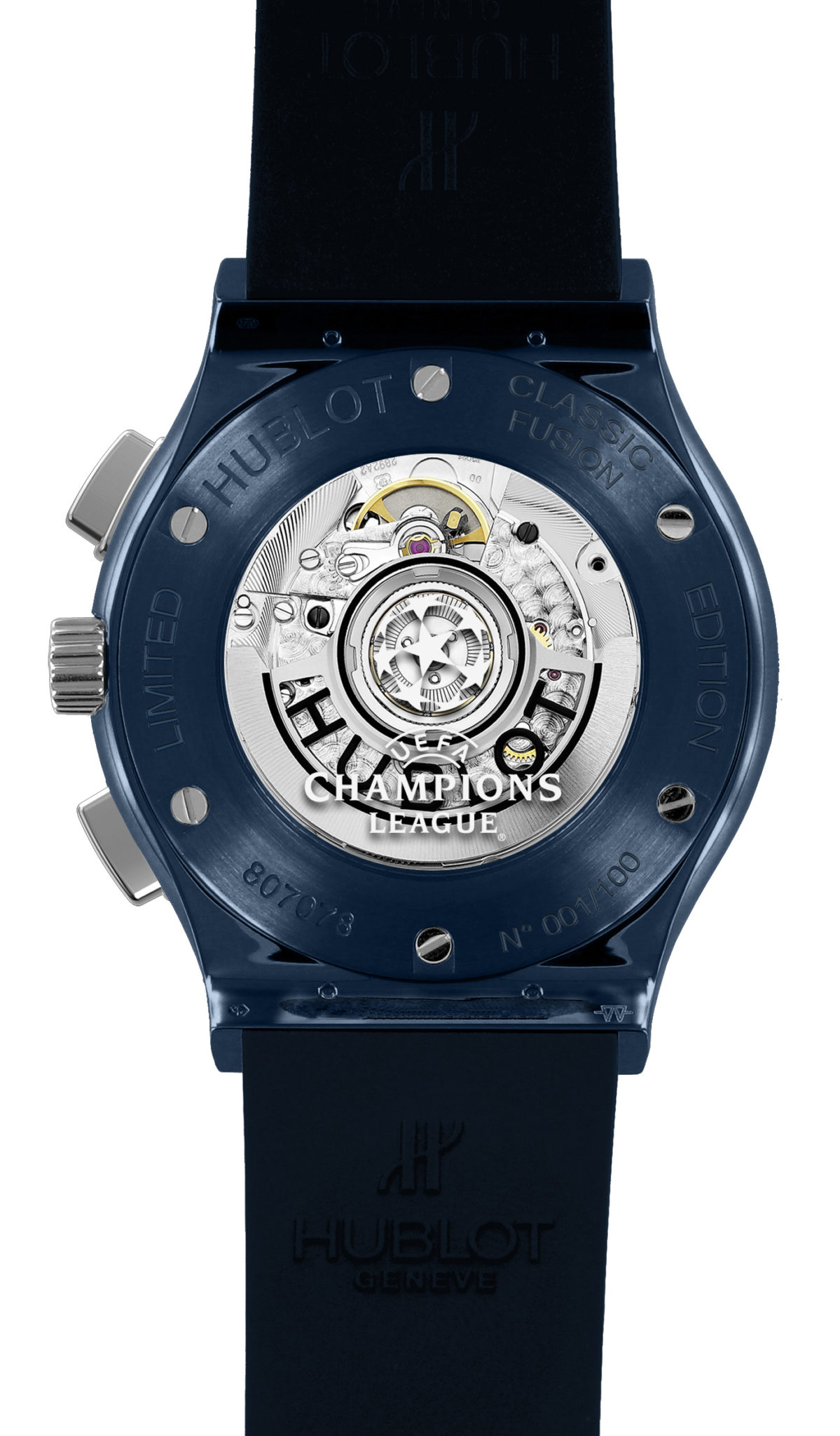 Tout comme les maîtres du Temps étaient vêtus de bleu, Hublot crée une montre entièrement nuancée de la couleur emblématique de la compétition. La Classic Fusion Chronograph UEFA Champions LeagueTM, montre accréditée officielle de la compétition, s’impose dans un boîtier de 45mm de diamètre en céramique bleue polie et satinée. Le cuir de la victoire s’affiche en alligator bleu surpiqué d’une couture blanche. Son cadran soleillé bleu affiche en ton sur ton le mythique Starball et ses 8 étoiles, formant un ballon qui est l’emblème de la compétition. Le fond de la boîte revêt quant à lui le logo de l’UEFA Champions League™.