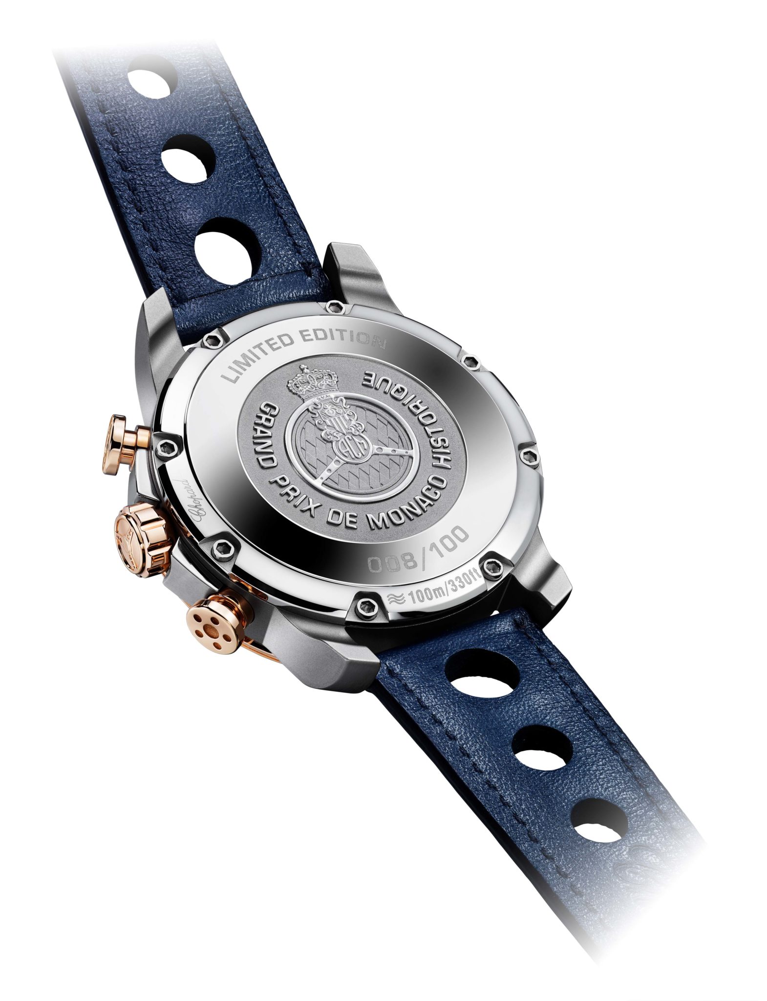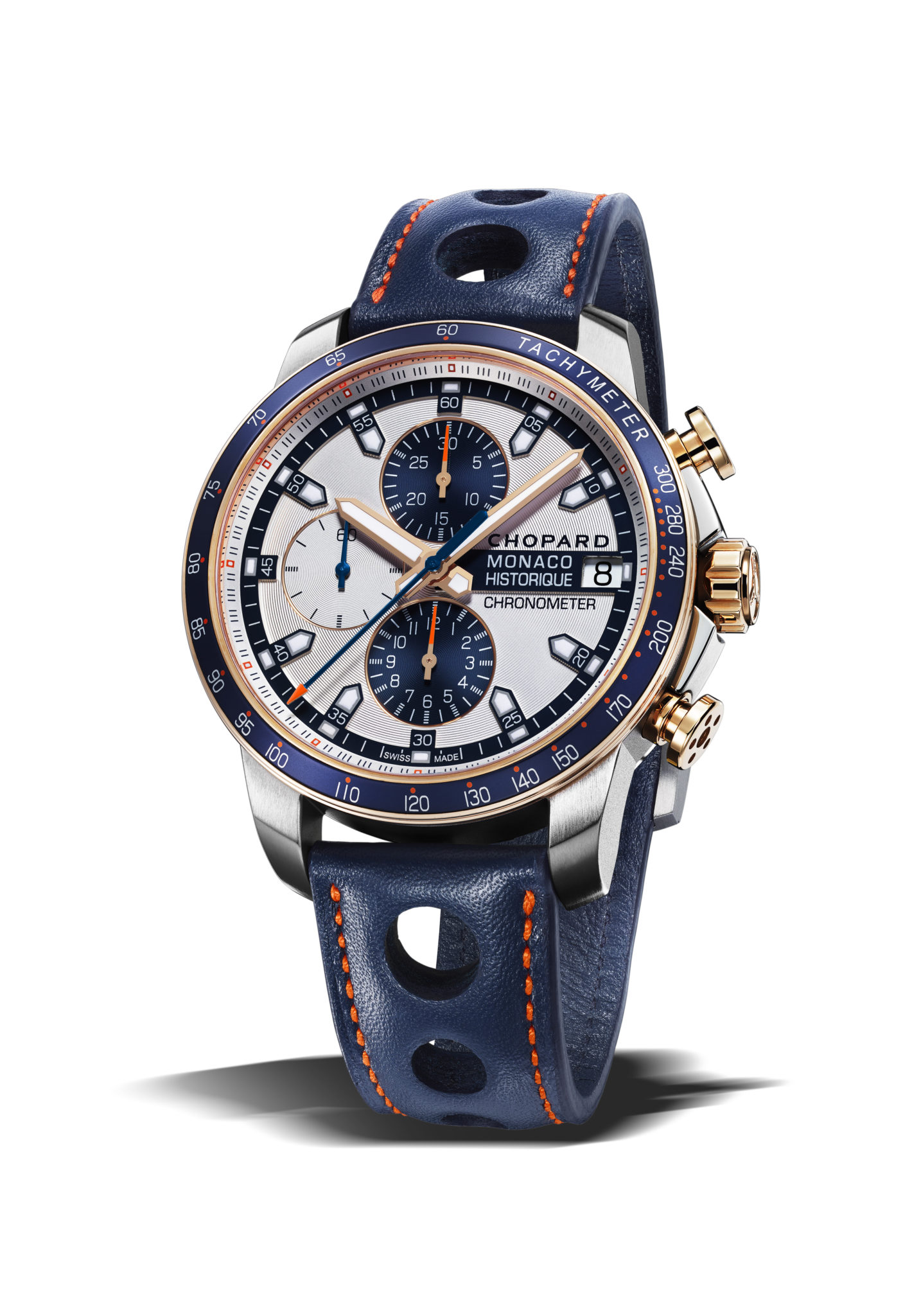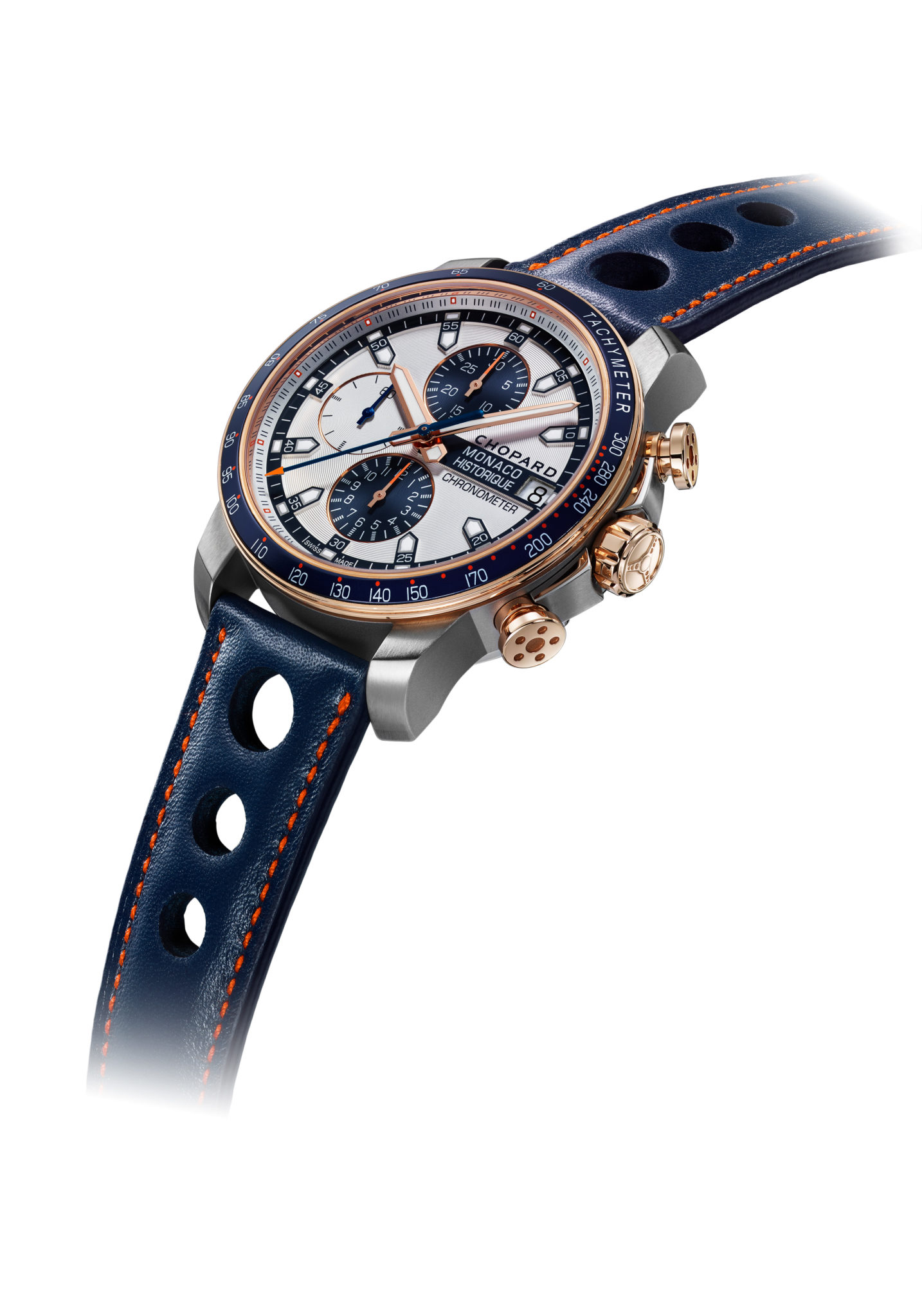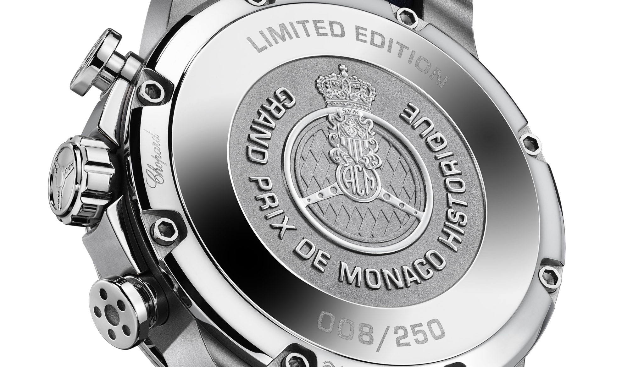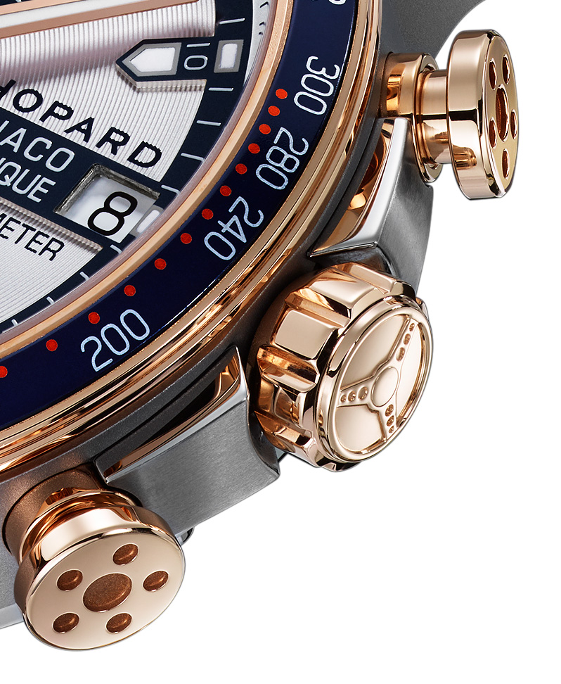 Surmonté de poussoirs en forme de pistons de moteur et d’une lunette bleue avec échelle tachymétrique, idéale pour calculer la vitesse moyenne en course, le boîtier de 44.5 mm de diamètre est muni d’une couronne vissée et d’un fond gravé du logo de l’Automobile Club de Monaco. Ce dernier est fixé avec des vis rappelant les boulons des voitures. Étanche à 100 mètres, il abrite un moteur horloger de haute précision, certifié chronomètre par le Contrôle Officiel Suisse des Chronomètres (COSC), qualité indispensable pour un chronographe Chopard. Ce mouvement mécanique à remontage automatique, pourvu d’une réserve de marche d’environ 46 heures, offre les fonctions heures, minutes, secondes, chronographe et date.