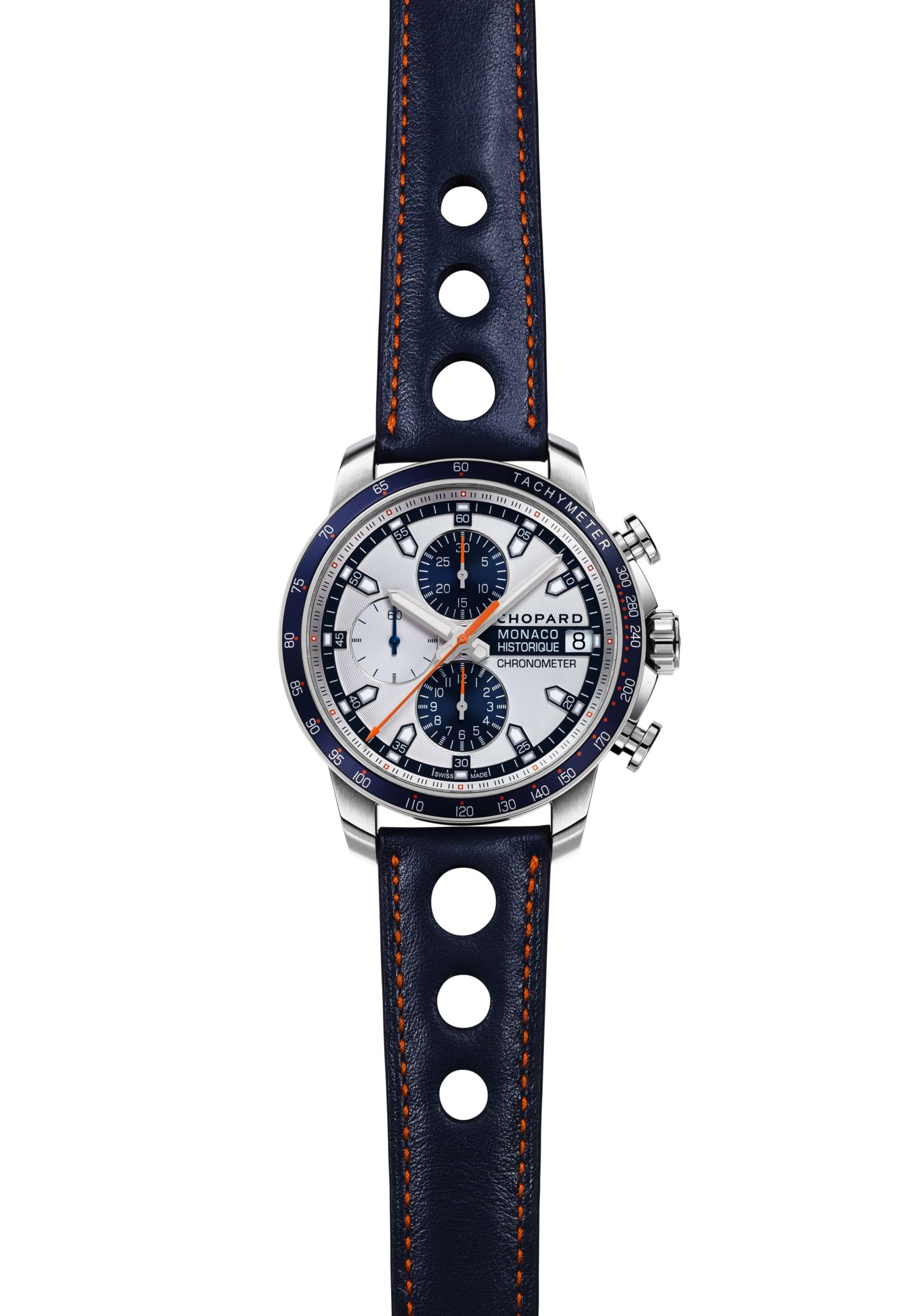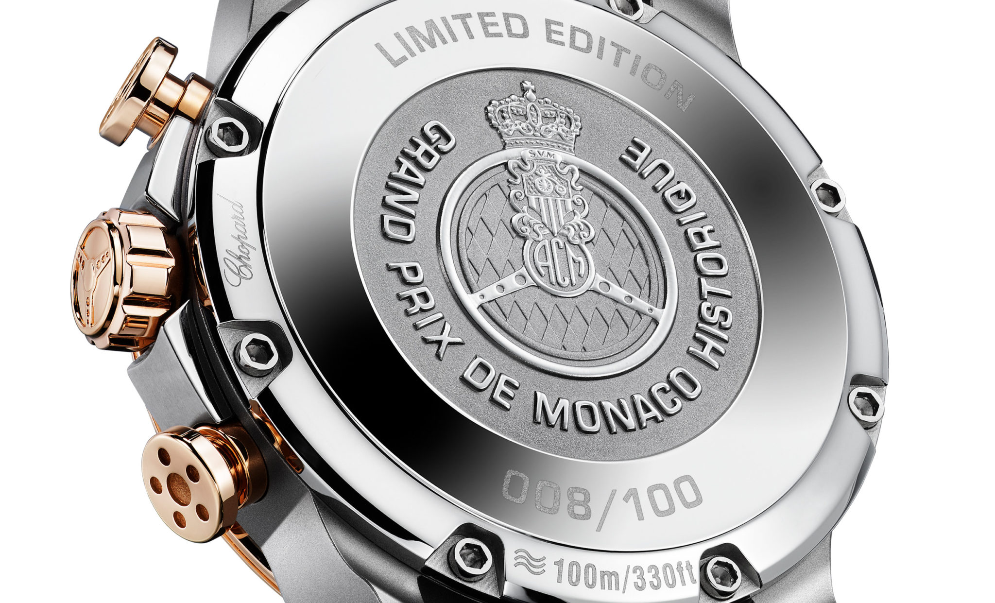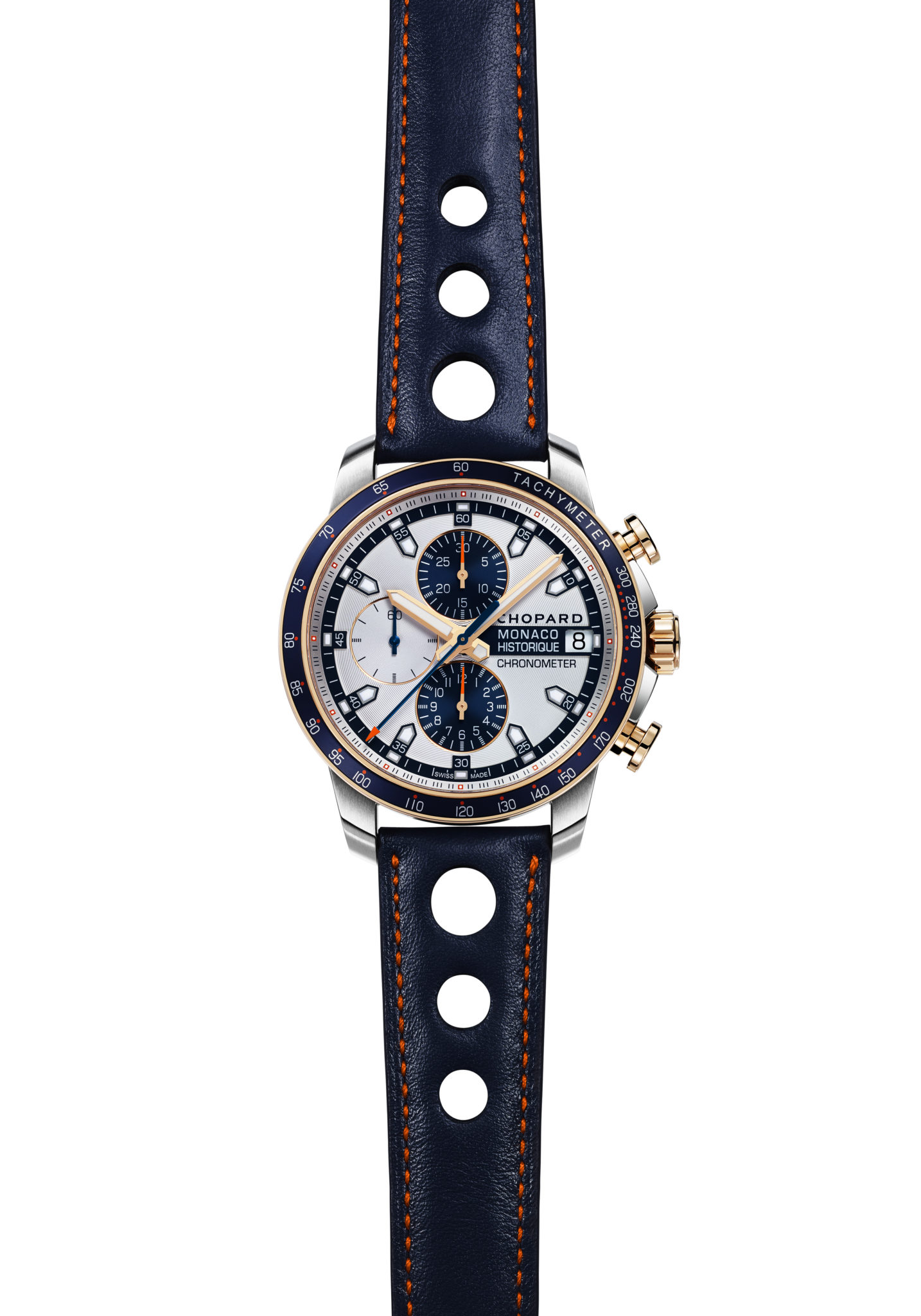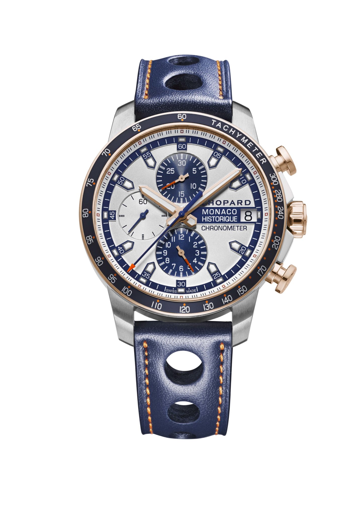 Surmonté de poussoirs en forme de pistons de moteur et d’une lunette bleue avec échelle tachymétrique, idéale pour calculer la vitesse moyenne en course, le boîtier de 44.5 mm de diamètre est muni d’une couronne vissée et d’un fond gravé du logo de l’Automobile Club de Monaco. Ce dernier est fixé avec des vis rappelant les boulons des voitures. Étanche à 100 mètres, il abrite un moteur horloger de haute précision, certifié chronomètre par le Contrôle Officiel Suisse des Chronomètres (COSC), qualité indispensable pour un chronographe Chopard. Ce mouvement mécanique à remontage automatique, pourvu d’une réserve de marche d’environ 46 heures, offre les fonctions heures, minutes, secondes, chronographe et date.