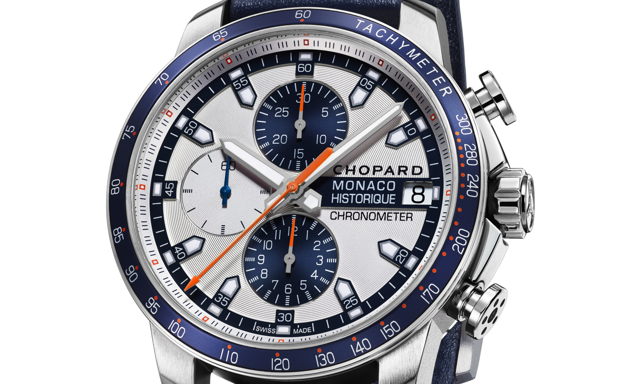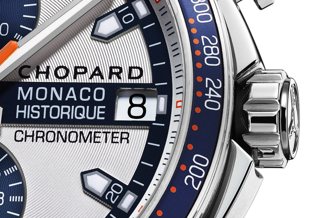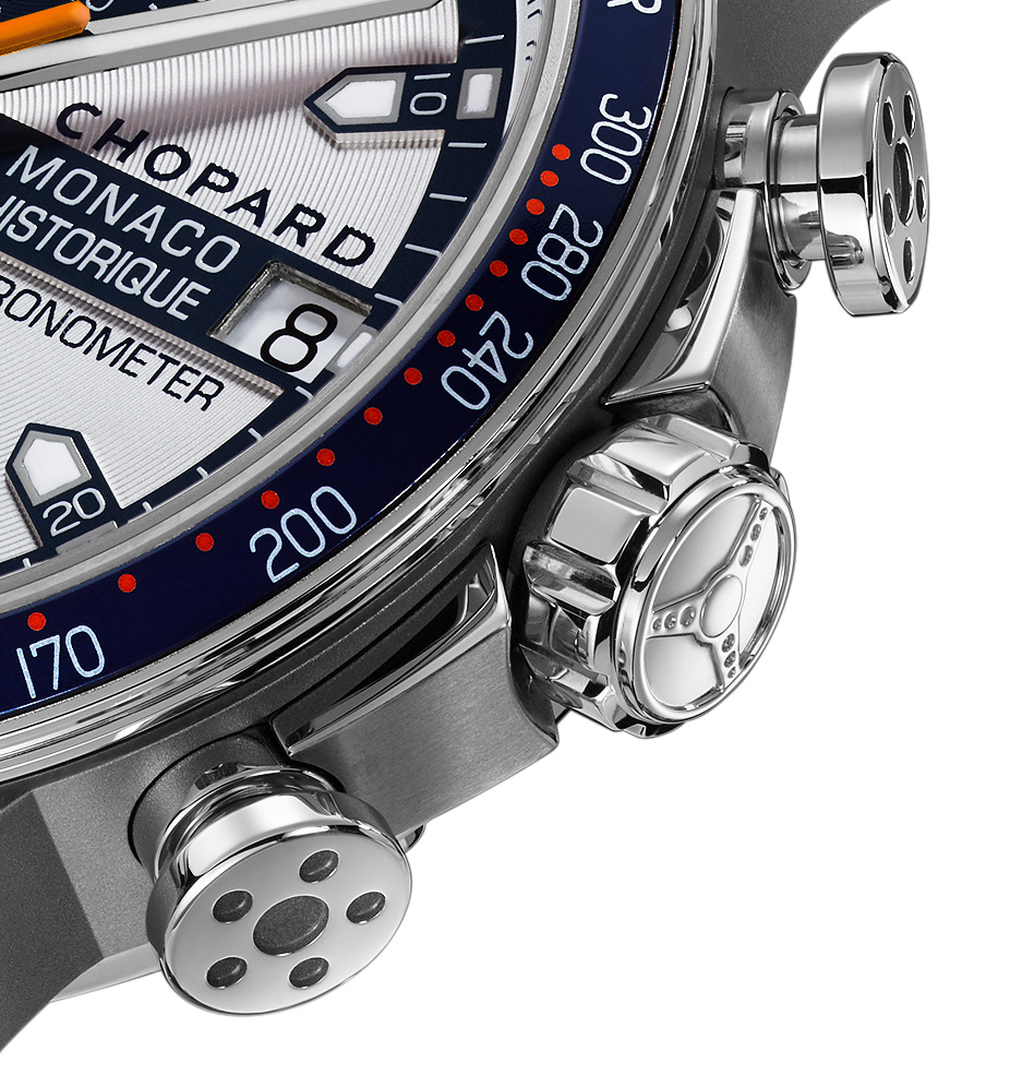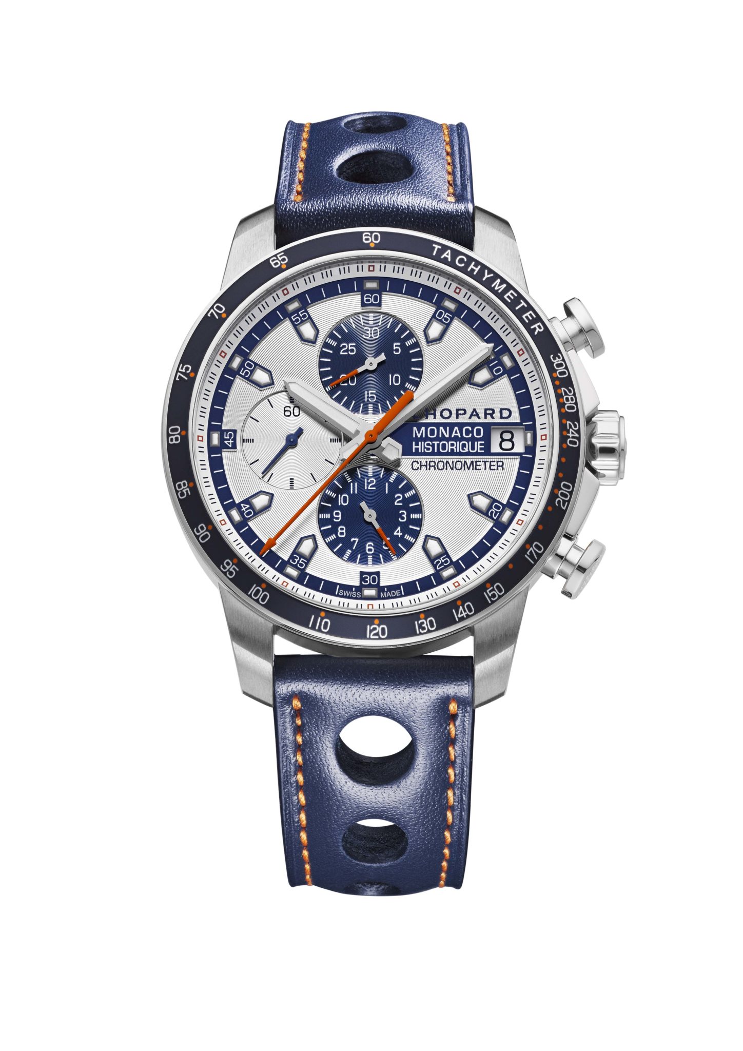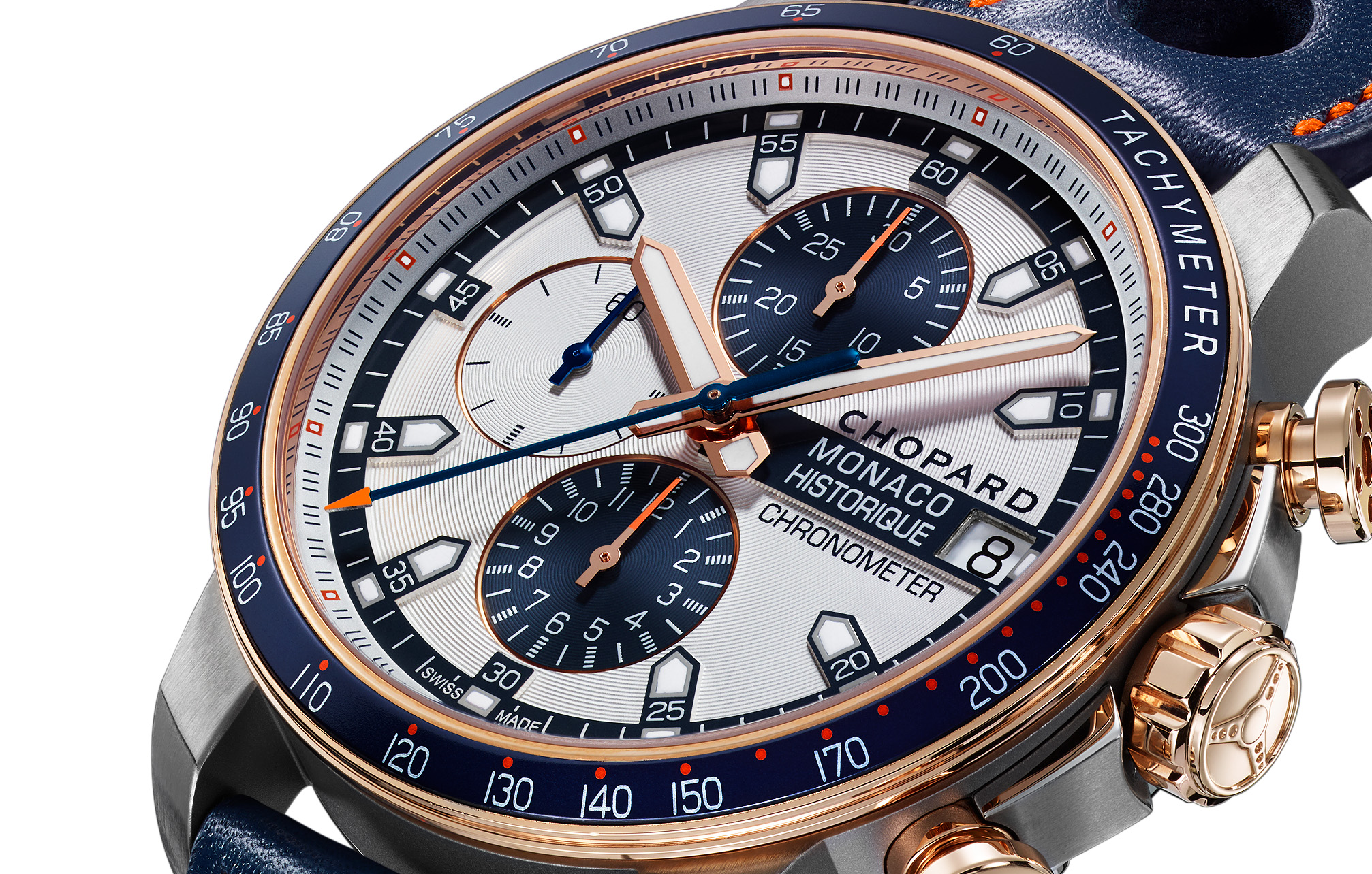 Surmonté de poussoirs en forme de pistons de moteur et d’une lunette bleue avec échelle tachymétrique, idéale pour calculer la vitesse moyenne en course, le boîtier de 44.5 mm de diamètre est muni d’une couronne vissée et d’un fond gravé du logo de l’Automobile Club de Monaco. Ce dernier est fixé avec des vis rappelant les boulons des voitures. Étanche à 100 mètres, il abrite un moteur horloger de haute précision, certifié chronomètre par le Contrôle Officiel Suisse des Chronomètres (COSC), qualité indispensable pour un chronographe Chopard. Ce mouvement mécanique à remontage automatique, pourvu d’une réserve de marche d’environ 46 heures, offre les fonctions heures, minutes, secondes, chronographe et date.