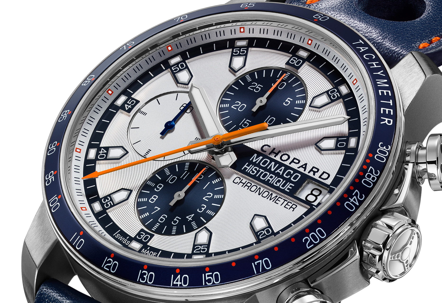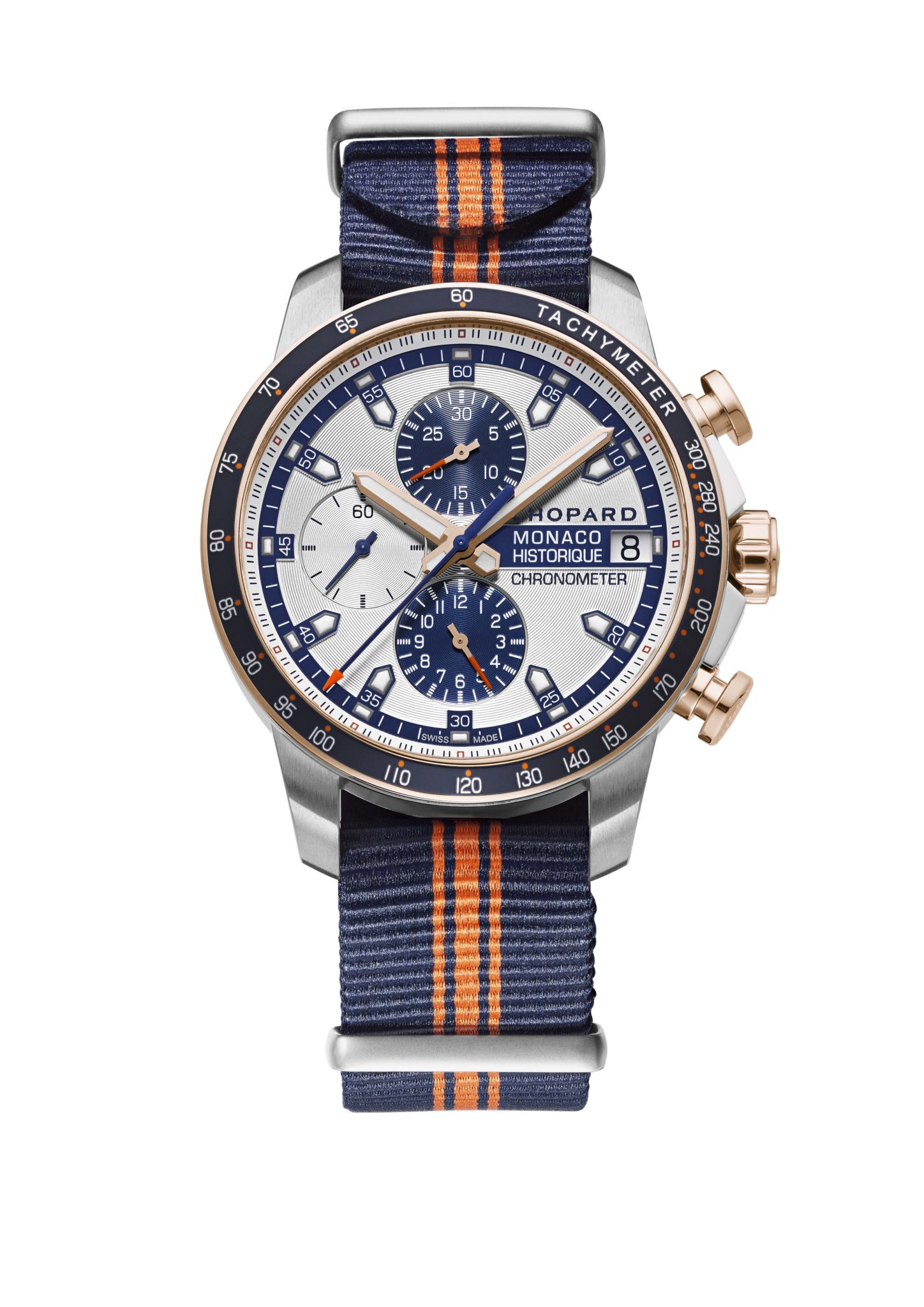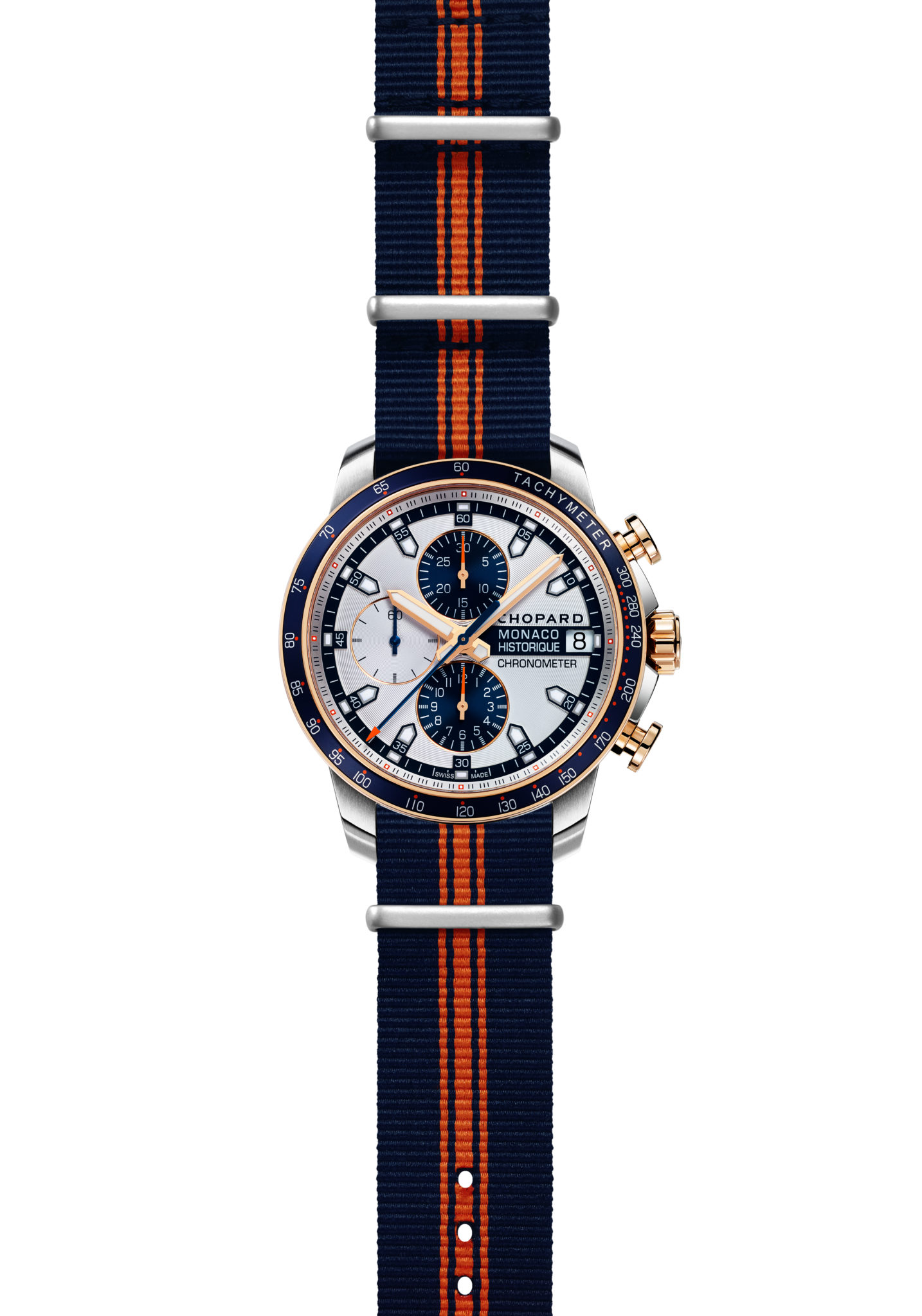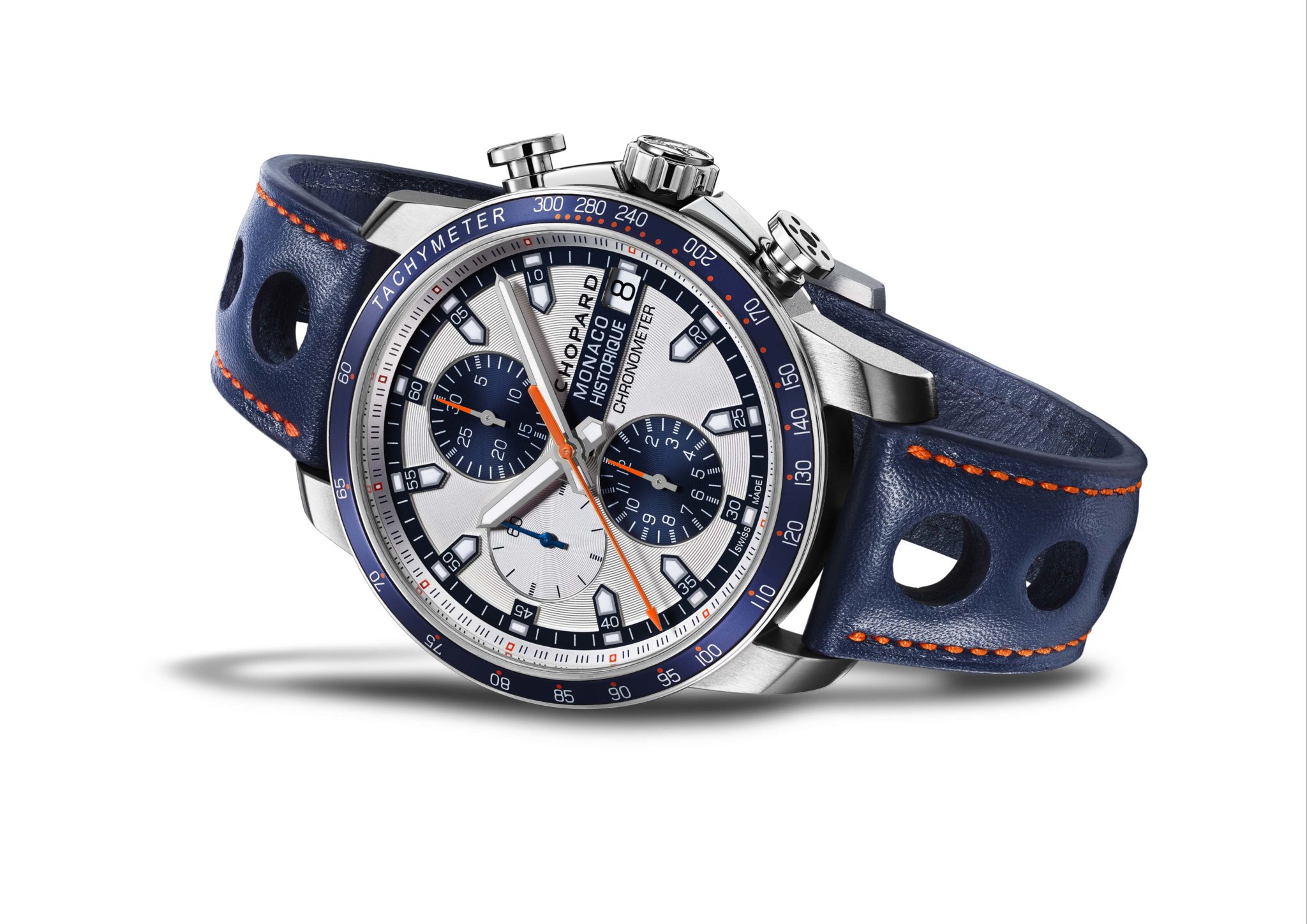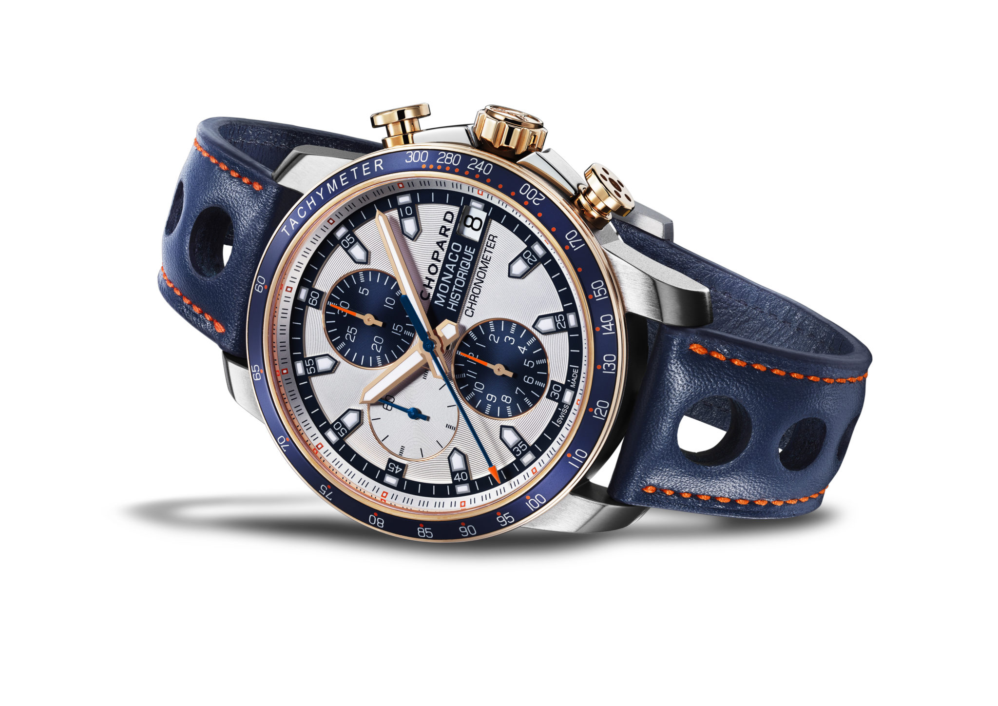 Surmonté de poussoirs en forme de pistons de moteur et d’une lunette bleue avec échelle tachymétrique, idéale pour calculer la vitesse moyenne en course, le boîtier de 44.5 mm de diamètre est muni d’une couronne vissée et d’un fond gravé du logo de l’Automobile Club de Monaco. Ce dernier est fixé avec des vis rappelant les boulons des voitures. Étanche à 100 mètres, il abrite un moteur horloger de haute précision, certifié chronomètre par le Contrôle Officiel Suisse des Chronomètres (COSC), qualité indispensable pour un chronographe Chopard. Ce mouvement mécanique à remontage automatique, pourvu d’une réserve de marche d’environ 46 heures, offre les fonctions heures, minutes, secondes, chronographe et date.
