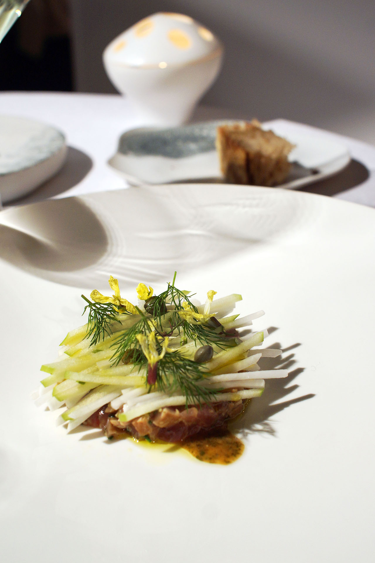 tataki de thon rouge, vinaigrette au raifort, navet Kabu
