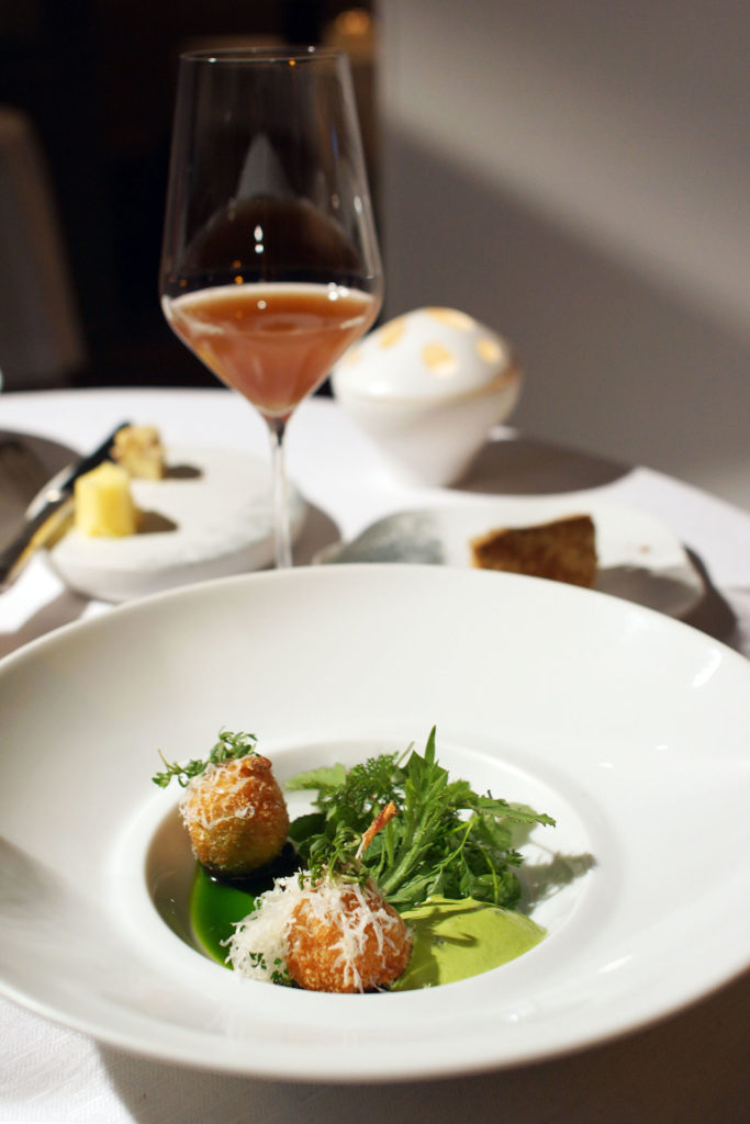 cuisses de grenouilles pannées, sabayon de ciboulette, condiment d’ail noir et risotto cresson