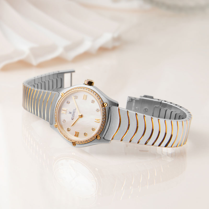 Osez la délicatesse avec la nouvelle EBEL Sport Classic 24mm Incarnation par excellence de la marque, ce modèle bicolore orné de diamants nous offre une réinterprétation particulièrement glamour de la légendaire Sport Classic d’EBEL. Il s’inscrit dans une tendance résolument féminine de dimension plus petite, faisant désormais fureur dans le monde de l’horlogerie pour femmes. Reconnue comme une alliance parfaite entre la haute technicité et une élégance distinctive intemporelle, la re-commercialisation en 2018 de la révolutionnaire EBEL Sport Classic marque le retour d’un modèle historique. À la fois sensuelle et raffinée, la nouvelle EBEL Sport Classic mini est un chef-d’œuvre d’élégance féminine conçue pour ravir les amateurs du rétro chic les plus avisés. Le lancement de la ligne Sport Classic en 1977, avec son bracelet à maillons vague emblématique et son boîtier intégré, a marqué le début de la catégorie « sport chic ». Illustration parfaite de la philosophie prônée par EBEL « la beauté s’unit à la fonctionnalité », cette collection unique a défini l’identité de la marque ainsi que suscité une fascination constante pour ses montres en acier bicolore et en or. Fidèle à cet héritage, et laissant les modèles de type « boyfriend » au passé, le boîtier a été réduit à 24 mm. Il est composé d’un acier inoxydable brossé et d’or de 18 carats, ainsi que d’une lunette sertie de diamants, qui enchâsse un cadran blanc nacré scintillant orné d’index en diamant. Les maillons fuselés et la surface plane de l’emblématique bracelet à maillons vague ont été conservés en hommage au modèle Sport Classic d’origine et à sa légendaire souplesse. En revanche, la forme des vagues est travaillée avec plus d’élégance. Étanche jusqu’à 50 mètres, la nouvelle EBEL Sport Classic mini, à travers son design unique, ses lignes séduisantes et un sens esthétique irréprochable, consacre le raffinement discret.