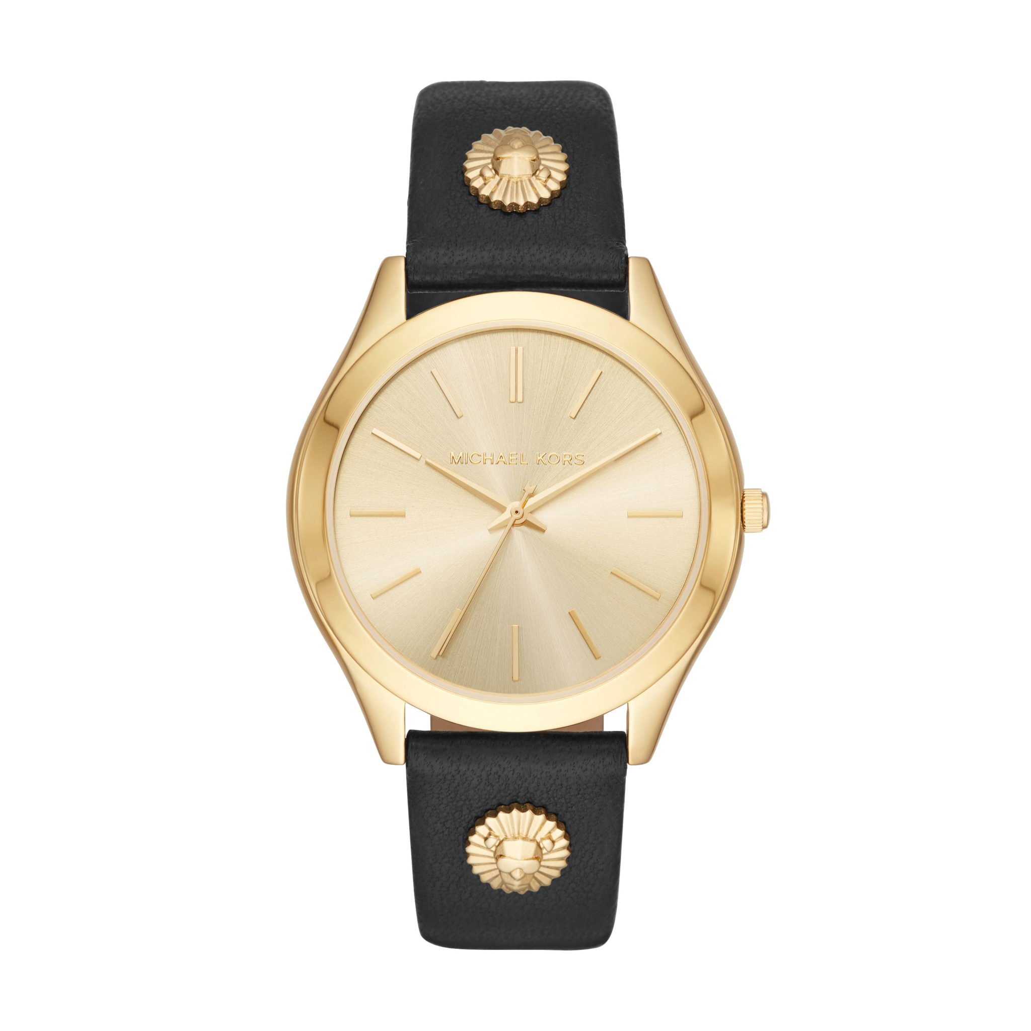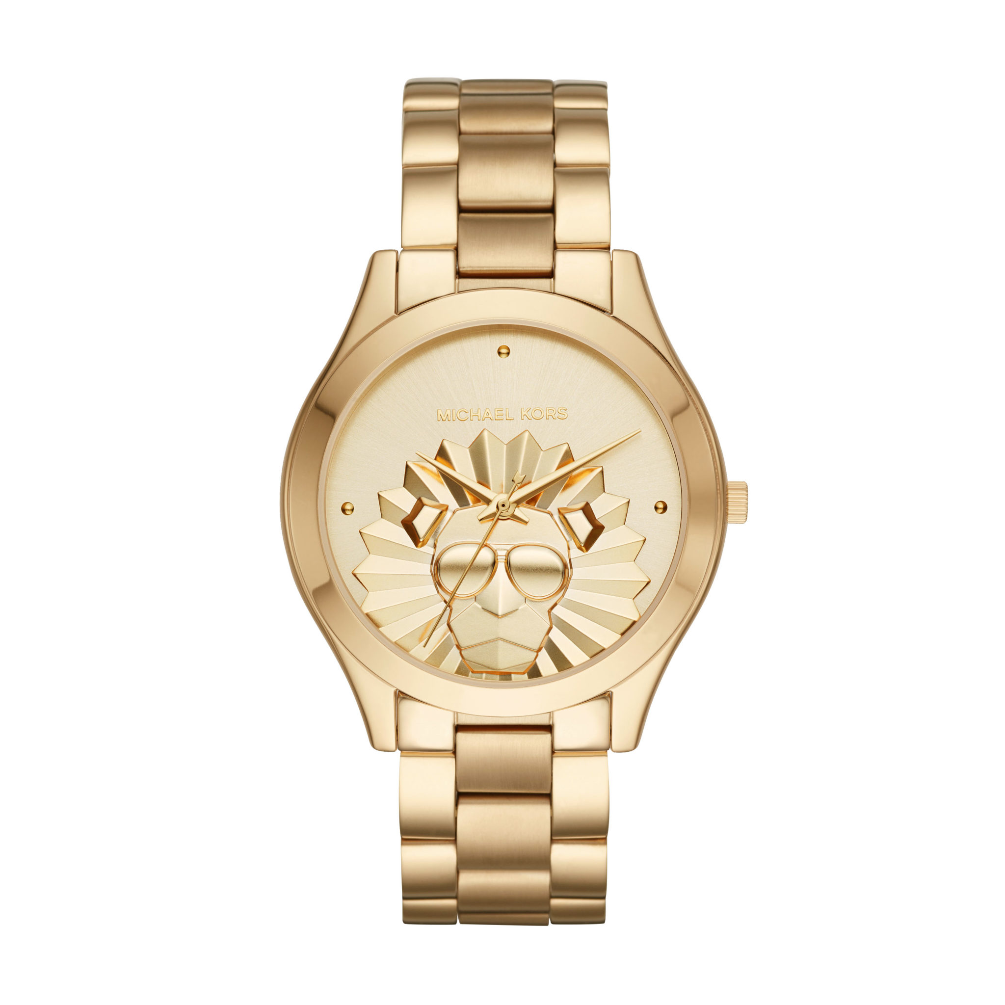 La montre Slim Runway apporte une touche féline à vos tenues d’été. Le premier modèle présente un élégant boîtier doré accueillant un cadran ton sur ton minimaliste ainsi qu’un bracelet en cuir noir orné d’un lion doré de chaque côté. Le second modèle Slim Runway présente un cadran doré orné d’un lion royal qui porte les lunettes de soleil de Michael.